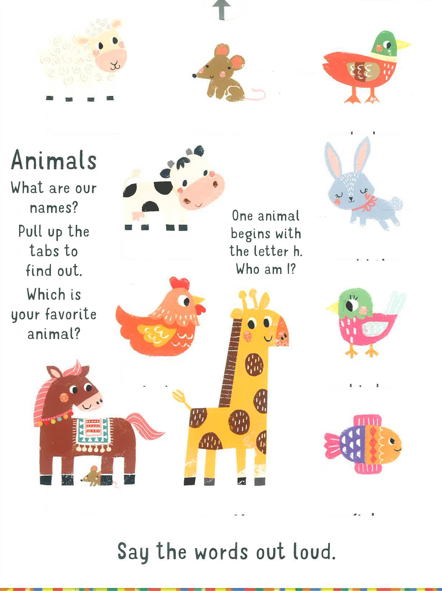 With multiple tabs to pull and flaps to lift, countless surprises await young learners in My First Slide and Seek: 100 Words. Each page of this larger format board book contains a single pull tab that reveals a new word for your young one's growing vocabulary! Colorful artwork brings the pages to life in entertaining and educational ways. Lift-the-flaps add an extra level of engagement to this book that helps pre-readers at the earliest stages of development.