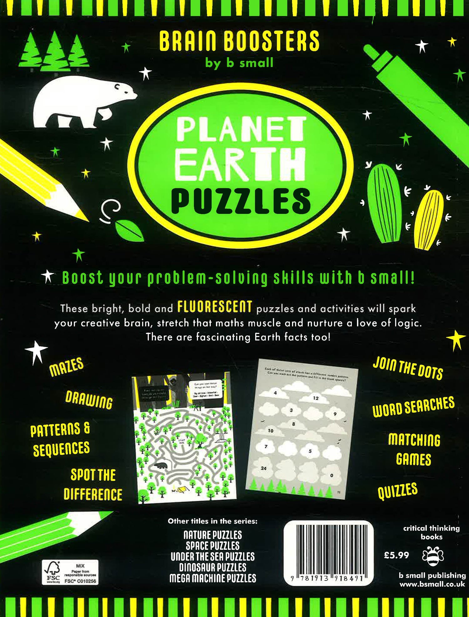 Boost problem-solving skills! These bold, FLUORESCENT puzzles and activities will spark your creative brain, stretch that maths muscle and nurture a love of logic. There are fascinating Earth and geography facts too! Contains mazes, pattern sequences, maths problems, join the dots, word searches, quizzes, spot the difference and much more.