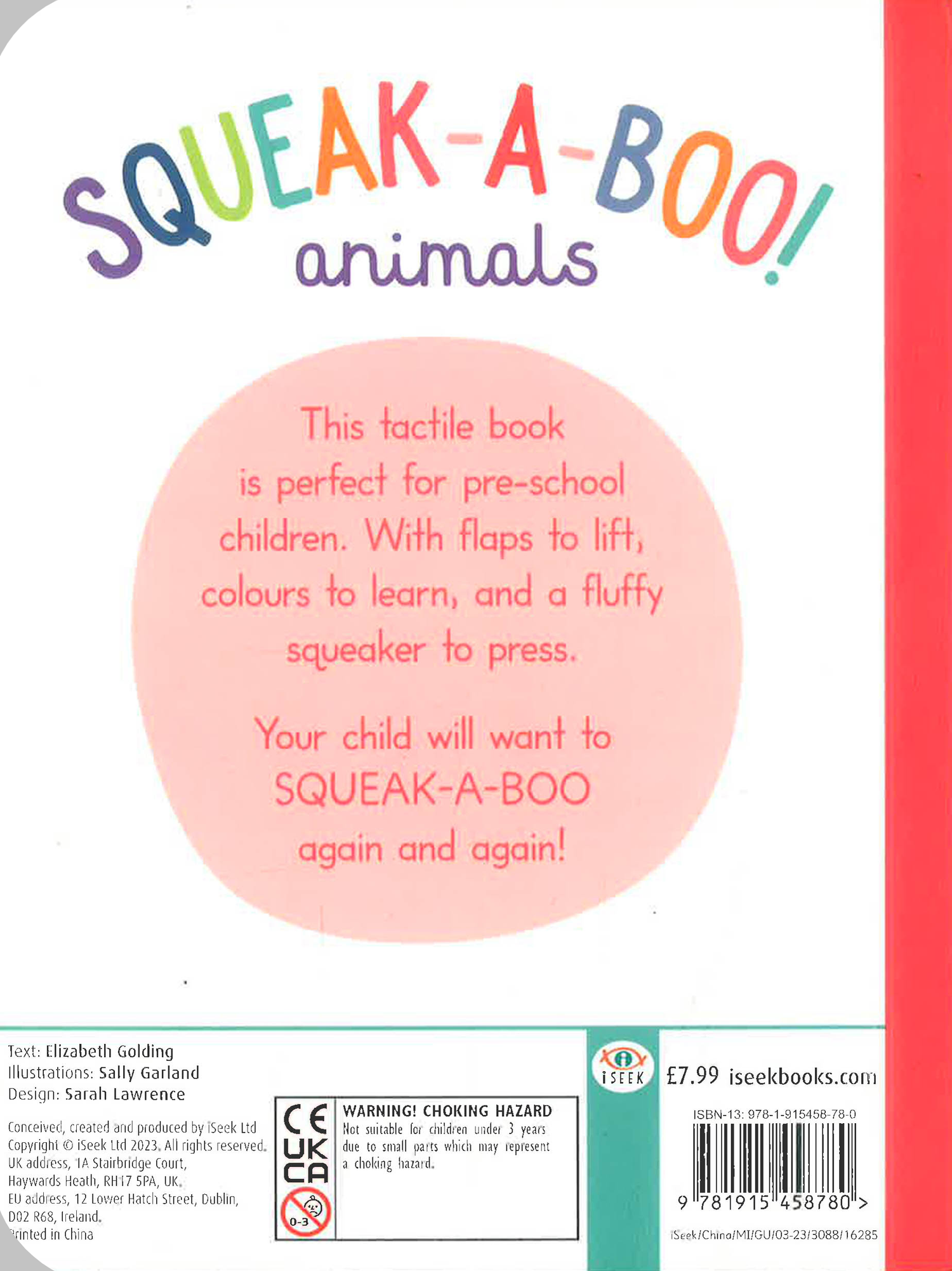 This board book offers a great way for toddlers and pre-school children to develop language and hand-eye coordination. Children can learn colours and animals, whilst having great fun lifting flaps and pressing a soft, plush-covered squeaker. Young readers are encouraged to interact with what they see on the pages.