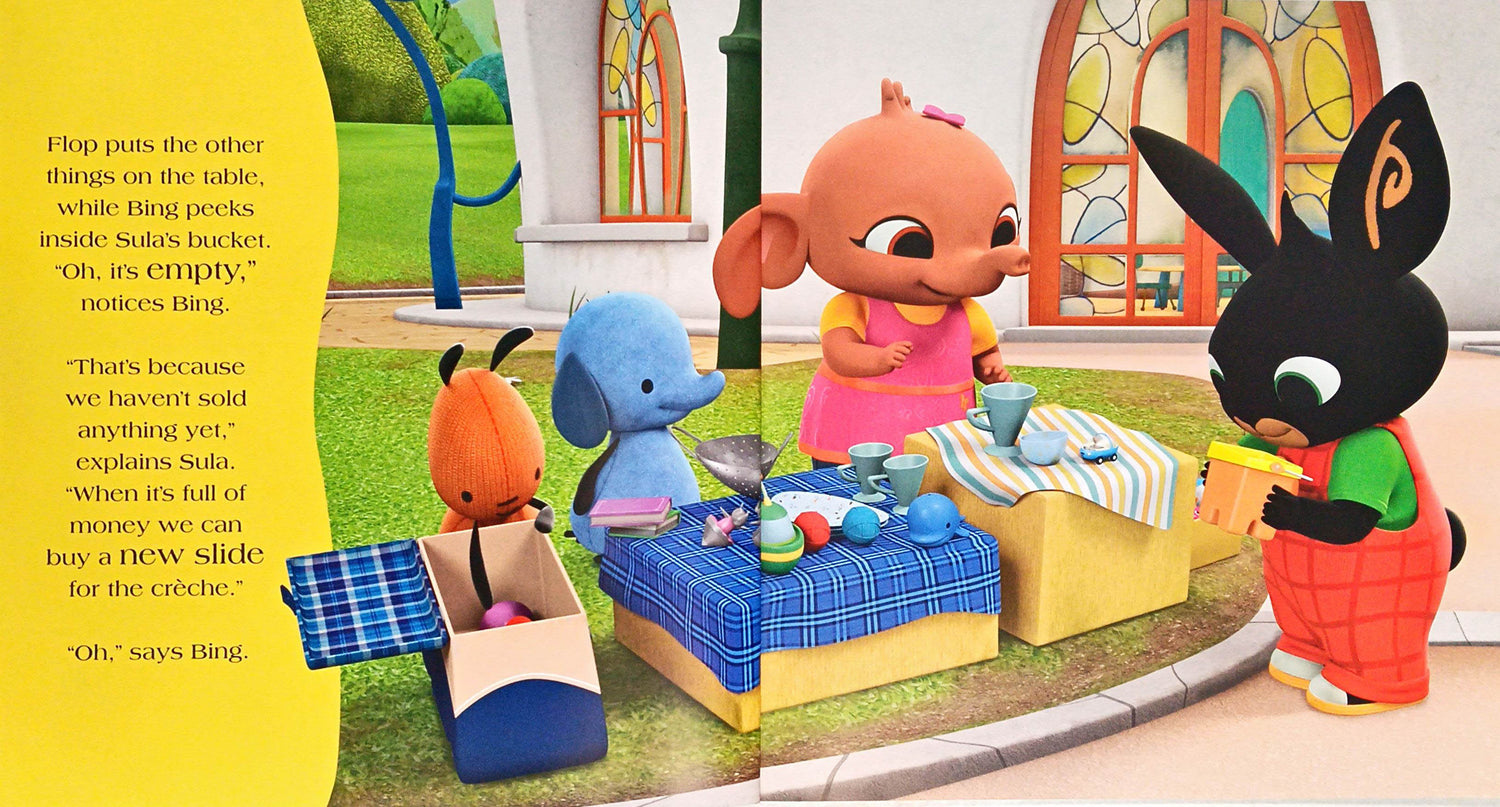 Round the corner, not far away, Bing and Sula are being shopkeepers today! They are holding a yard sale to raise money for a new slide for the creche. But are they really happy to say goodbye to their old toys?