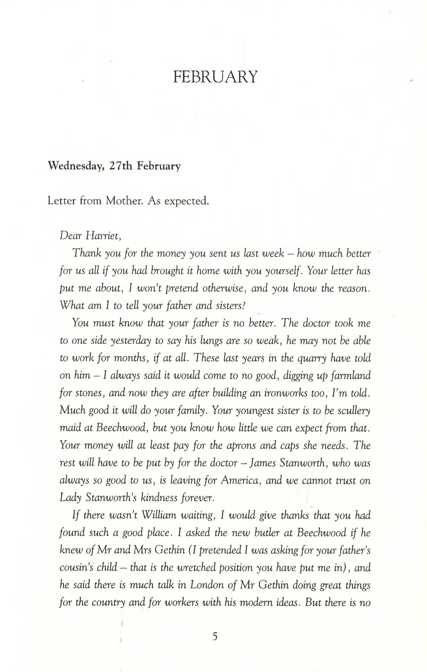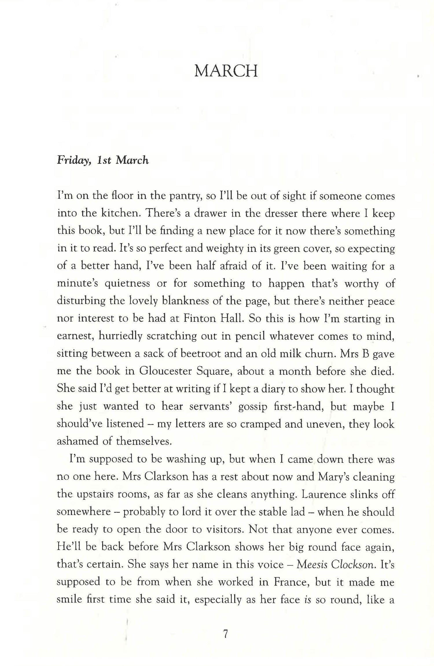 Four months earlier. Harriet is a young maid newly employed at Finton Hall. Fleeing the drudgery of an unwanted engagement in the small village where she grew up, Harriet is entranced by the grand country hall; she is entranced too by her glamorous mistress Clara Gethin, whose unearthly singing voice floats through the house. But Clara, though captivating, is erratic. The master of the house is a much-lauded politician, but he is strangely absent. And some of their beautiful belongings seem to tell terrible stories.