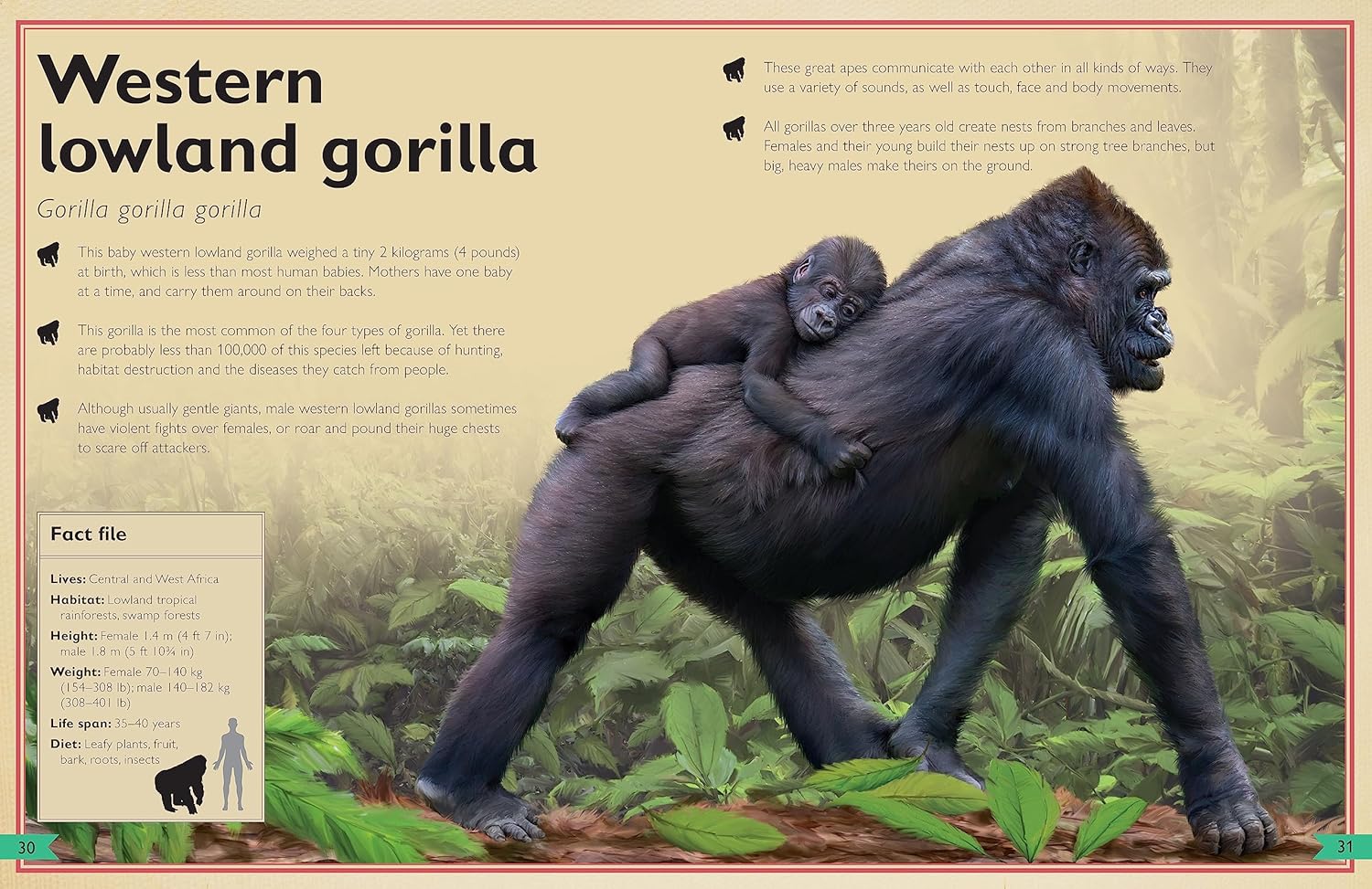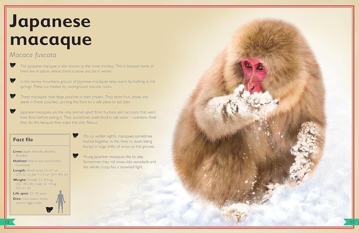 Get up close to extraordinary monkeys and amazing apes. Take a journey through lush rainforests, across grassy plains and up snowy mountains to find thirty-six magnificent monkeys and apes, from the tiny pygmy marmoset to the huge Western lowland gorilla. Intriguing facts accompany every illustration, so you can find out why the Japanese macaque washes its food, how the orangutan makes tools and why gibbons sing duets. Discover all these facts and more in this wonderful compendium that you will revisit again and again.