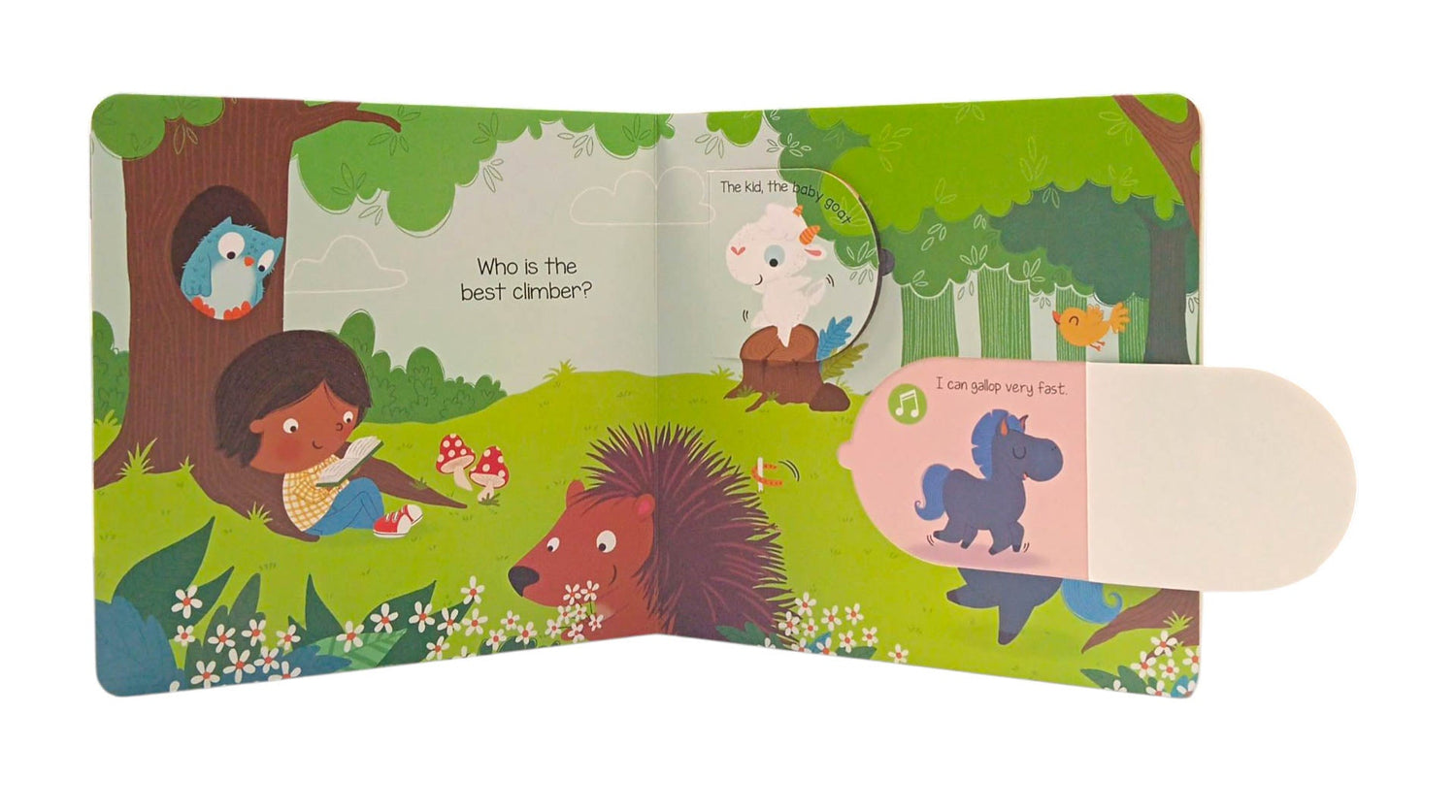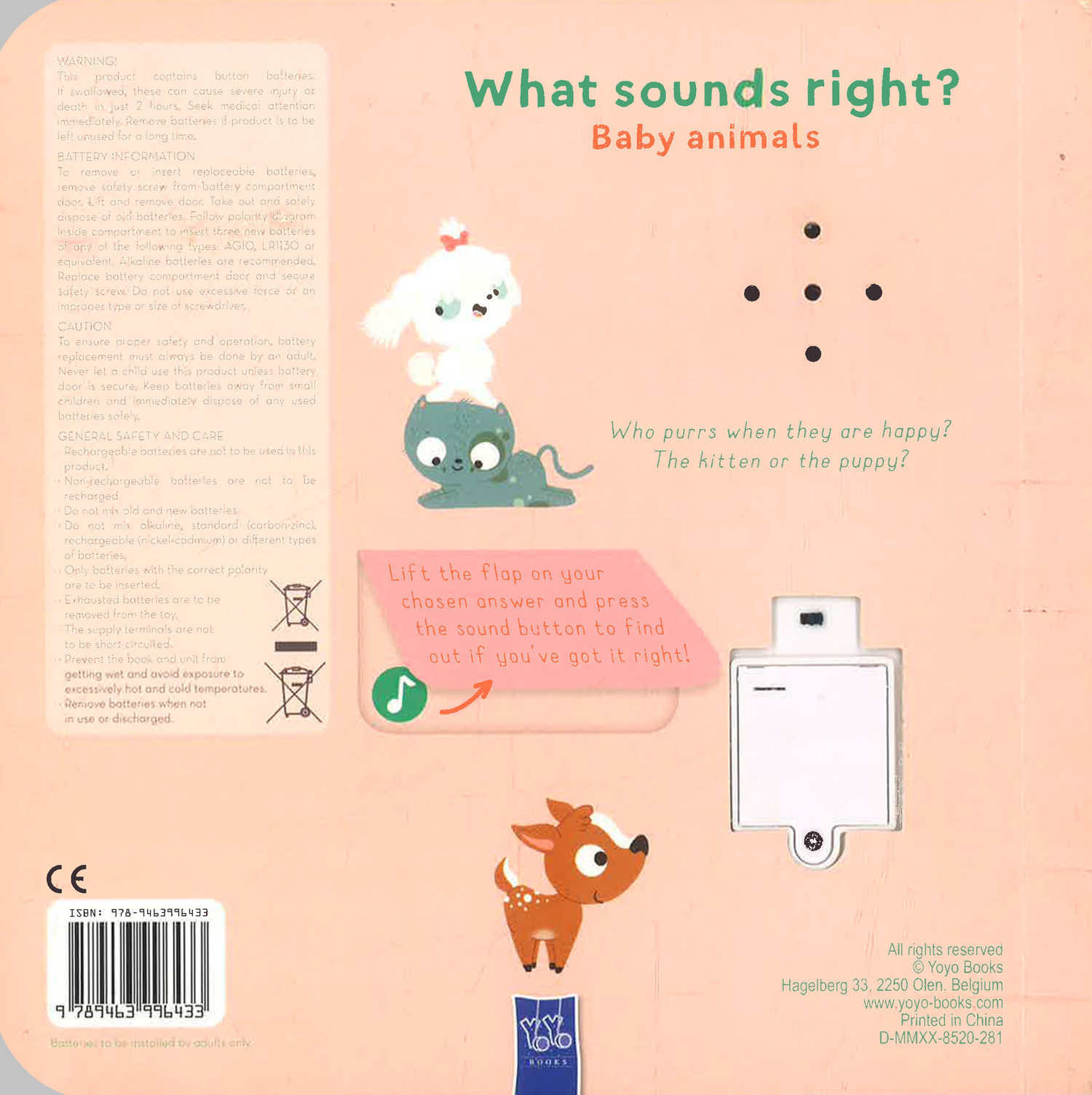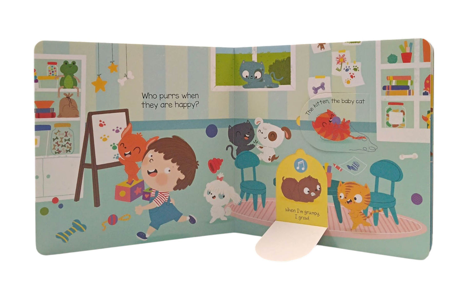 Little ones will love their first quiz book and will enjoy answering questions like, "Who catches mice at home?" or "Who produces fresh milk on the farm?" By lifting the cover that matches their answer, a sound button will help them discover if they're correct! If the answer is correct, readers will hear the animal. If they answer incorrectly, they'll hear a bell. A fun and easy way to get to know the cutest animals!