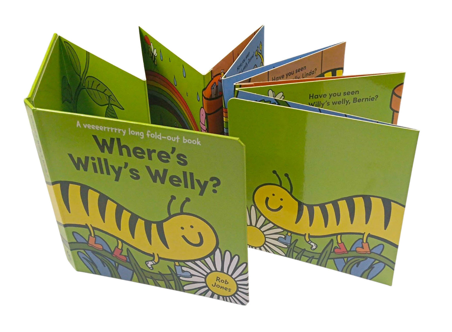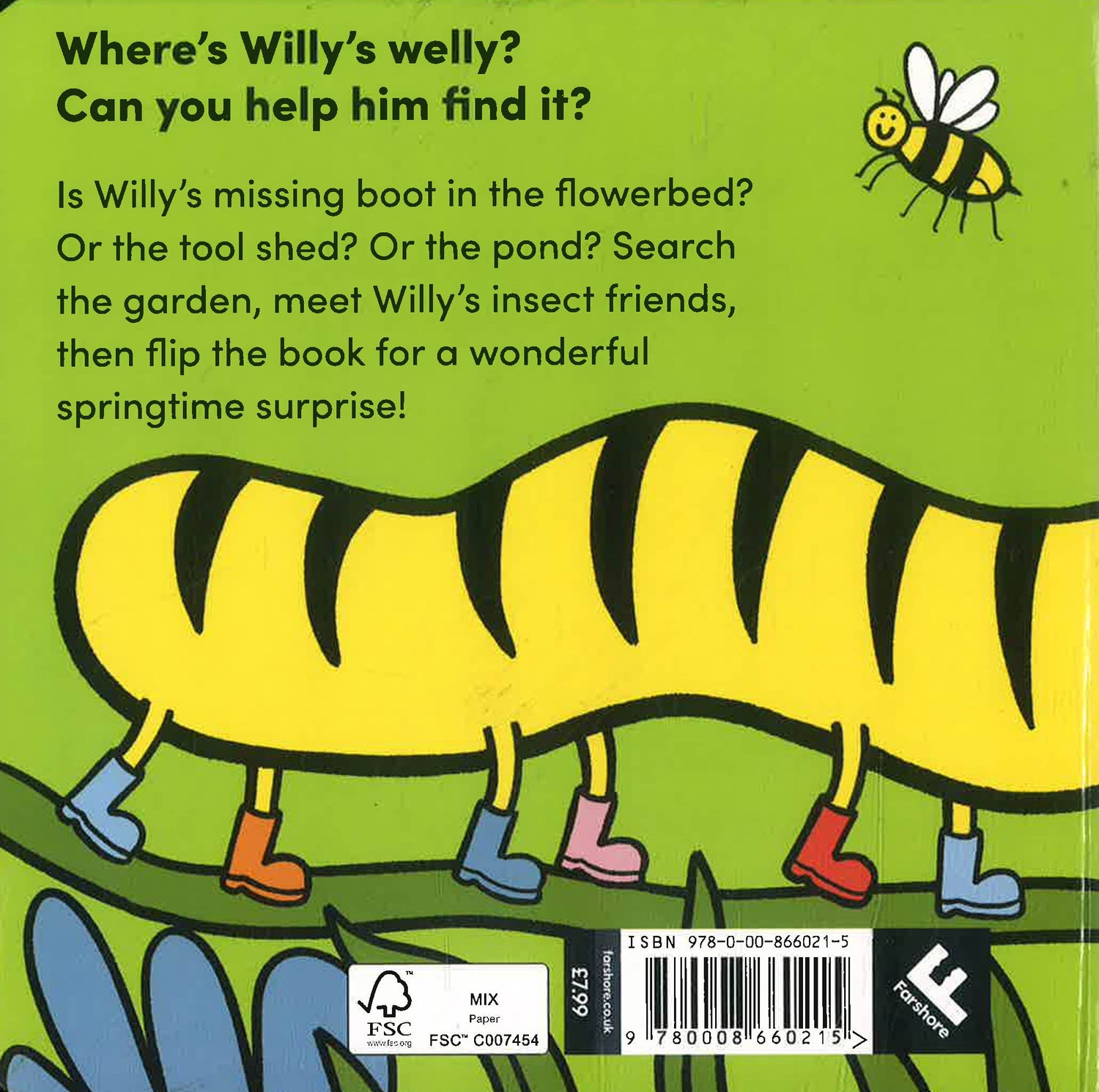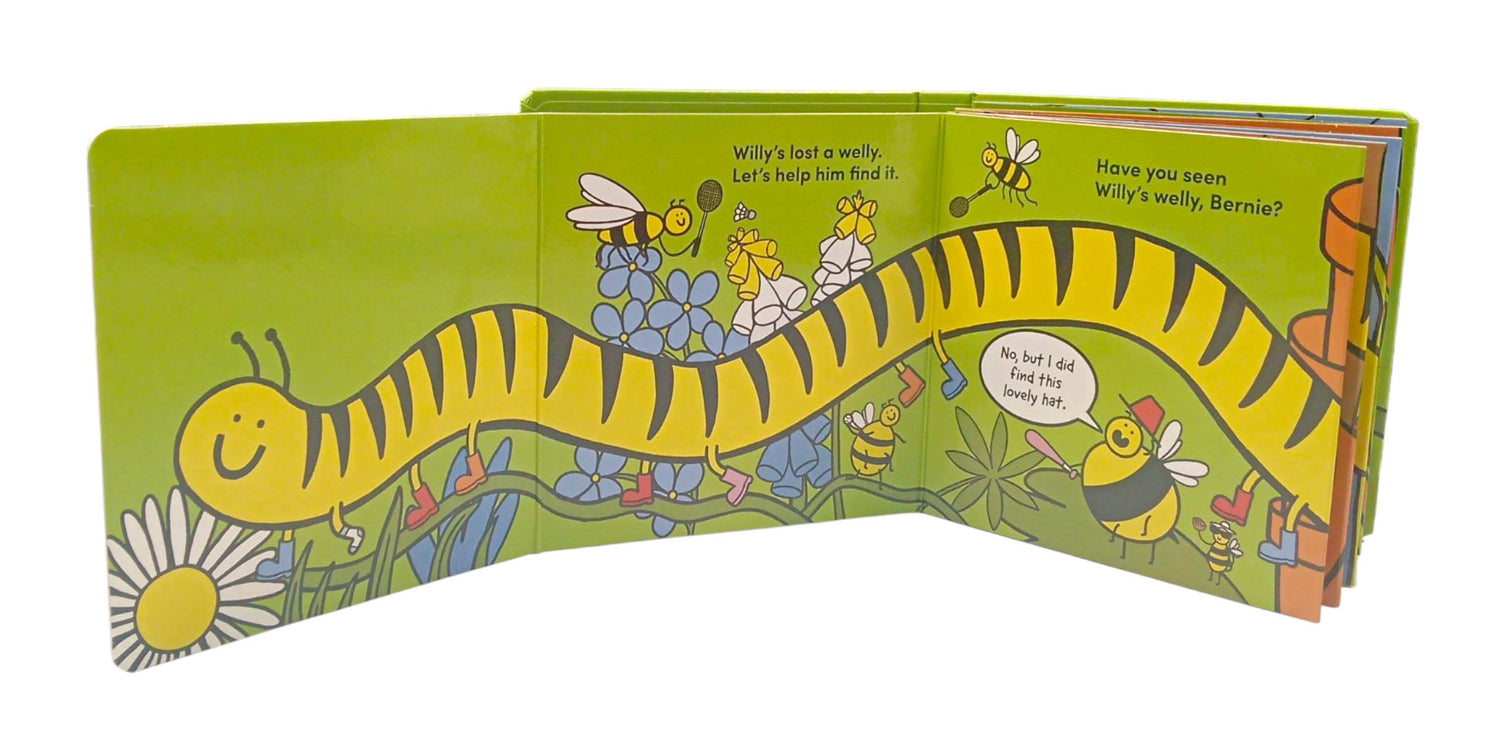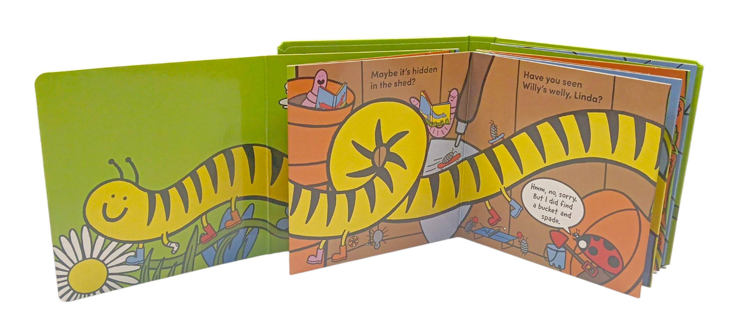 Have Willy’s insect friends seen it? Is it hidden in the flowerbed? Or the tool shed? The vegetable patch? Or the pond? Unfold the veeerry looooonnnng concertina book to find out . . .