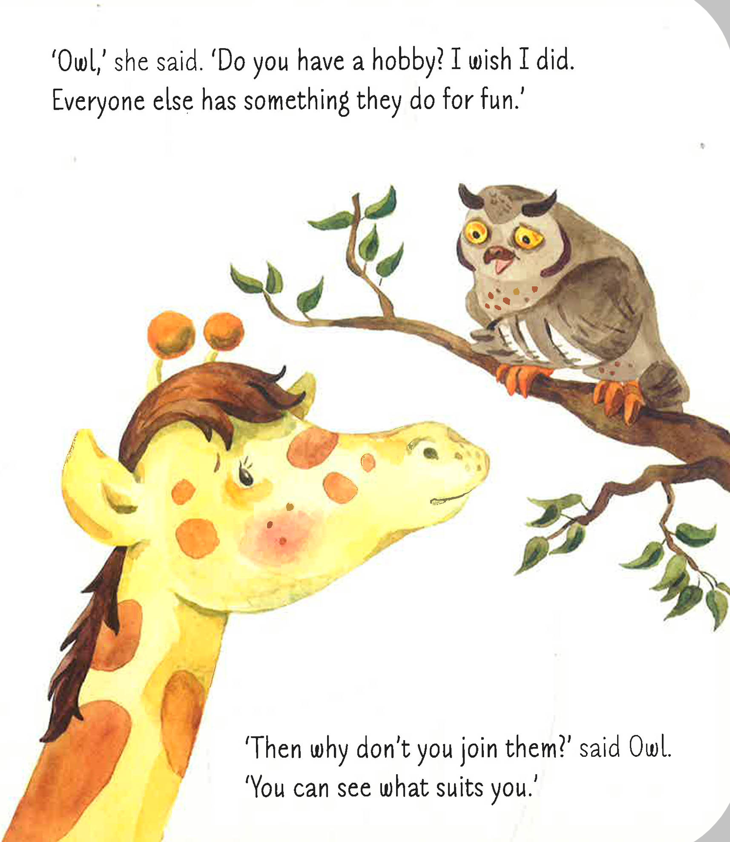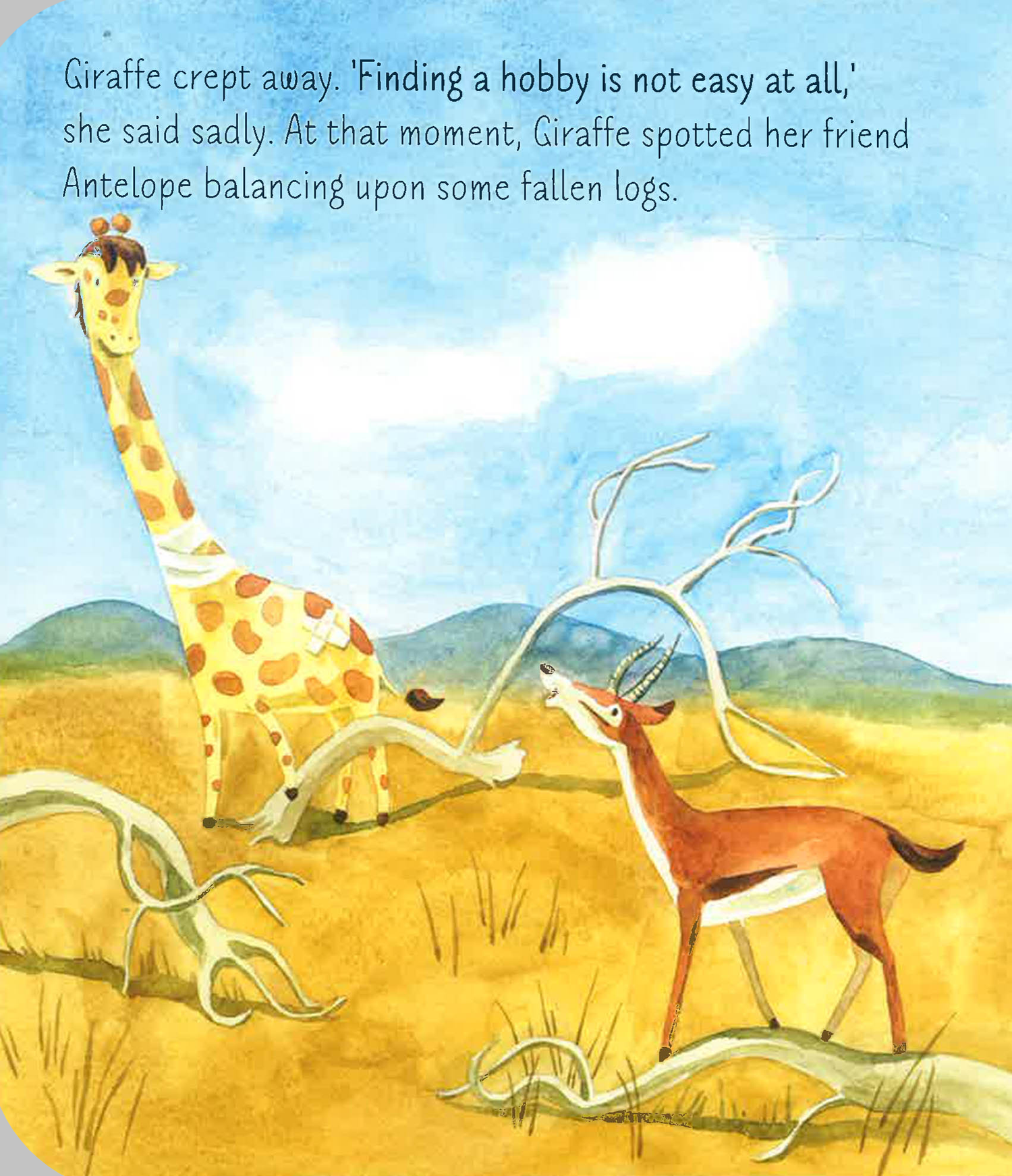 All of Giraffe's friends are good at something: Hippo is a brilliant ballerina, Ostrich is a sensational skater and Lion is a dazzling dancer. Poor Giraffe can't seem to get the hang of anything! No matter how hard she tries, she ends up in a tangled mess.