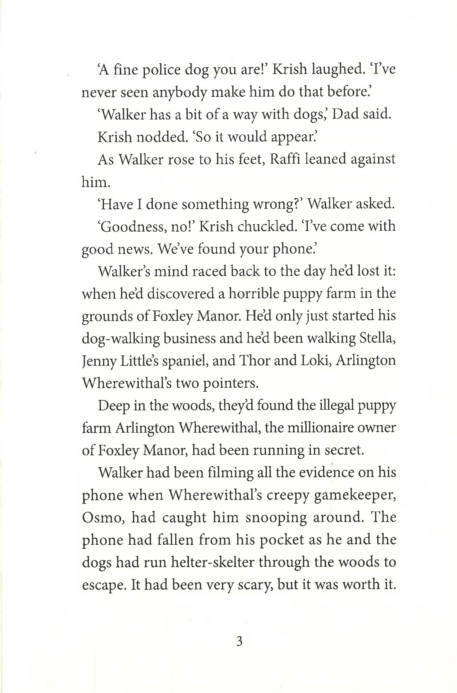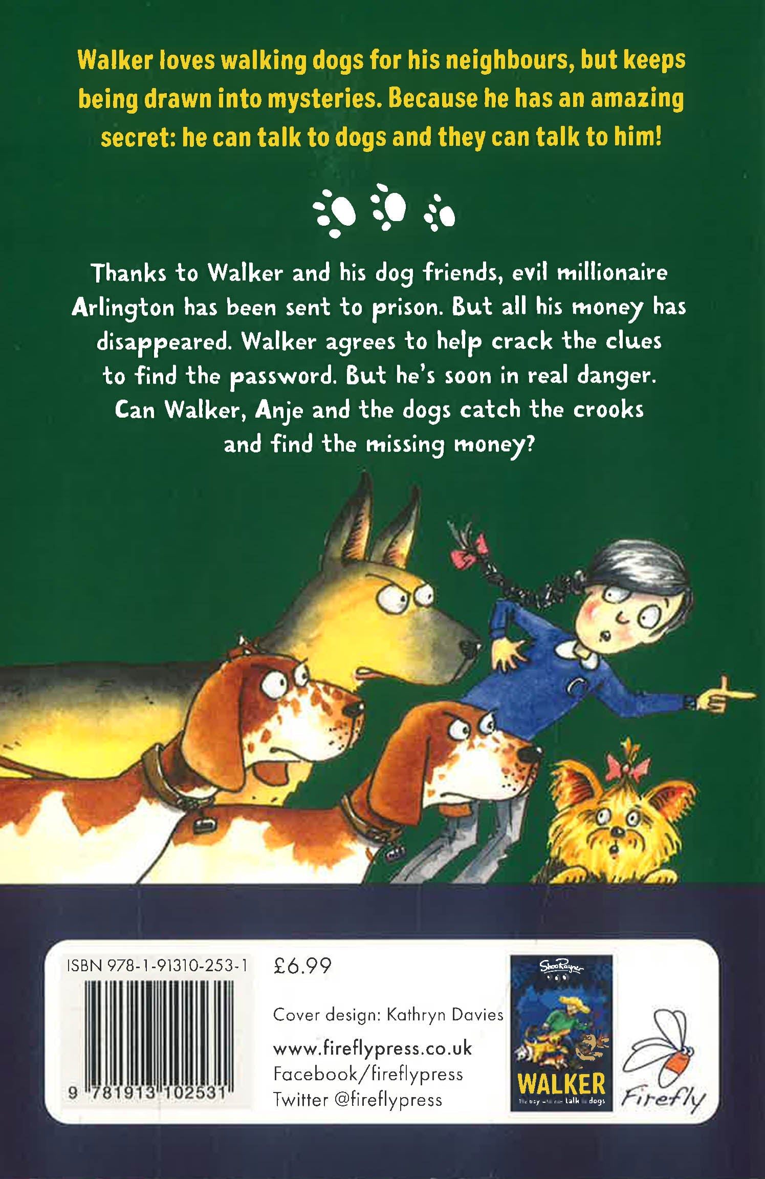 Ten-year-old Walker isn't allowed a dog of his own, so he walks other peoples. But when he finds he can understand them, he gets drawn into mysteries that only the dogs can solve. When crooked billionaire, Arlington Wherewithal goes to prison, his wife, Jazaminta, asks Walker to look after his dogs. Walker finds out that a gang is trying to make Jazaminta tell them the hiding place of Arlington's missing millions. Walker tries to help, but when he gets too close he puts himself in peril! Can Walker, his friend Anje ,and the dogs save themselves, and follow the clues to finding the missing millions?