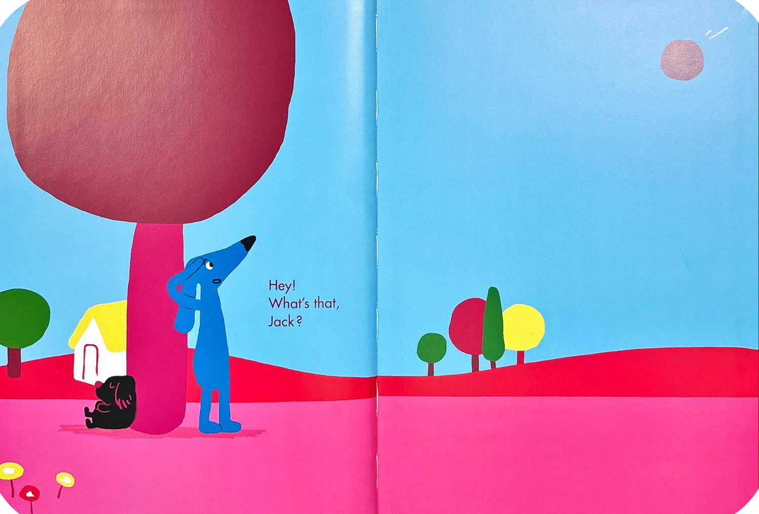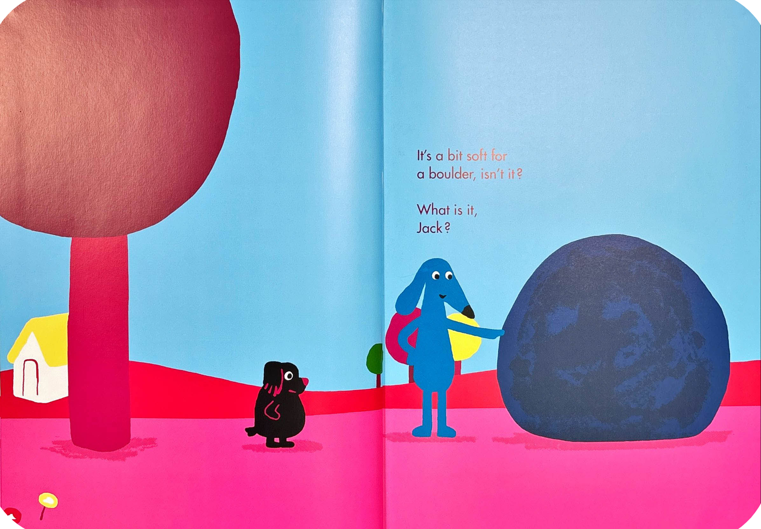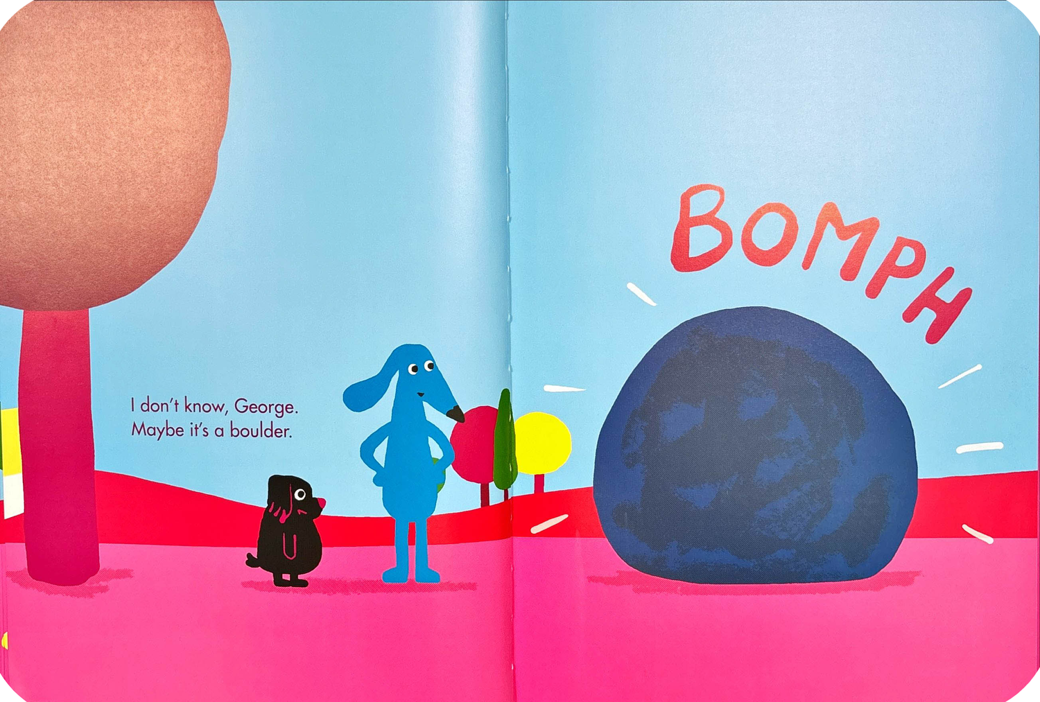 Jack and George are resting quietly when BOOM! A huge and strange ball lands beside them. “What’s that, Jack?” “I don’t know, George. Maybe it’s a rock?” No―too soft. But it rolls. Fast! Jack, George and the ball roll right off the cliff and now it’s a parachute. But watch out, they’re going to land in the river… Jack and George have a brilliant day full of adventure with this object that changes with the landscape. But what is it? It doesn’t matter, it was fun trying to figure it out. This bright and funny book is a game of twists and turns, with a joyful refrain and vivid artwork to capture every toddler’s imagination.