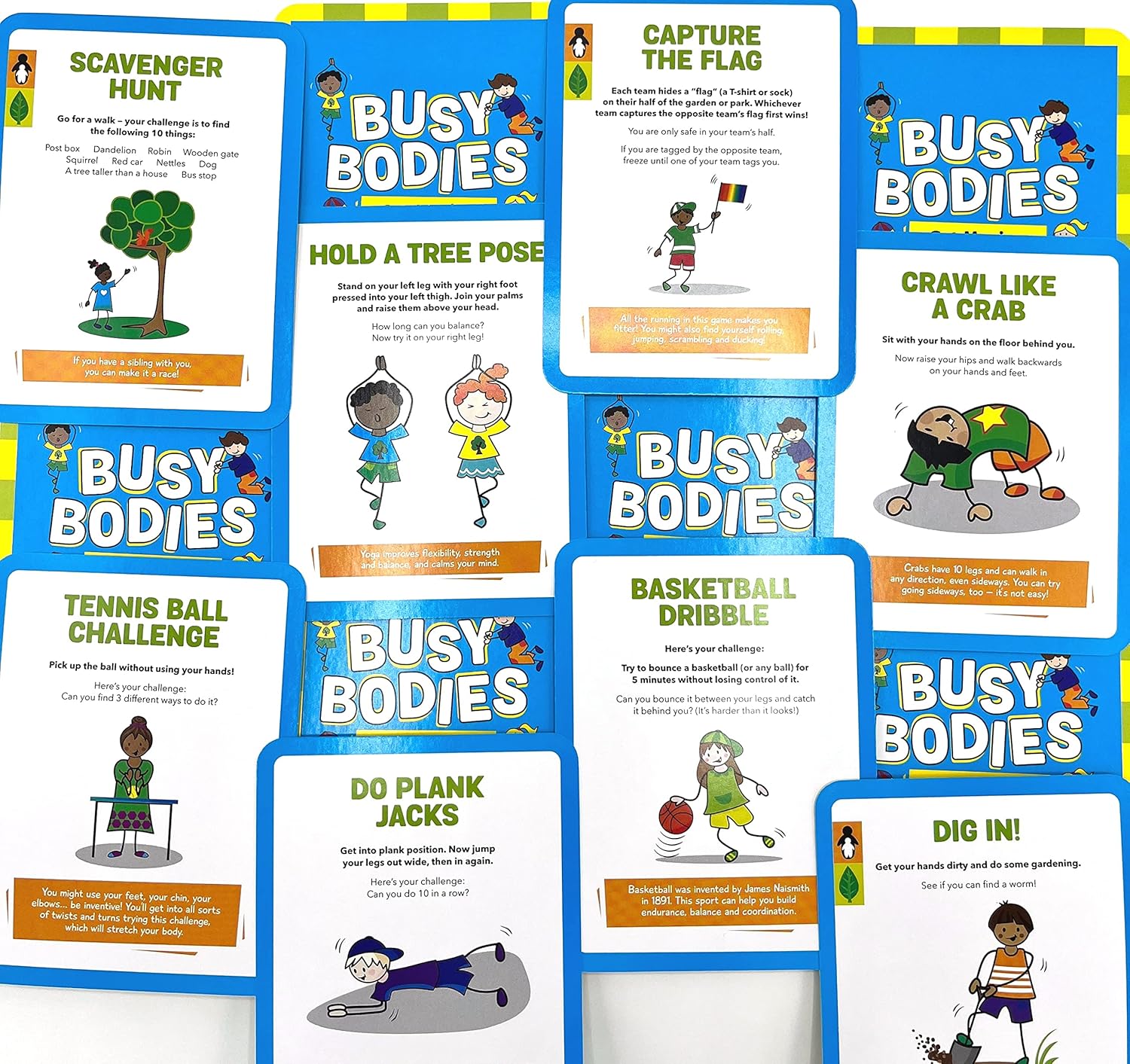 · 52 illustrated cards each with a simple challenge or sporty activity to get kids moving and thinking about their physical and mental health.