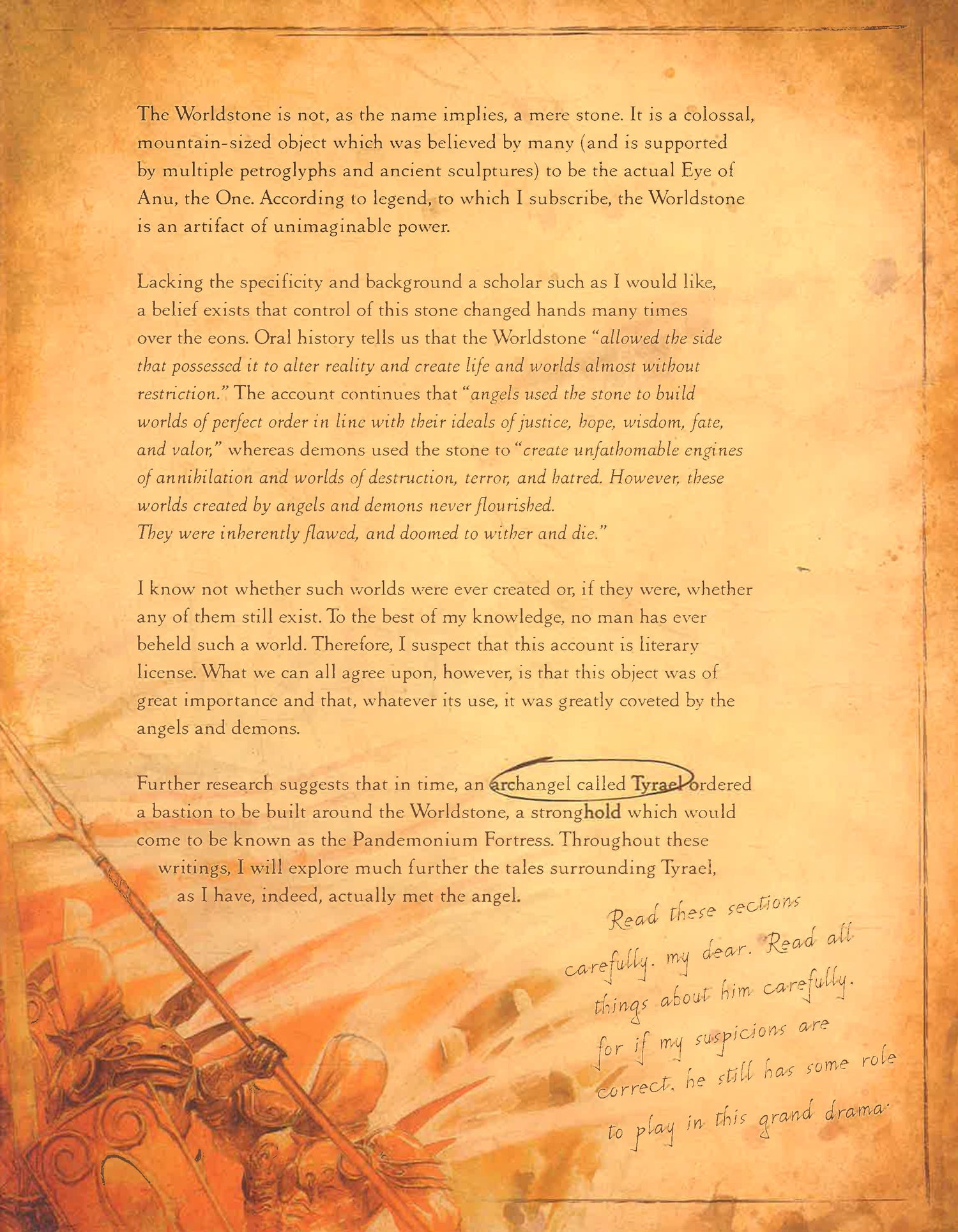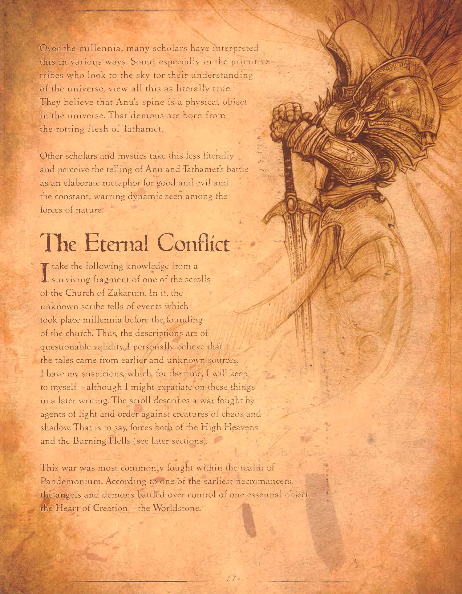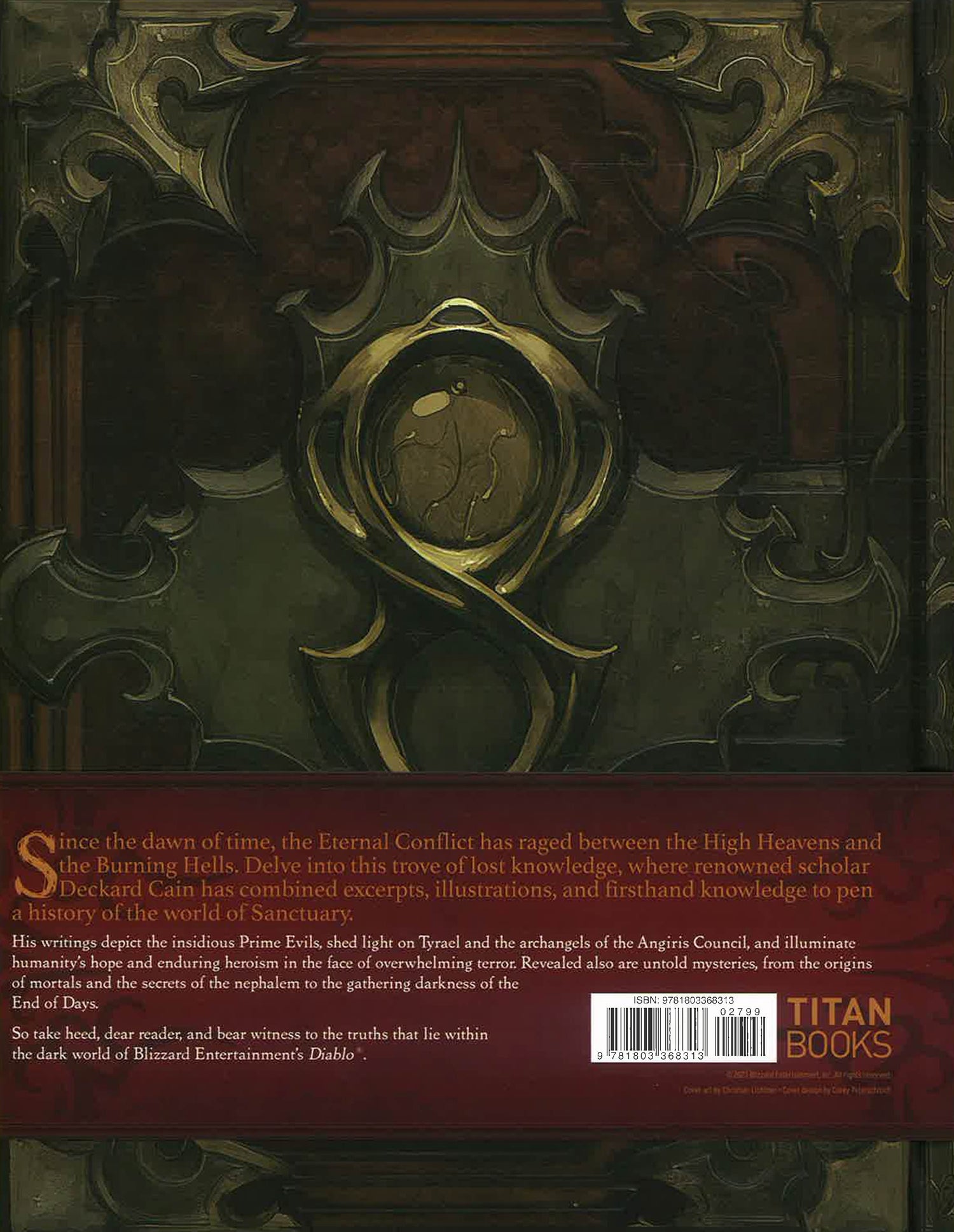 Since the dawn of time, the Eternal Conflict has ragedbetween the High Heavens and the Burning Hells. Delve into this trove oflost knowledge, where renowned scholar Deckard Cain has combined excerpts,illustrations, and firsthand knowledge to pen a history of the world ofSanctuary.His writings depict the insidious Prime Evils, shed light onTyrael and the archangels of the Angiris Council, and illuminate humanity’shope and enduring heroism in the face of overwhelming terror. Revealed also areuntold mysteries, from the origins of mortals and the secrets of the nephalemto the gathering darkness of the End of Days.So take heed, dear reader, and bear witness to the truths thatlie within the dark world of Blizzard Entertainment’s Diablo .