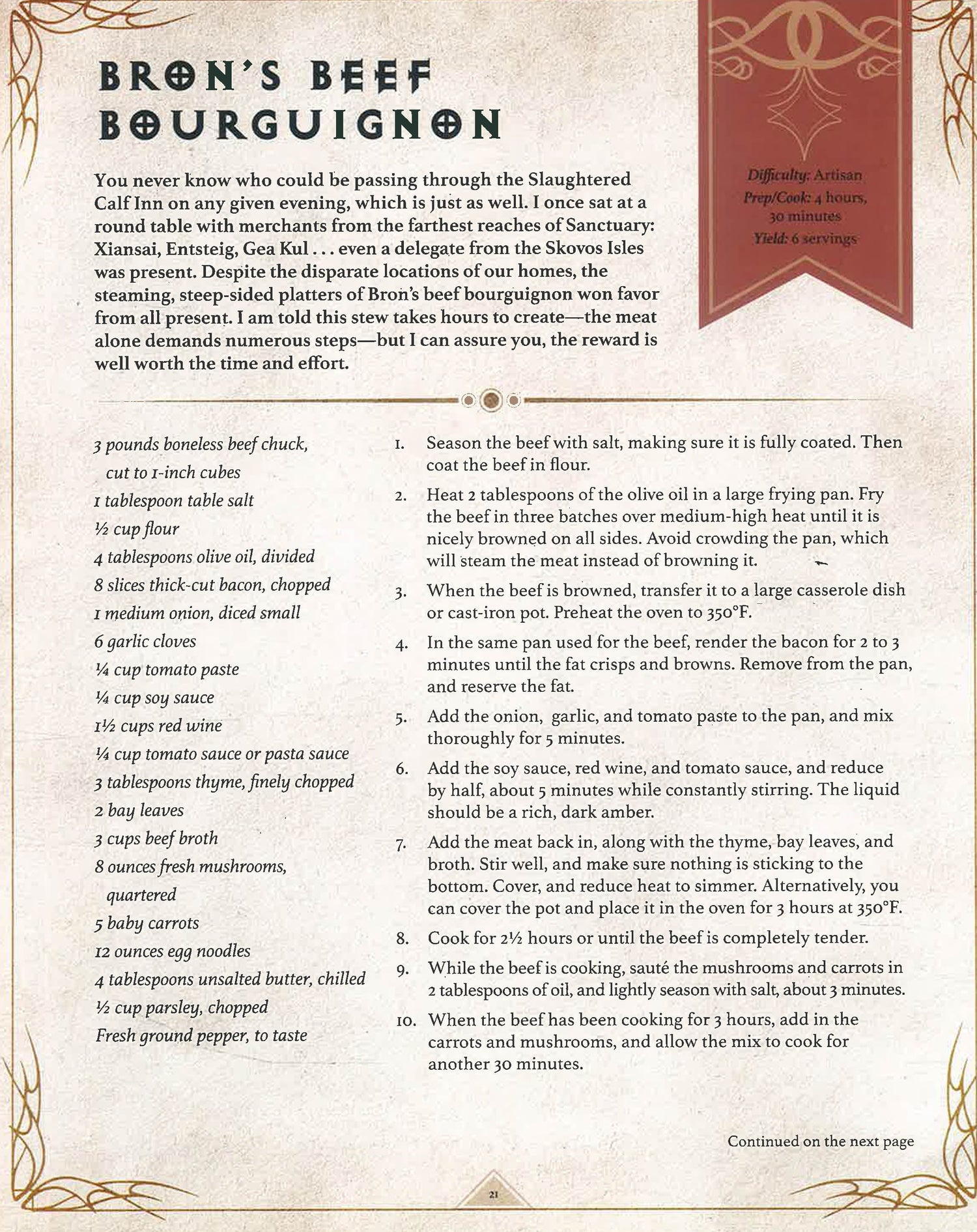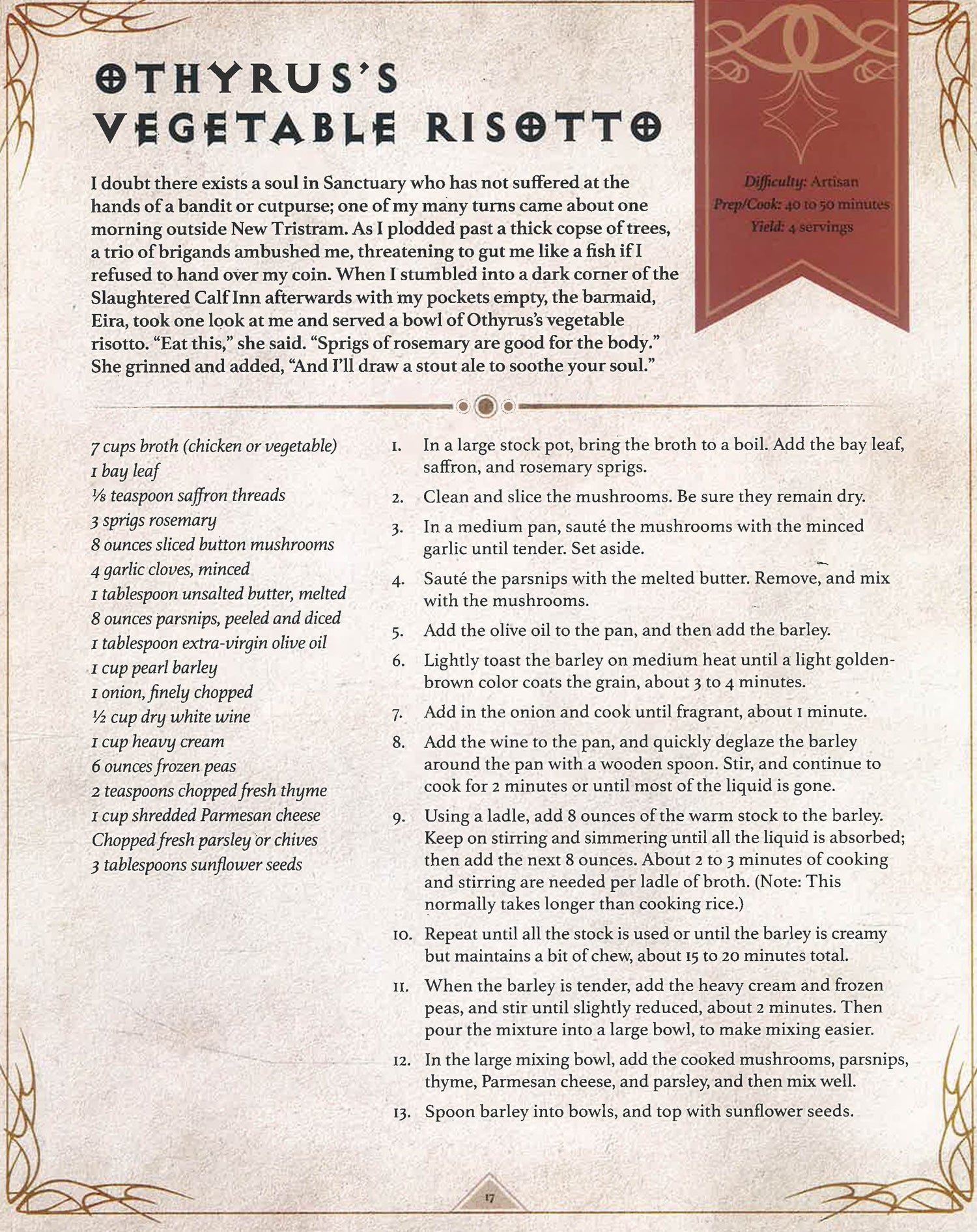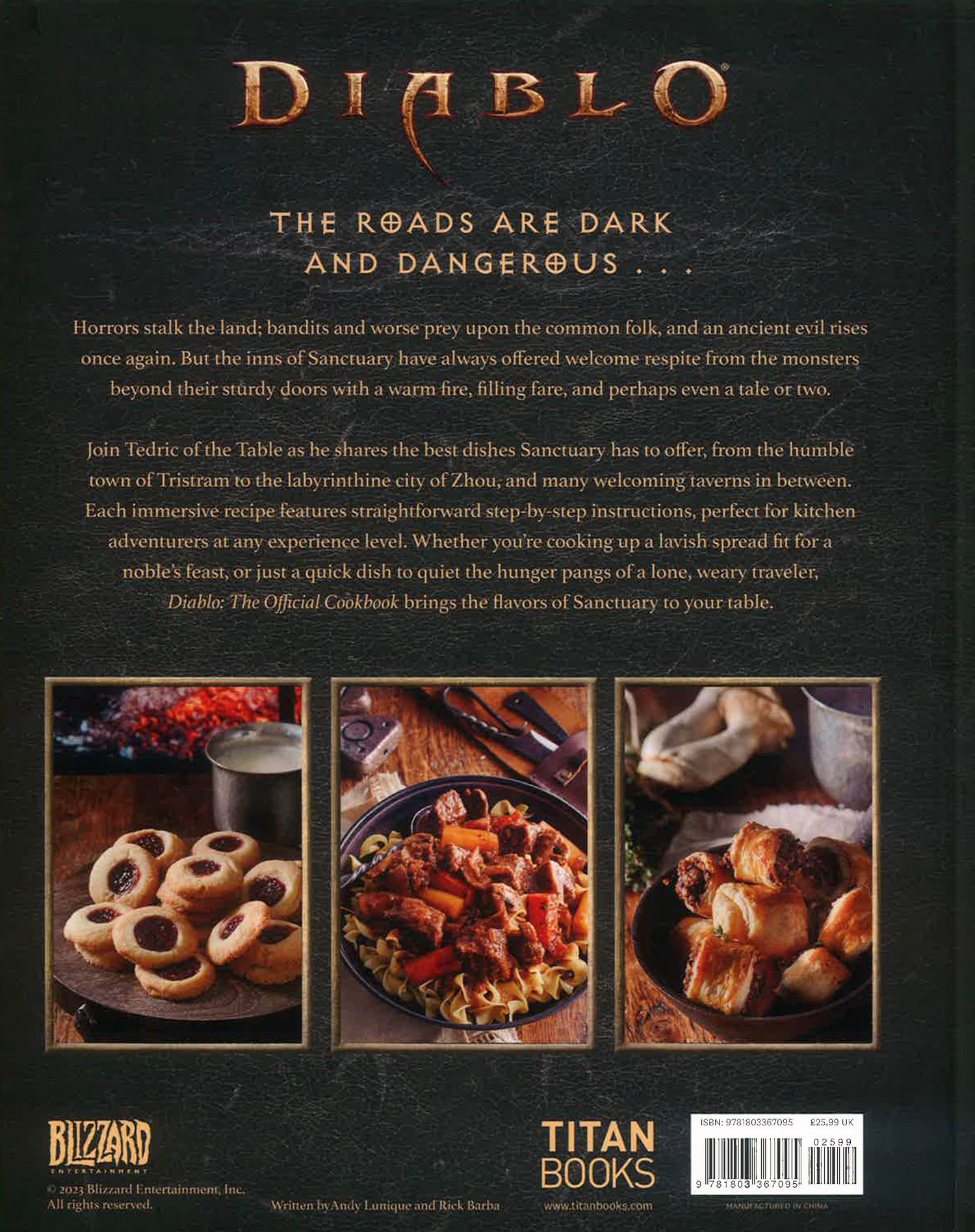 Journey through Sanctuary and prepare to feast on over 60 unique culinary delights inspired by Diablo in this one-of-a-kind cookbook experience. From the humble town of Tristram to the towering Mount Arreat, you will learn how to survive the horrors of this dark, nightmarish fantasy world by enjoying delicious dishes and drinks from the Burning Hells to the High Heavens. Each immersive recipe features straightforward step-by-step instructions, mouthwatering full-colour photos, and pairing suggestions, as well as numerous substitution tips. Whether you’re cooking up a lavish banquet spread fit for a countess or some vittles for a solo quest, Diablo: The Official Cookbook brings the flavours of Sanctuary to your table.