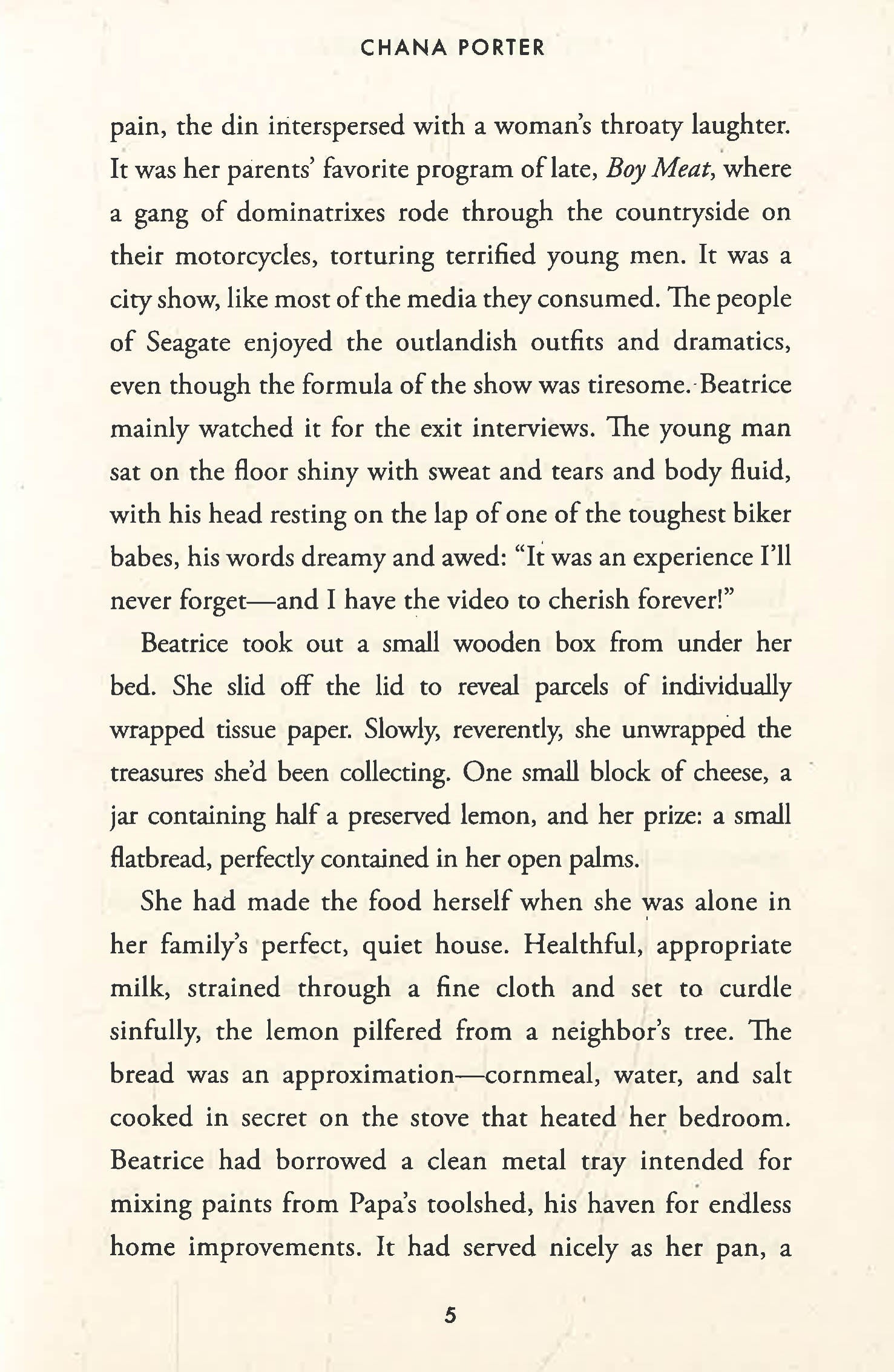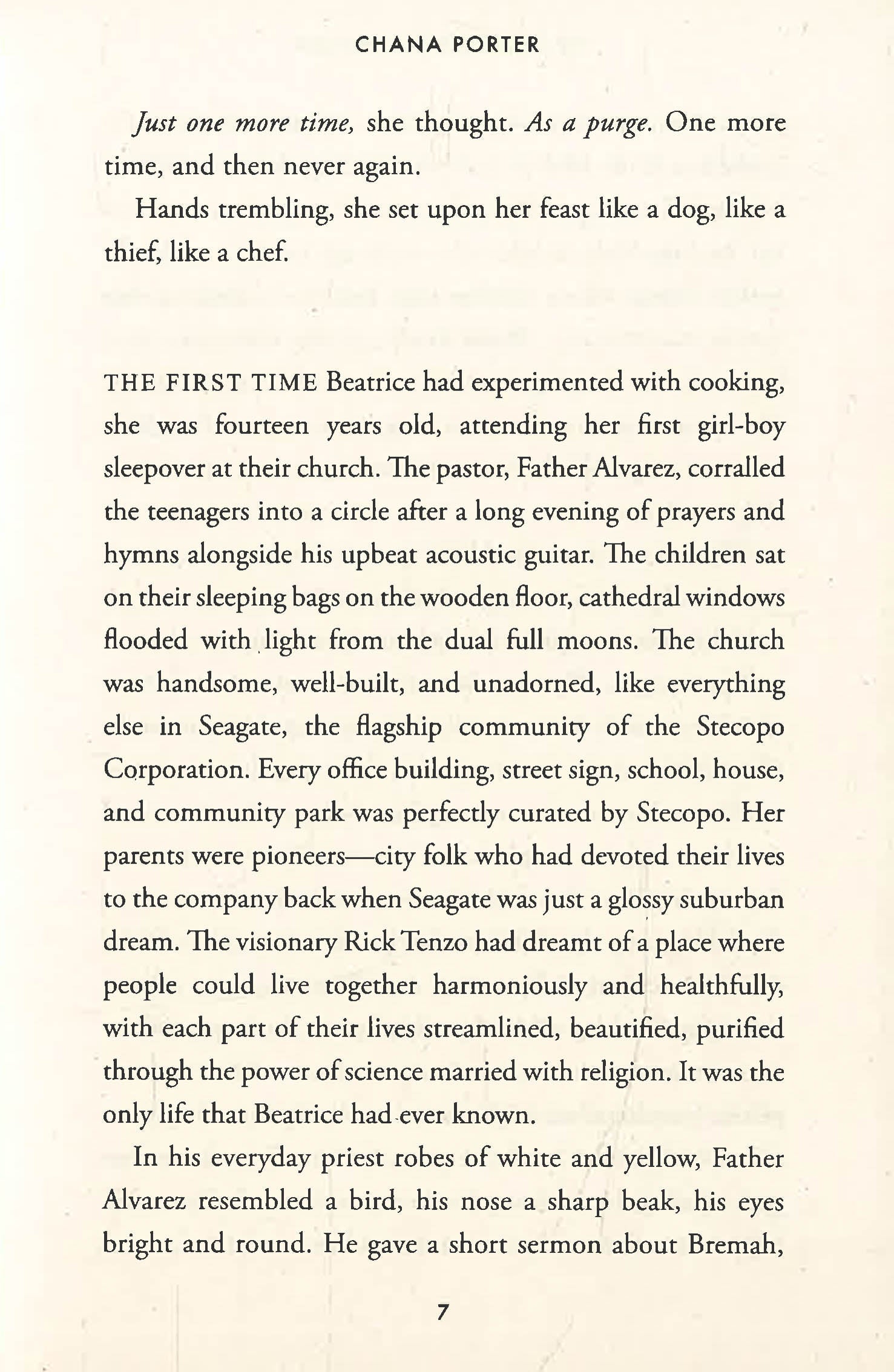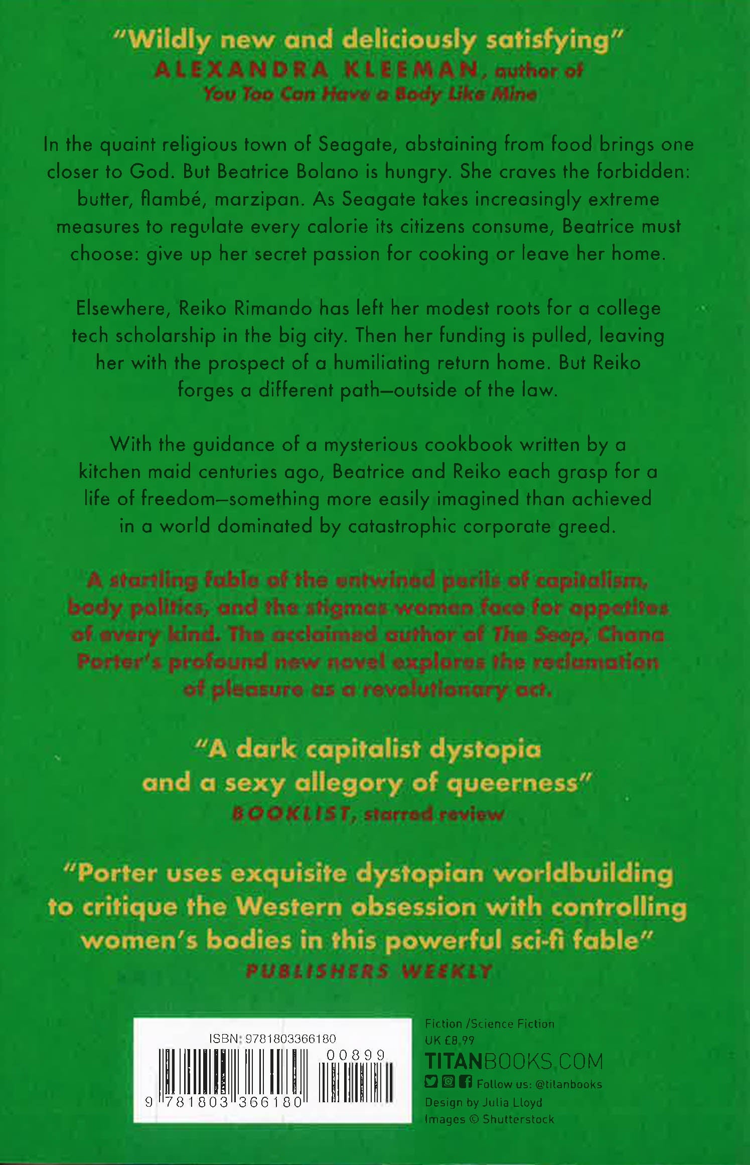 From the acclaimed author of The Seep, comes a provocative and astonishing new novel where three women from a strange new world seek to break free of a society that wants to constrain their attitudes to food, sex and their own bodies. In the quaint religious town of Seagate, abstaining from food brings one closer to God. But Beatrice Bolano is hungry. She craves the forbidden: butter, flambe, marzipan. As Seagate takes increasingly extreme measures to regulate every calorie its citizens consume, Beatrice must make a choice: give up her secret passion for cooking or leave the only community she has known. Elsewhere, Reiko Rimando has left her modest roots for a college tech scholarship in the big city. A flawless student, she is set up for success . . . until her school pulls her funding, leaving her to face either a mountain of debt or a humiliating return home. But Reiko is done being at the mercy of the system. She forges a third path-outside of the law. With the guidance of a mysterious cookbook written by a kitchen maid centuries ago, Beatrice and Reiko each grasp for a life of freedom-something more easily imagined than achieved in a world dominated by catastrophic corporate greed. A startling fable of the entwined perils of capitalism, body politics, and the stigmas women face for appetites of every kind, Chana Porter's profound new novel explores the reclamation of pleasure as a revolutionary act.