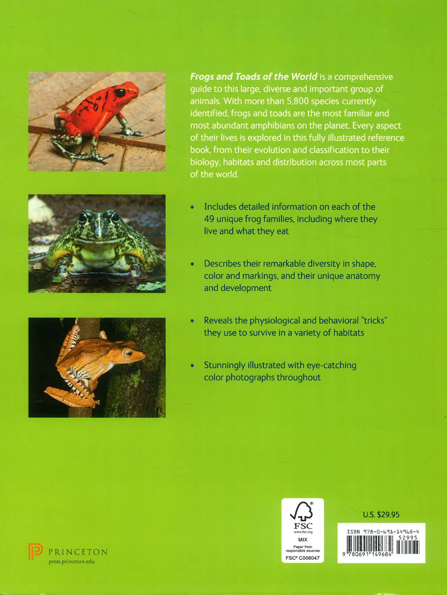 With nearly 6,000 species currently identified, frogs and toads are the most familiar and abundant amphibians on the planet. Frogs and Toads of the World is a comprehensive guide to the natural history of this large and diverse group of creatures. Stunningly illustrated throughout with 200 color photographs, this one-of-a-kind book traces the evolution and classification of frogs and toads, providing detailed information about each of the 49 unique families and highlighting distinctive and notable species. It vividly describes their remarkable diversity in shape, color, and markings; anatomy and development; life cycle; habitats; the various methods they use to attract mates and hunt for food; and the physiological and behavioral tricks they use to survive and thrive around the world.