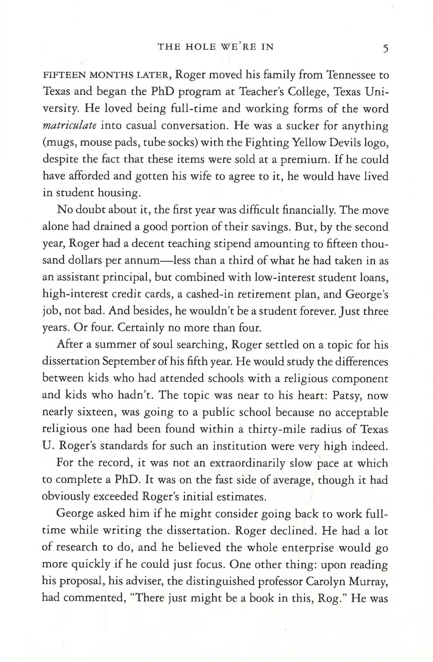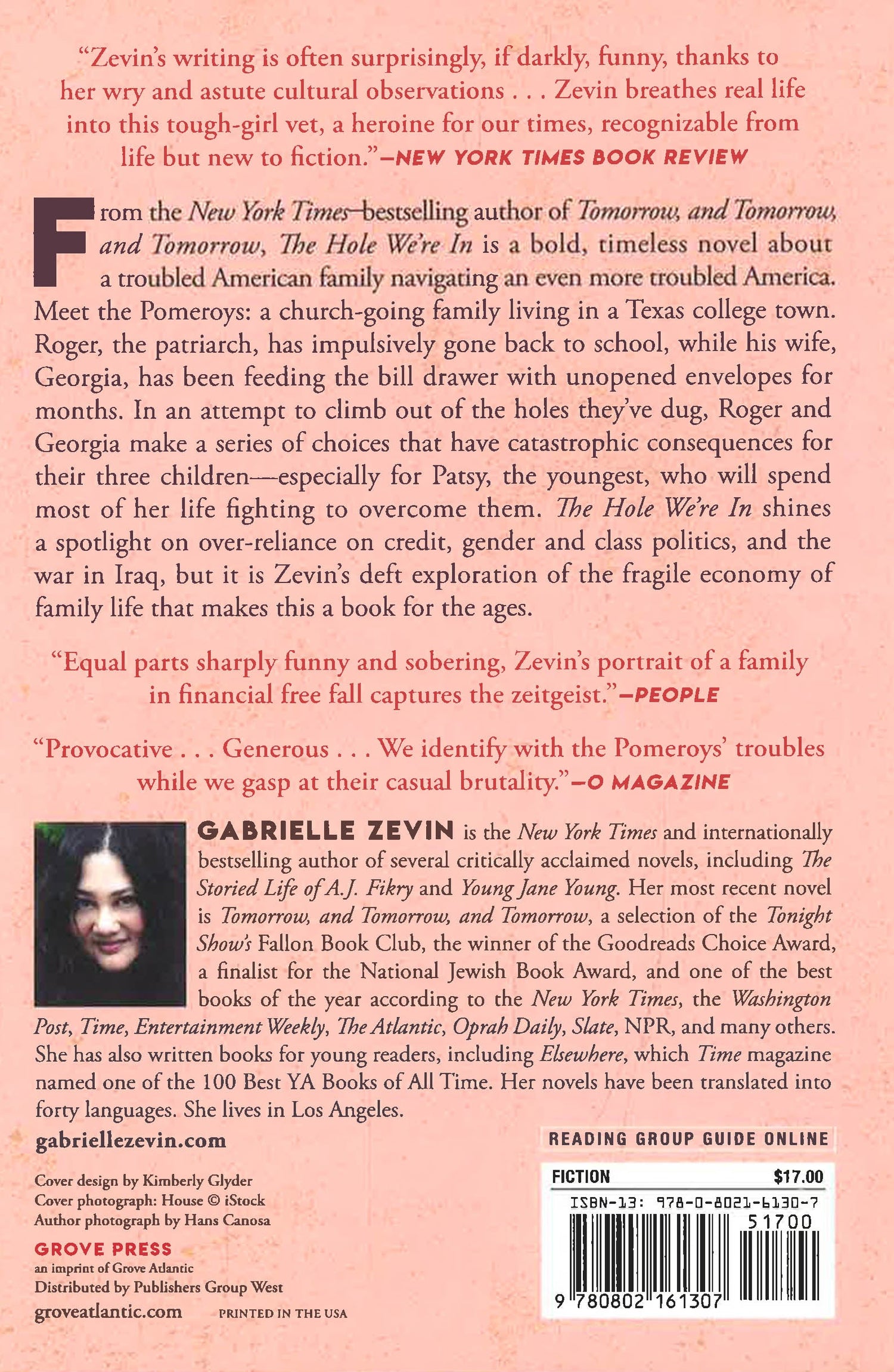 Meet the Pomeroys: a church-going family living in a Texas college town. Roger, the patriarch, has impulsively gone back to school, while his wife, Georgia, has been feeding the bill drawer with unopened envelopes for months. In an attempt to climb out of the holes they've dug, Roger and Georgia make a series of choices that have catastrophic consequences for their three children--especially for Patsy, the youngest, who will spend most of her life fighting to overcome them. The Hole We're In shines a spotlight on over-reliance on credit, gender and class politics, and the war in Iraq, but it is Zevin's deft exploration of the fragile economy of family life that makes this a book for the ages.