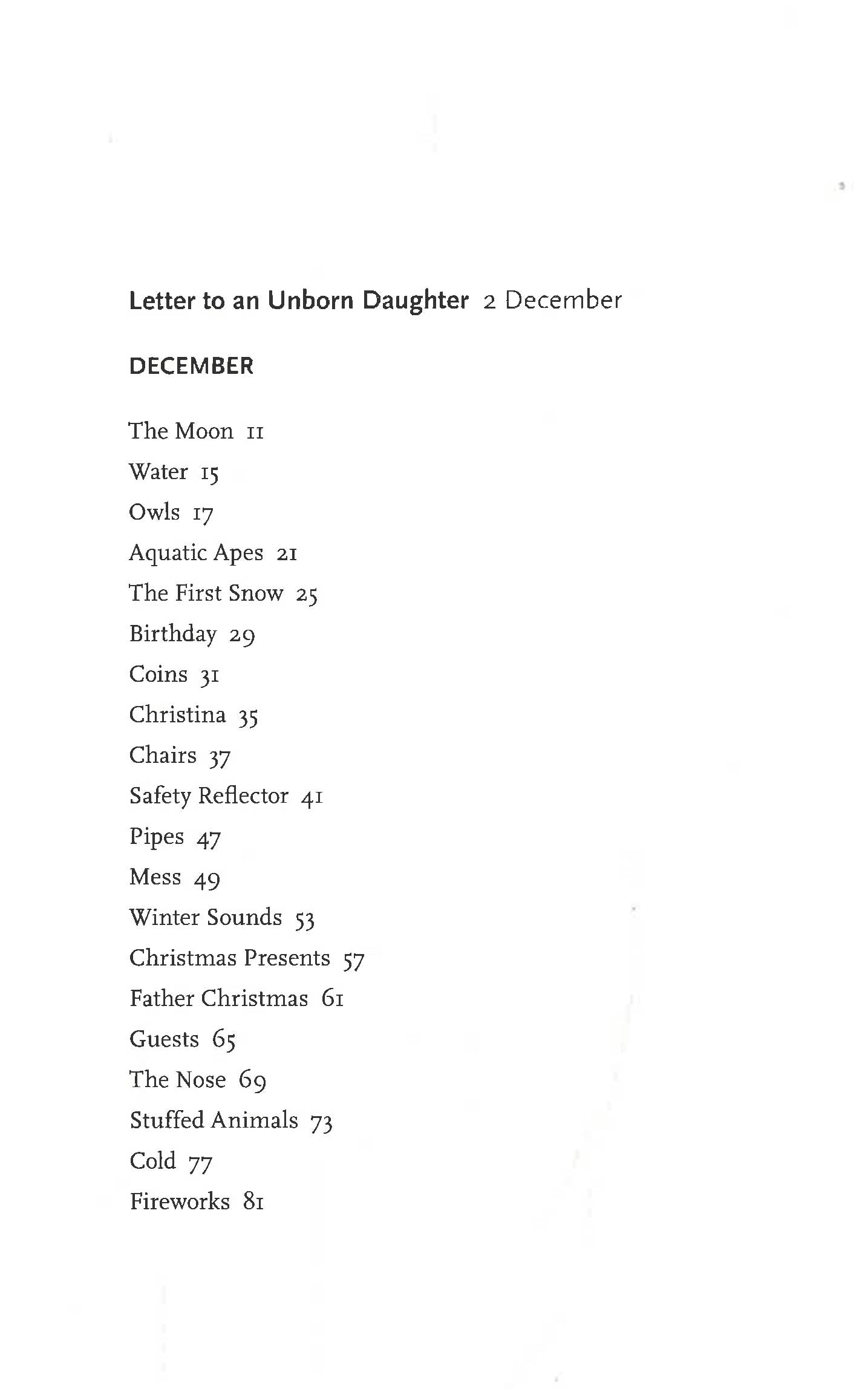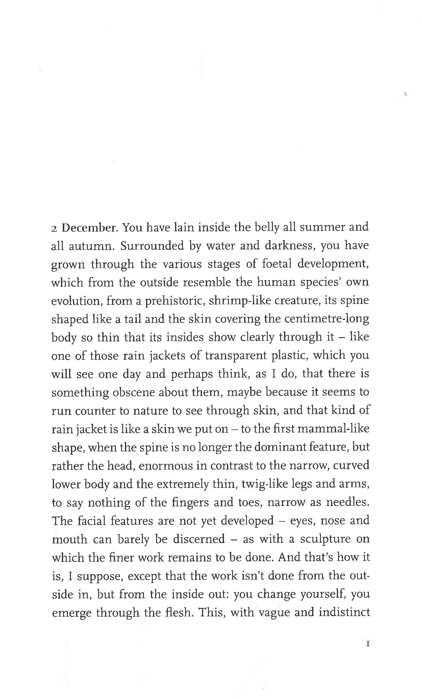 2 December - It is strange that you exist, but that you don't know anything about what the world looks like. It's strange that there is a first time to see the sky, a first time to see the sun, a first time to feel the air against one's skin. It's strange that there is a first time to see a face, a tree, a lamp, pajamas, a shoe. In my life it almost never happens anymore. But soon it will. In just a few months, I will see you for the first time.