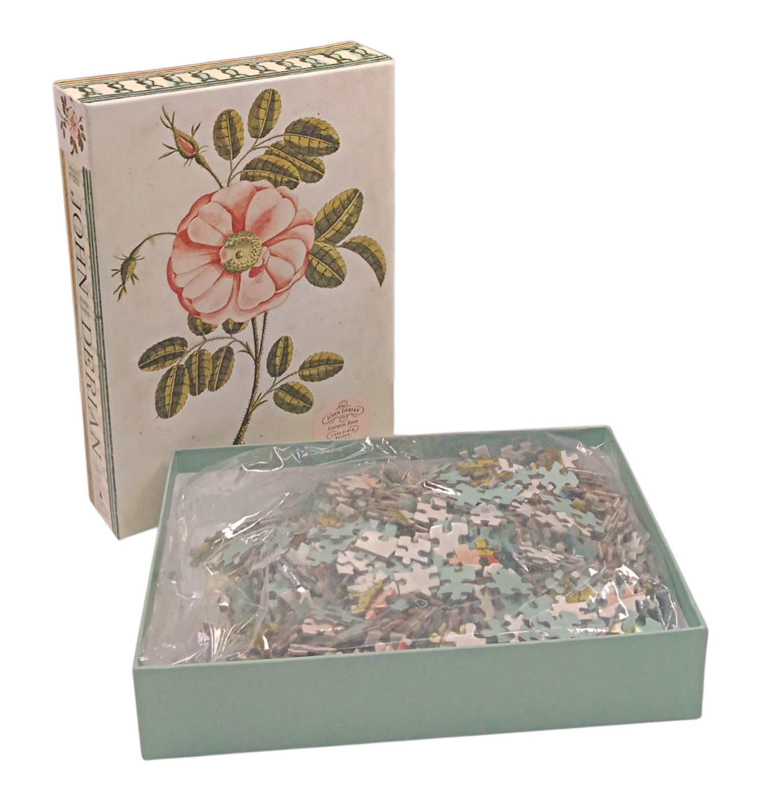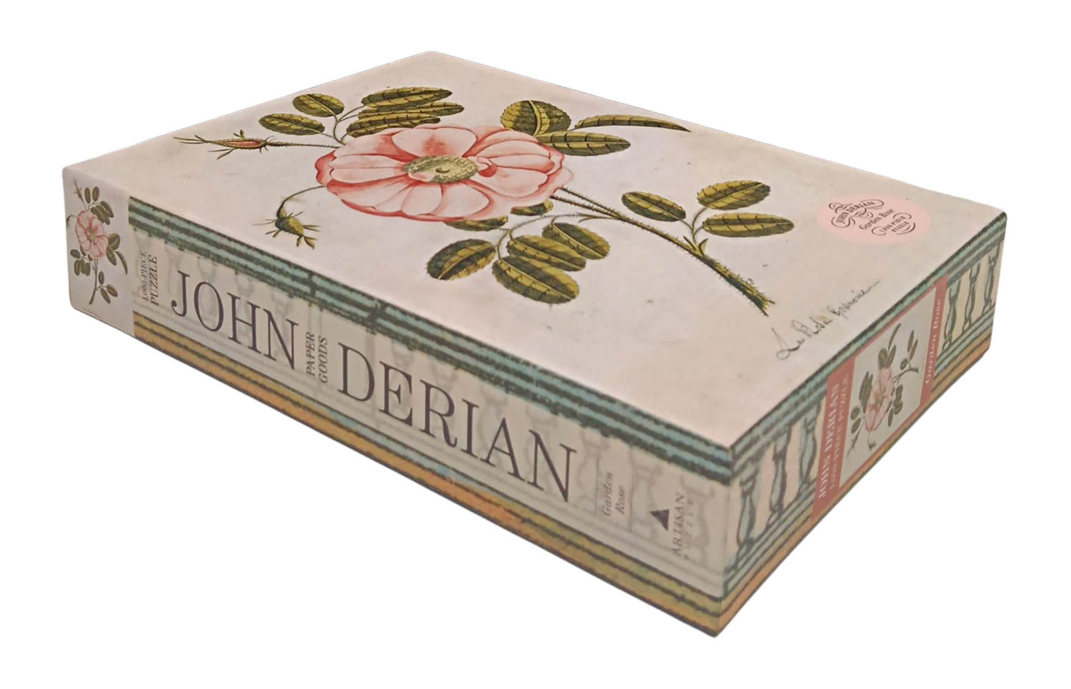 A rose in full bloom. What is more captivating? Adapted from a nineteenth-century chromolithograph from the collection of John Derian, the artist and designer whose work with printed images of the past transports the viewer to another world, Garden Rose challenges the puzzle doer with its subtle tones of parchment and repetition of leaves and thorns, and utterly enchants with the delicate pink bull’s-eye of its single, mesmerizing bloom.