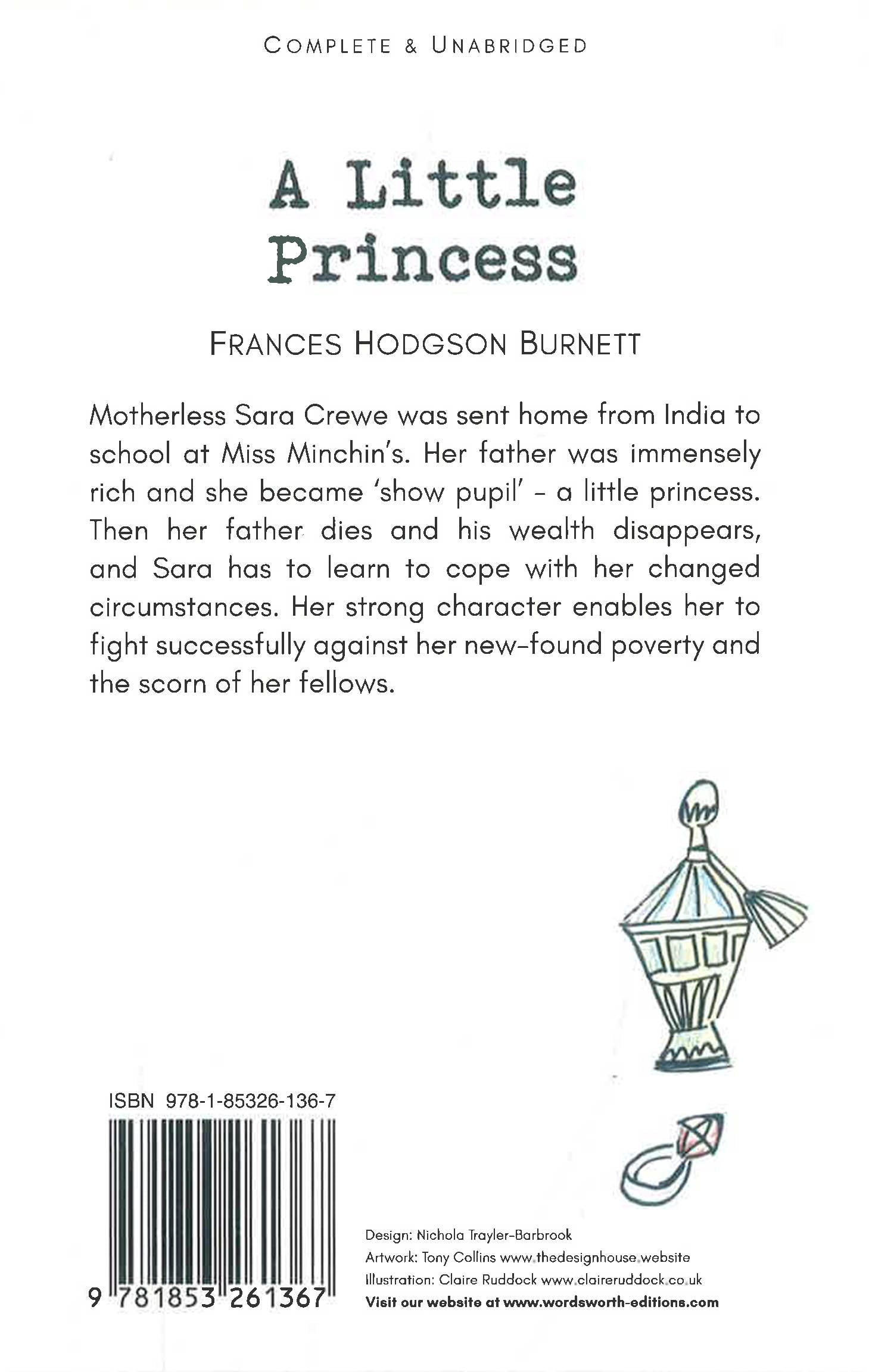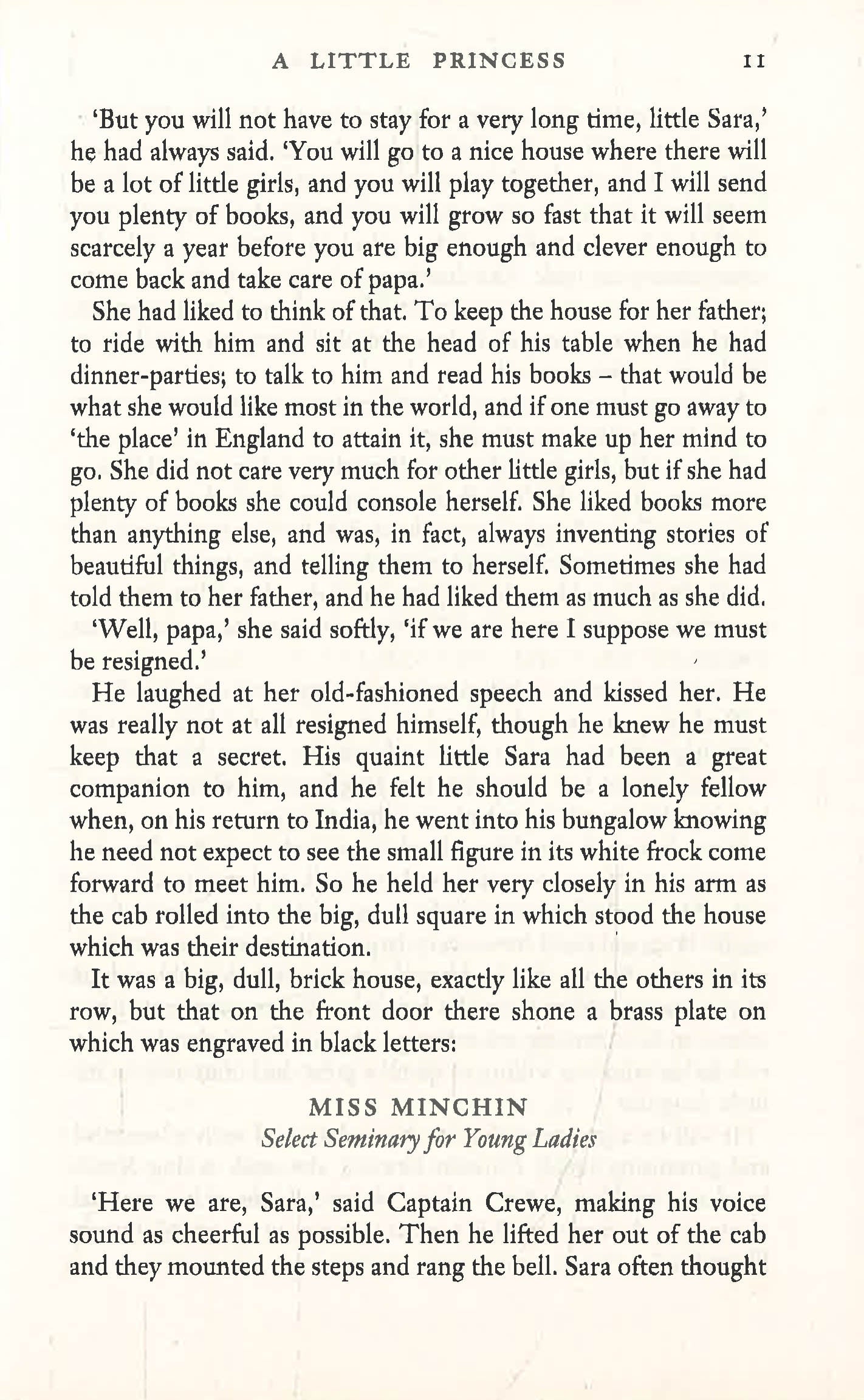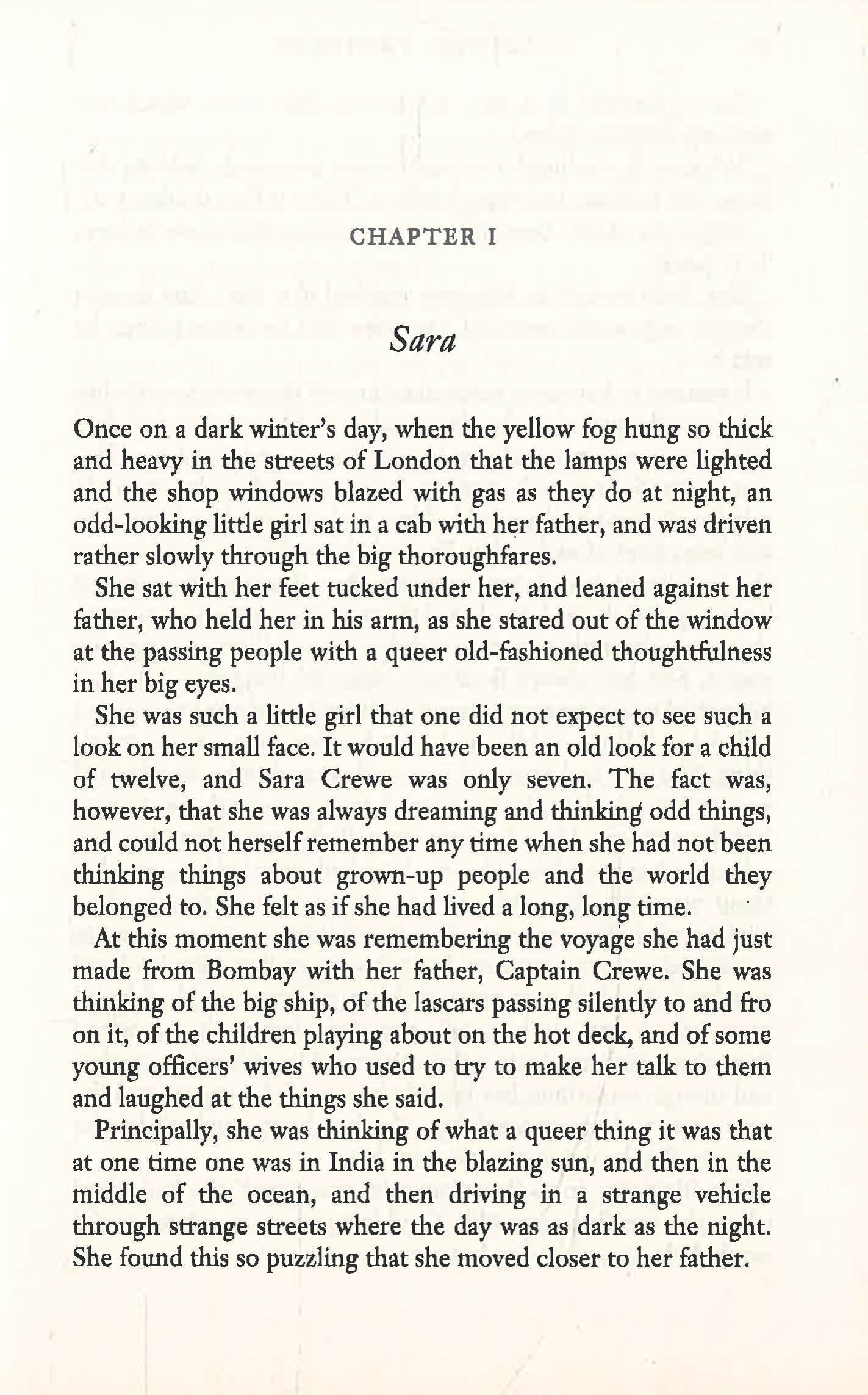 Motherless Sara Crewe was sent home from India to school at Miss Minchin's. Her father was immensely rich and she became 'show pupil' - a little princess. Then her father dies and his wealth disappears, and Sara has to learn to cope with her changed circumstances. Her strong character enables her to fight successfully against her new-found poverty and the scorn of her fellows.