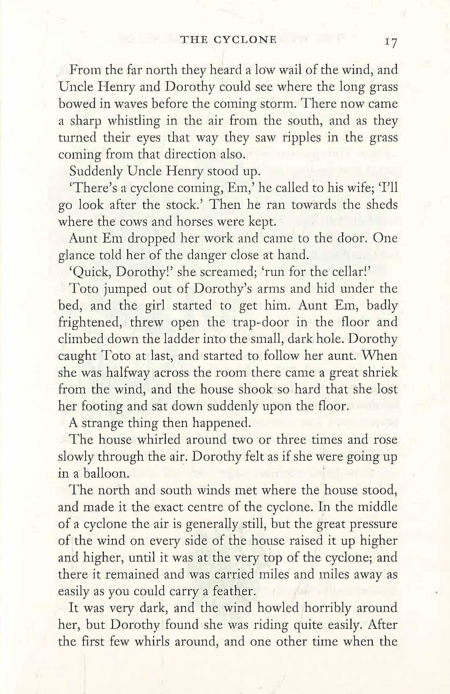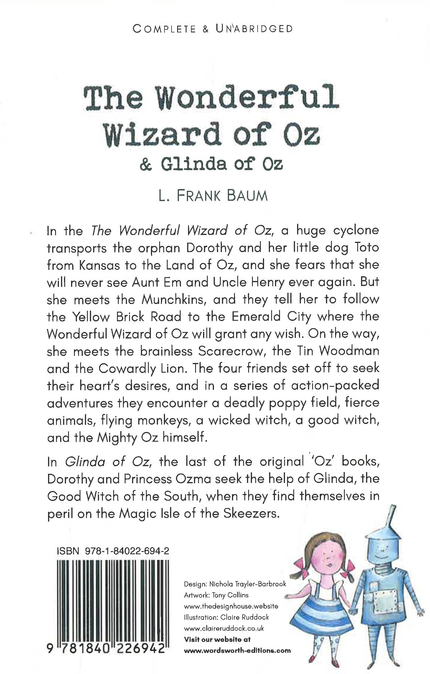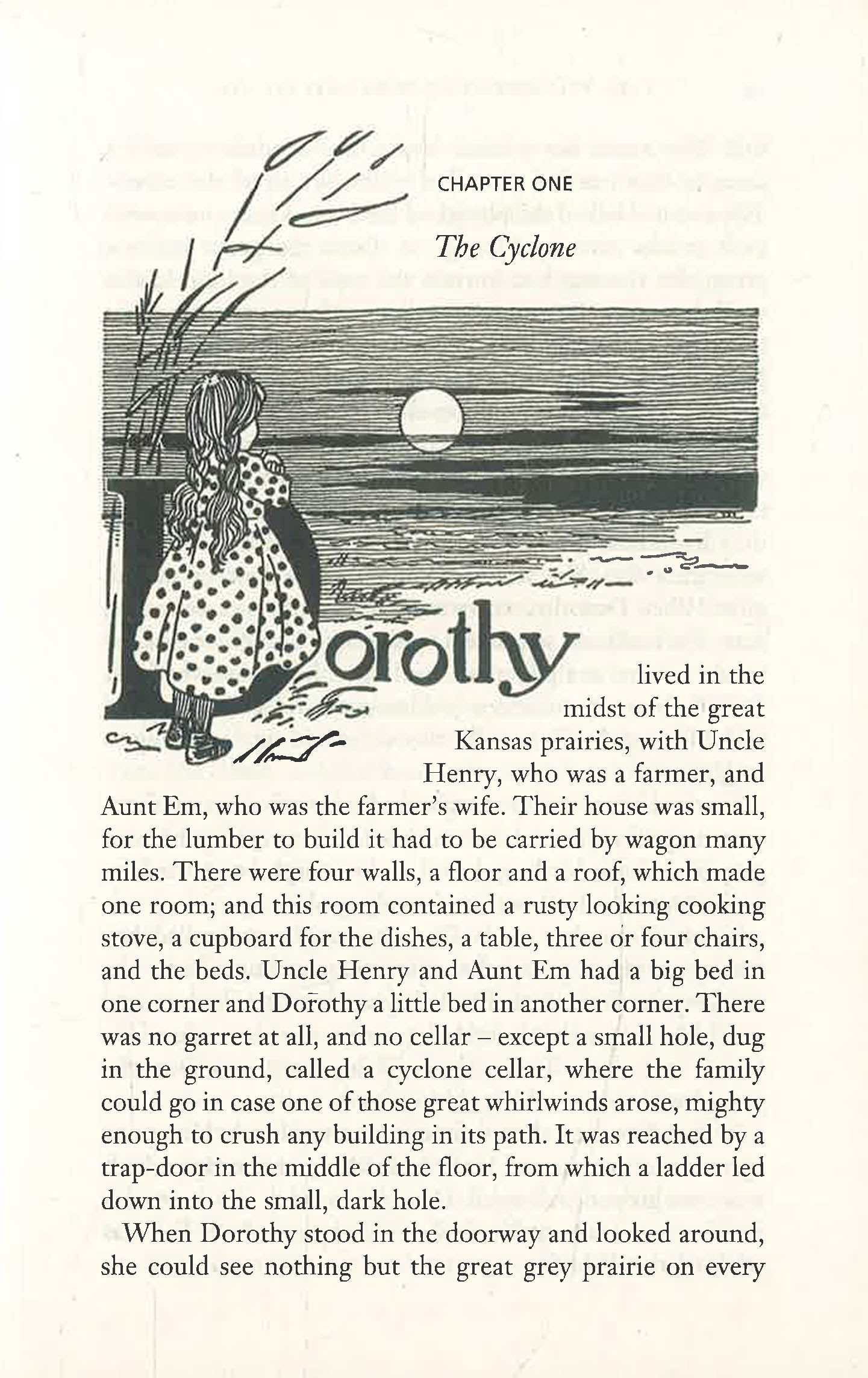 When a huge cyclone transports the orphan Dorothy and her little dog Toto from Kansas to the Land of Oz, where she follows the Yellow Brick Road to the Emerald City where the Wonderful Wizard of Oz will grant any wish. She has further adventures in Glinda of Oz.