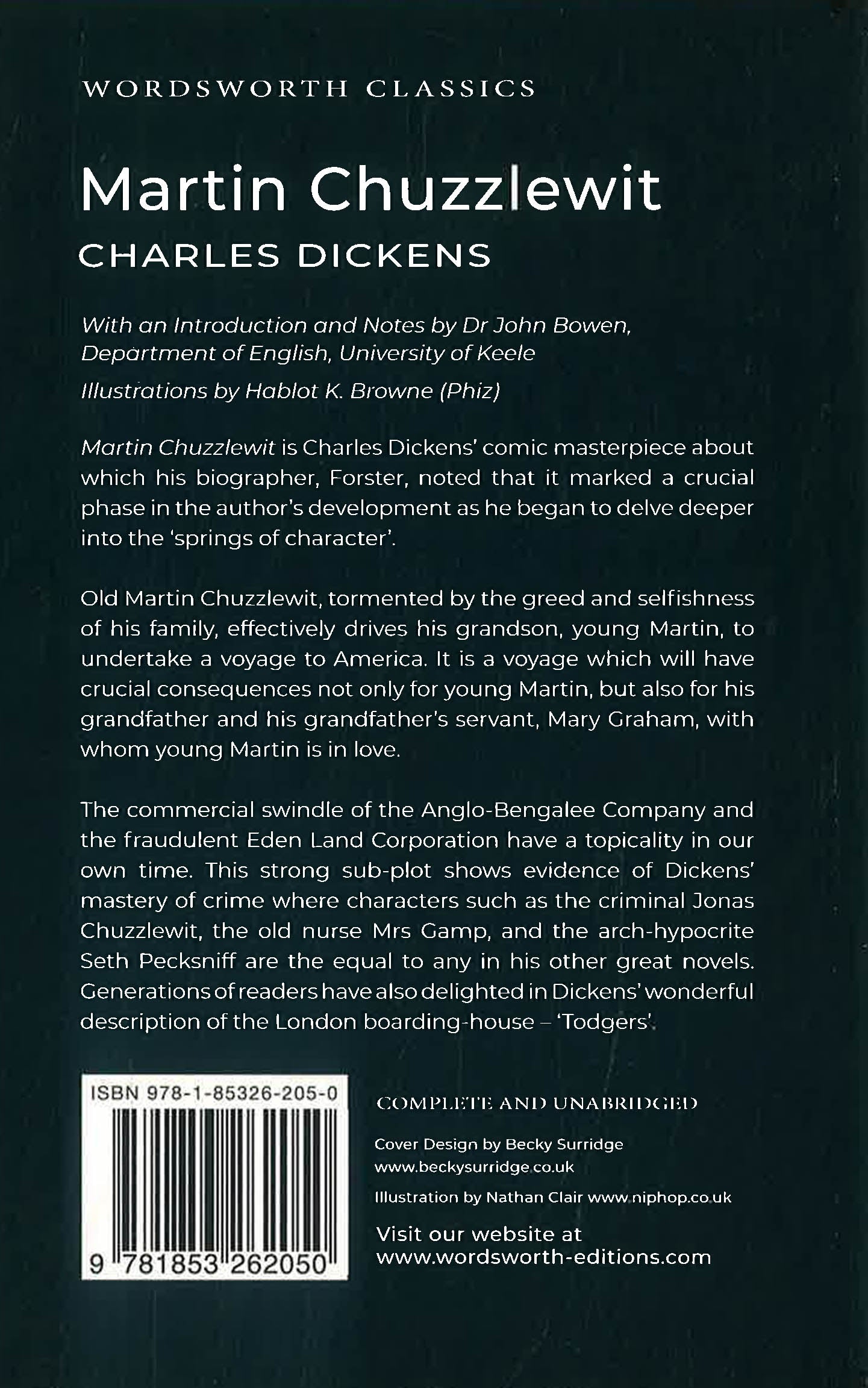 With an Introduction and Notes by Dr John Bowen, Department of English, University of Keele. Illustrations by Hablot K. Browne (Phiz). Martin Chuzzlewit is Charles Dickens' comic masterpiece about which his biographer, Forster, noted that it marked a crucial phase in the author's development as he began to delve deeper into the 'springs of character'. Old Martin Chuzzlewit, tormented by the greed and selfishness of his family, effectively drives his grandson, young Martin, to undertake a voyage to America. It is a voyage which will have crucial consequences not only for young Martin, but also for his grandfather and his grandfather's servant, Mary Graham with whom young Martin is in love. The commercial swindle of the Anglo-Bengalee company and the fraudulent Eden Land Corporation have a topicality in our own time. This strong sub-plot shows evidence of Dickens' mastery of crime where characters such as the criminal Jonas Chuzzlewit, the old nurse Mrs Gamp, and the arch-hypocrite Seth Pecksniff are the equal to any in his other great novels. Generations of readers have also delighted in Dickens' wonderful description of the London boarding-house - 'Todgers'.