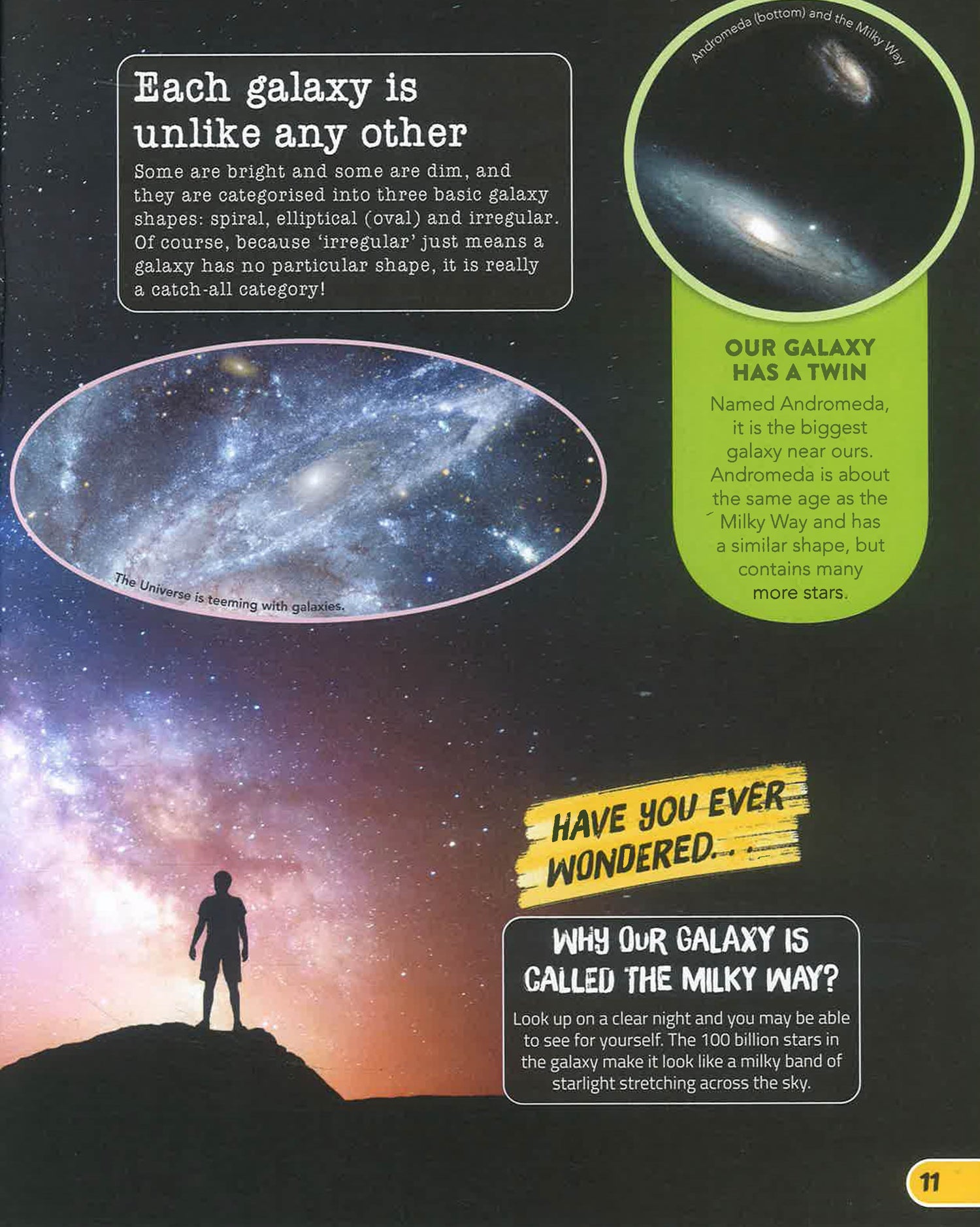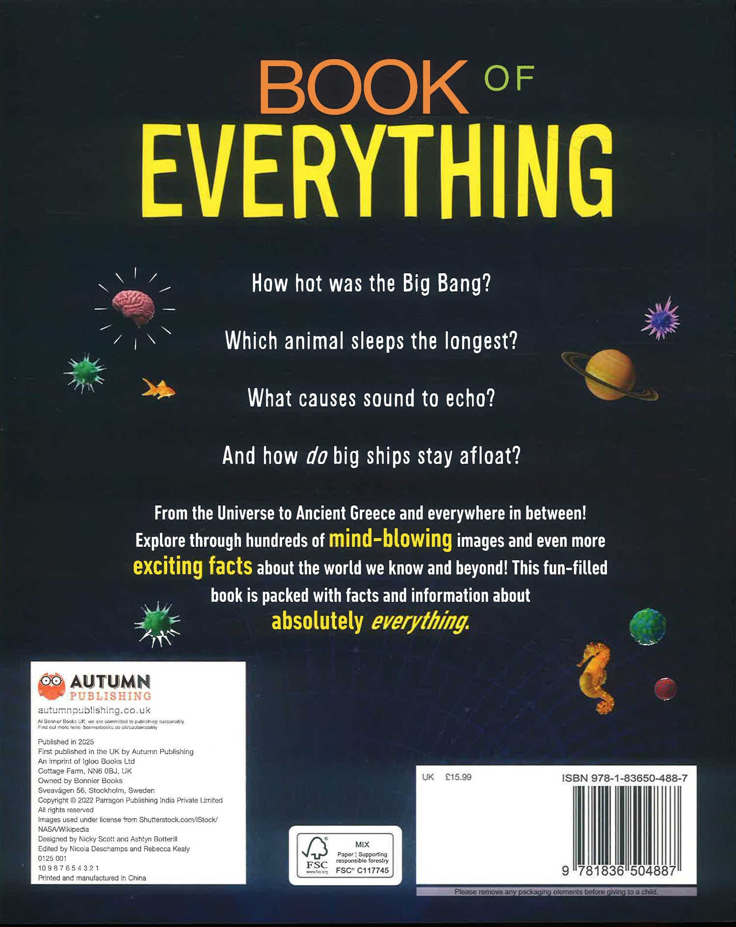 How hot was the big bang? Which animal sleeps the longest? What causes sound to echo? How do big ships manage to stay afloat?From the Universe to Ancient Greece and everywhere in between! Explore through hundreds of mind-blowing images and exciting facts about the world we know and beyond! This fun-filled book is packed with facts and information about absolutely everything. This would make the perfect gift for kids that are curious to learn more about the world we live in.