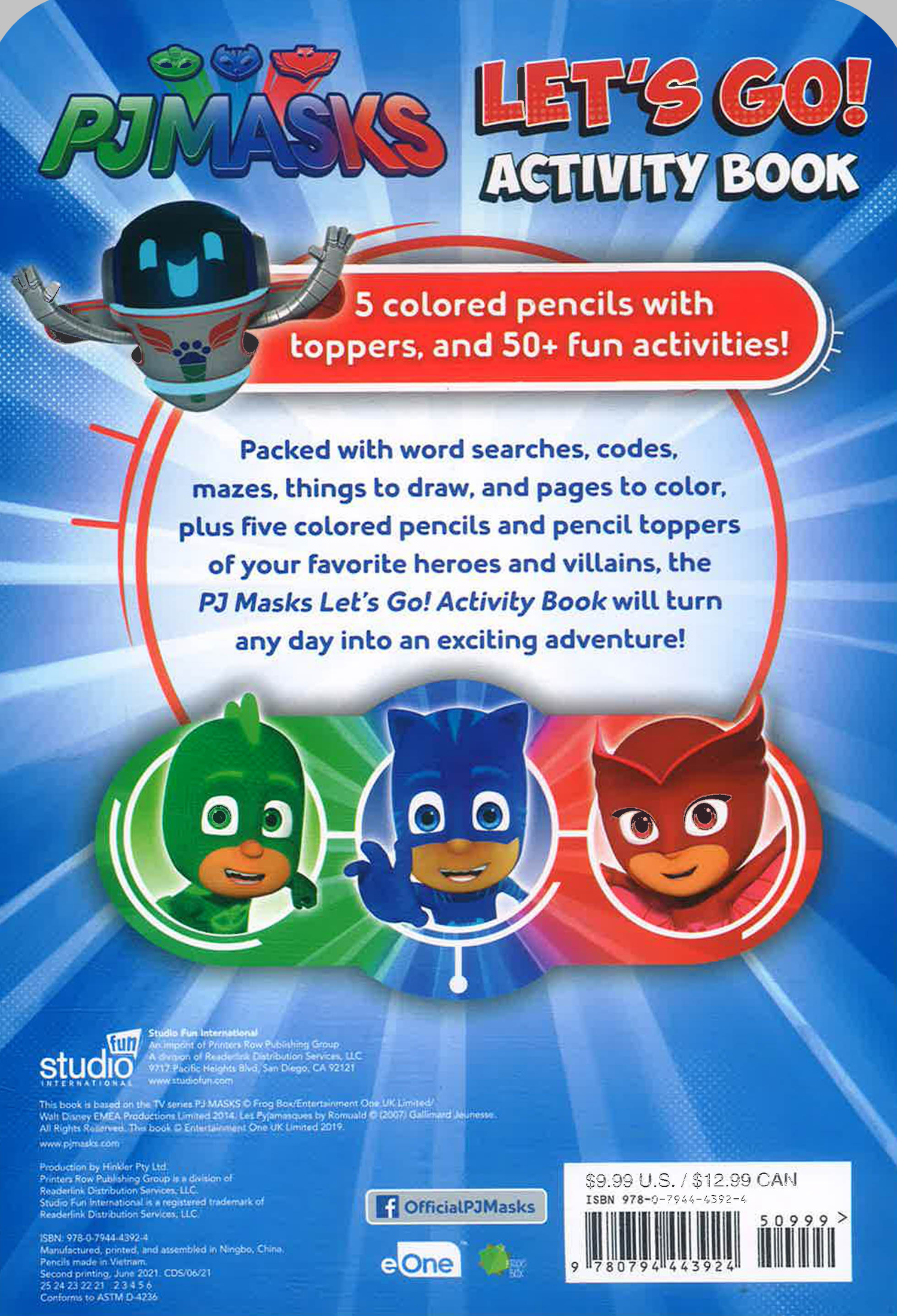 The PJ Masks Let's Go! Activity Book is chock-full of coloring and activity pages based on the PJ Masks' adventures. New characters also join the action-packed fun. There's PJ Robot (the latest member of the PJ Masks team), and Armadylan (a villain who wants to be a hero) and the Wolfy Kids trio (the half-werewolf, half-human trio of trouble) round out the roster of baddies. Five colored pencils--each topped with an eraser of a different favorite character--are included so kids can start having fun right away!