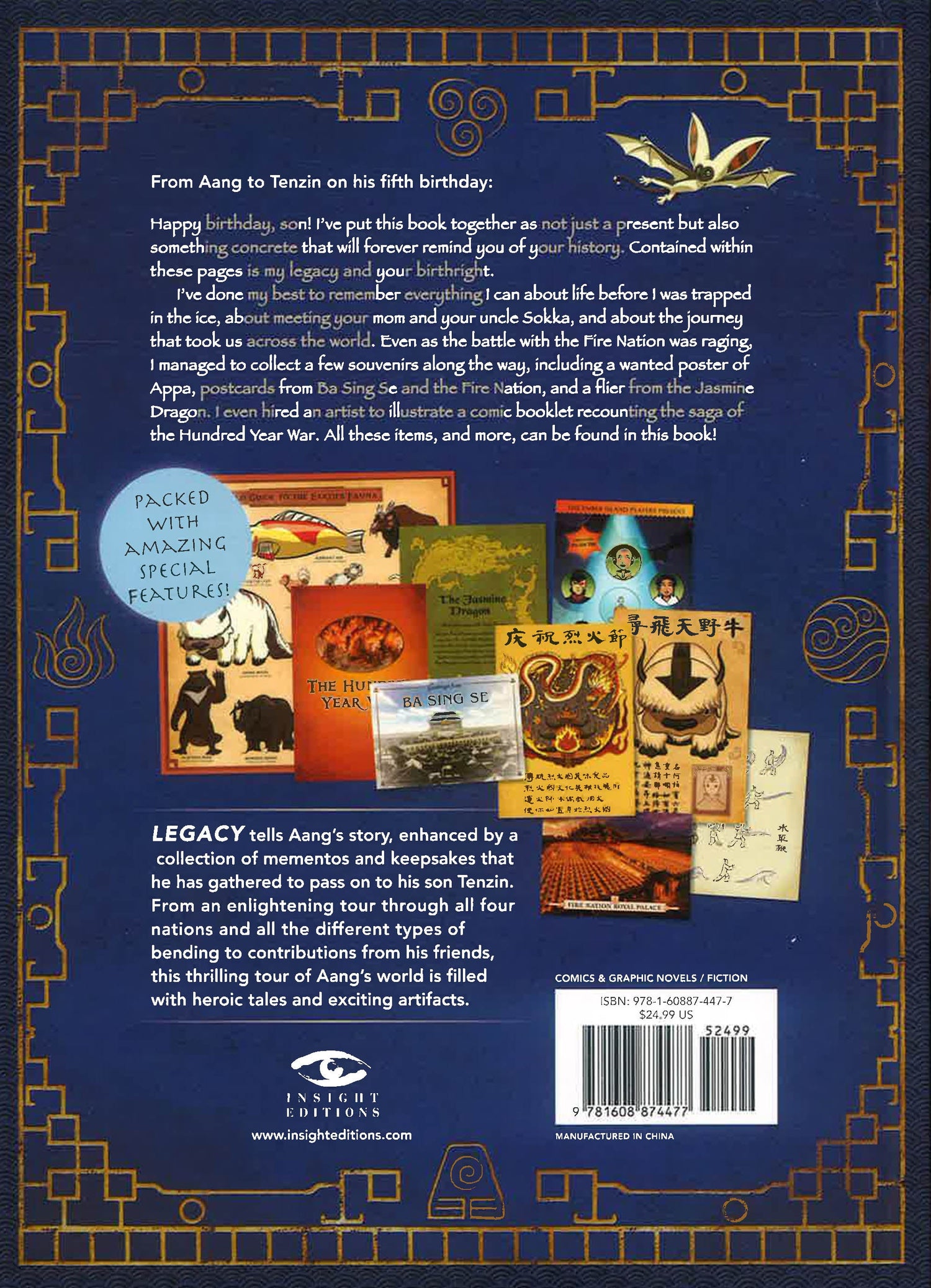 Aang, the much-loved hero of Nickelodeon’s hit animated series Avatar: The Last Airbender, takes readers on an exciting and interactive journey through his thrilling world. Avatar: The Last Airbender: Legacy is a hardcover book published by Insight Edition. It features Aang looking back on his life after the Hundred Year War through stories, along with various mementos such as posters, maps, and cards, a collection which he passes down to his airbending son, Tenzin.