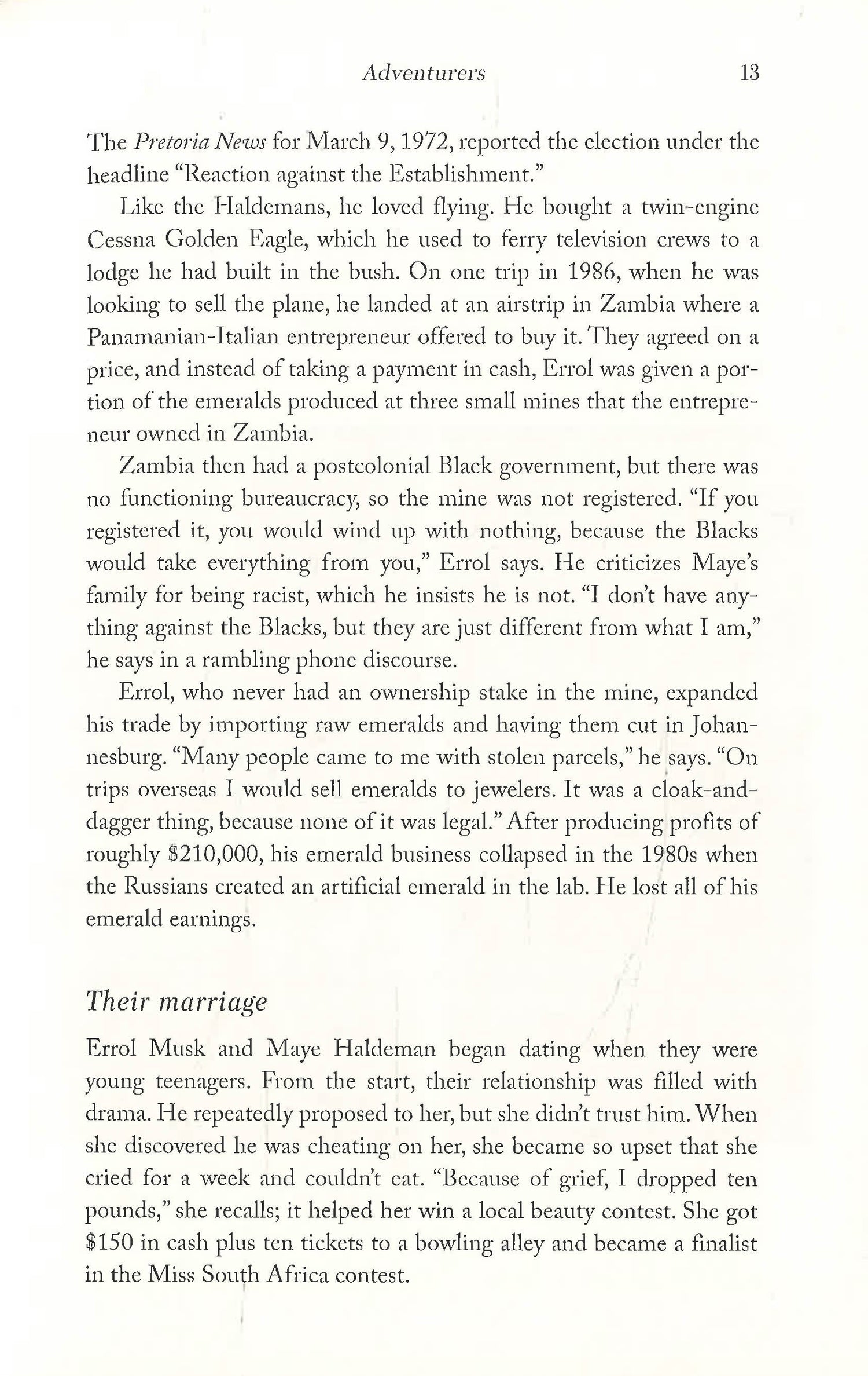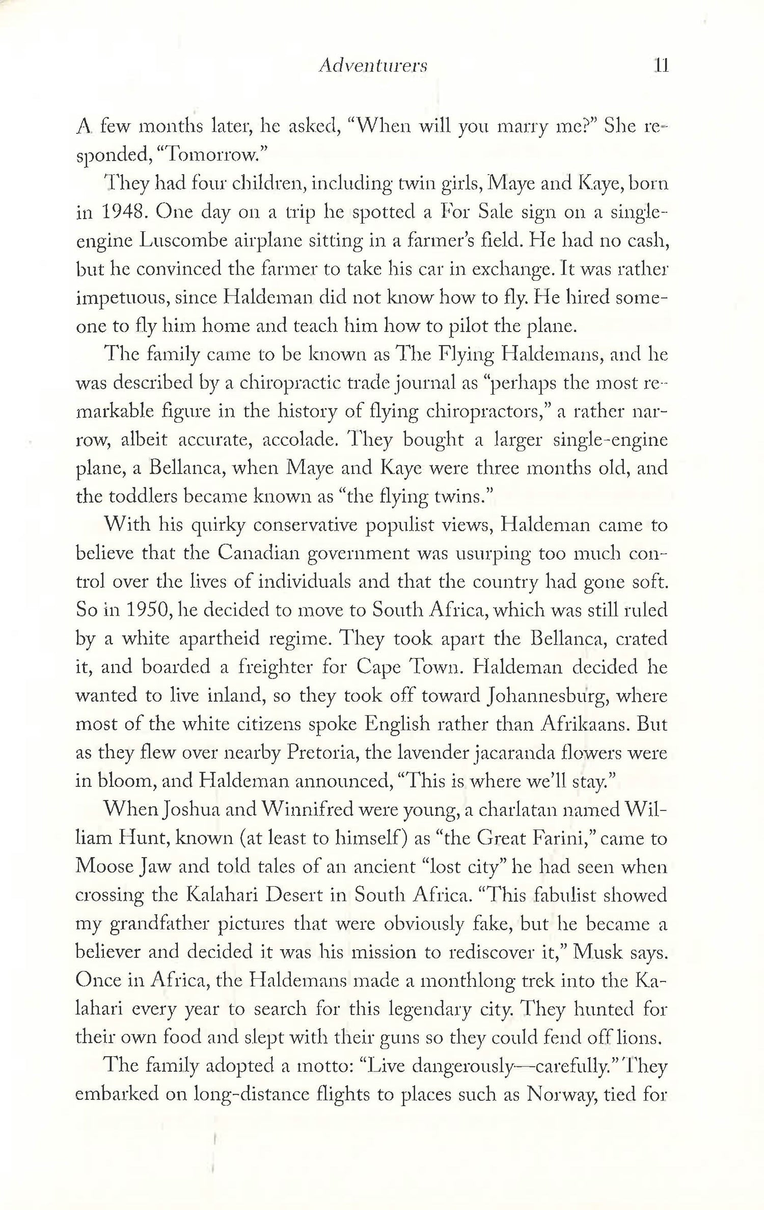 When Elon Musk was a kid in South Africa, he was regularly beaten by bullies. One day a group pushed him down some concrete steps and kicked him until his face was a swollen ball of flesh. He was in the hospital for a week. But the physical scars were minor compared to the emotional ones inflicted by his father, an engineer, rogue, and charismatic fantasist.