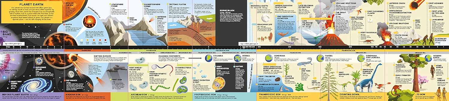 From the Big Bang to the present day, discover the wonders of our ever-changing planet as you fold out this brightly illustrated book. Then turn it over to find out how, through billions of years of volcanic eruptions, ice ages and mass extinctions, life on Earth has emerged.
