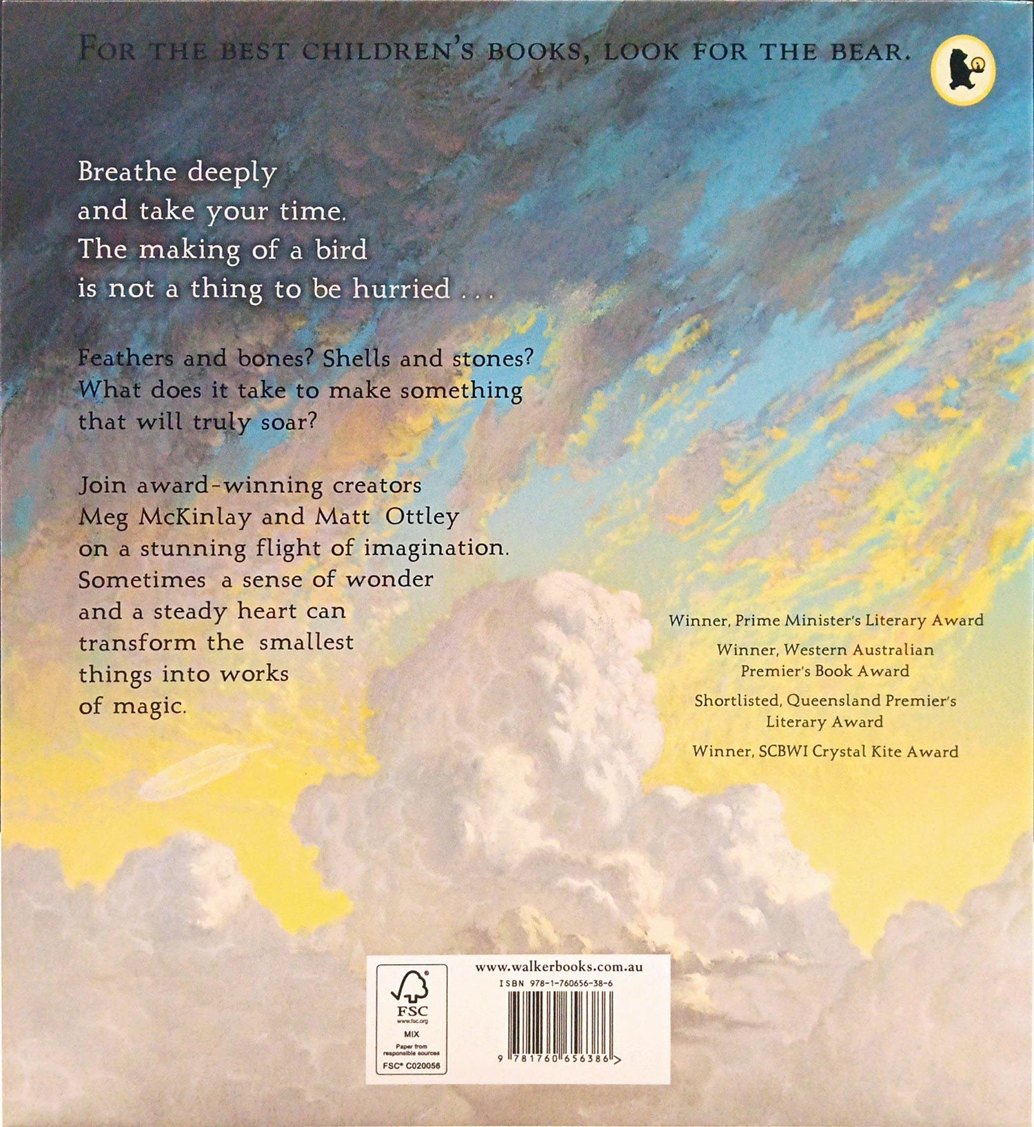 From award-winning author Meg McKinlay and celebrated artist Matt Ottley comes a moving and visually stunning picture book that celebrates the transformative power of the creative process from inception through recognition to celebration and releasing into the world. We shadow the protagonist as she contemplates the blue print of an idea, collects the things that inspire from the natural world to shape a bird. And breathes life into it before letting it fly free. It shows how small things, combined with a little imagination and a steady heart, can transform into works of magic.
