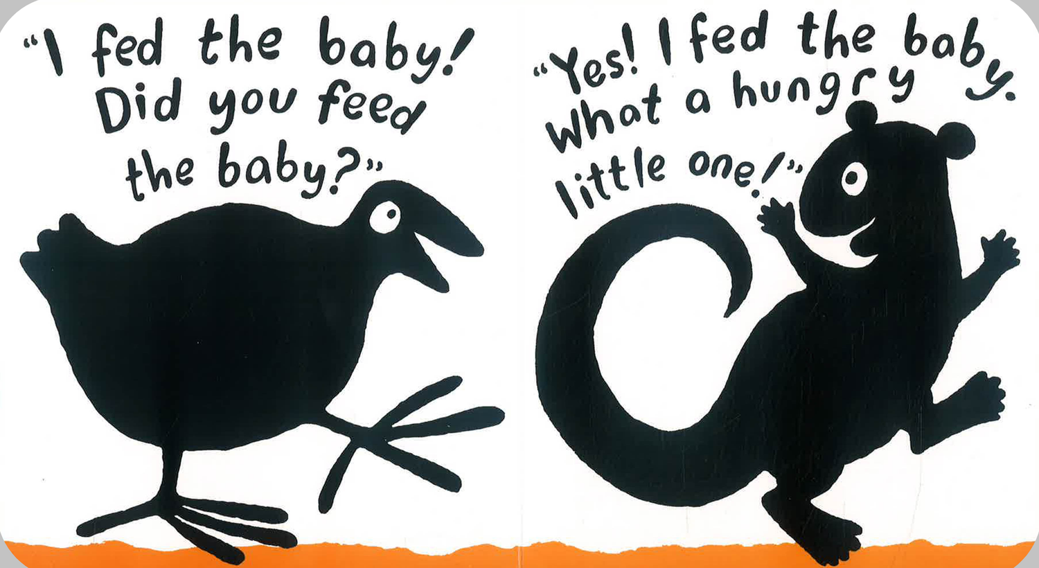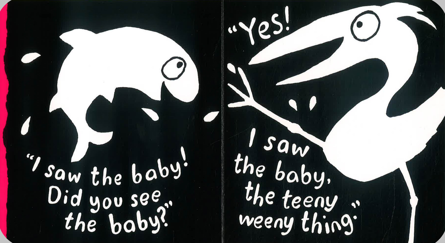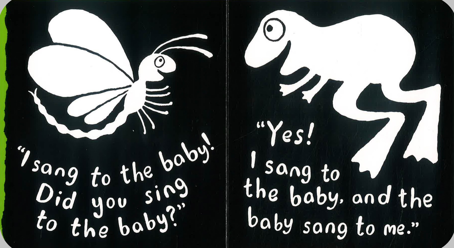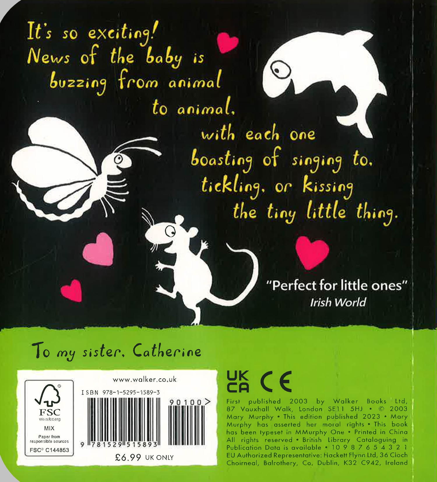 It's so exciting! News of the baby is buzzing from animal to animal, with each one — fish, bird, squirrel, insect, frog — boasting of seeing, feeding, singing to, tickling, and kissing the tiny little thing. With bold, graphic black-and-white illustrations, Mary Murphy's simple, singsong story captures the giddy commotion that only a baby can bring.