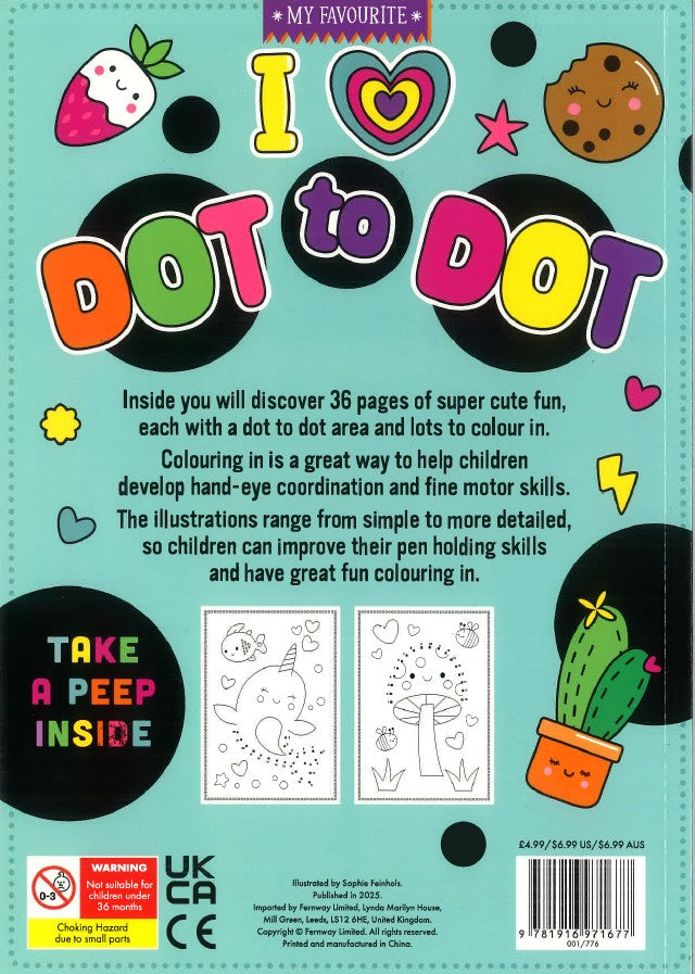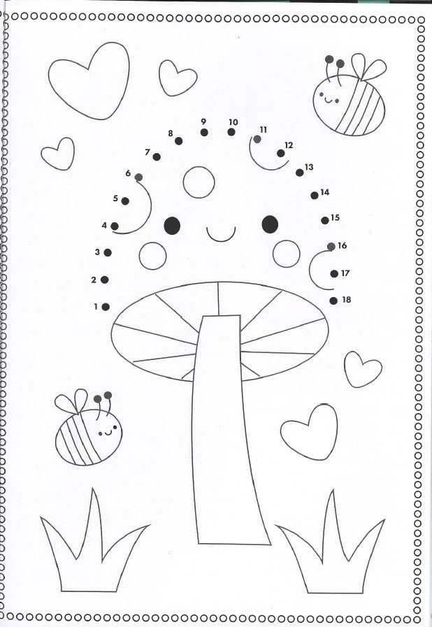 Inside you will discover 36 pages of super cute fun, each with a dot to dot area and lots to colour in. Colouring in is a great way to help children develop hand-eye coordination and fine motor skills.