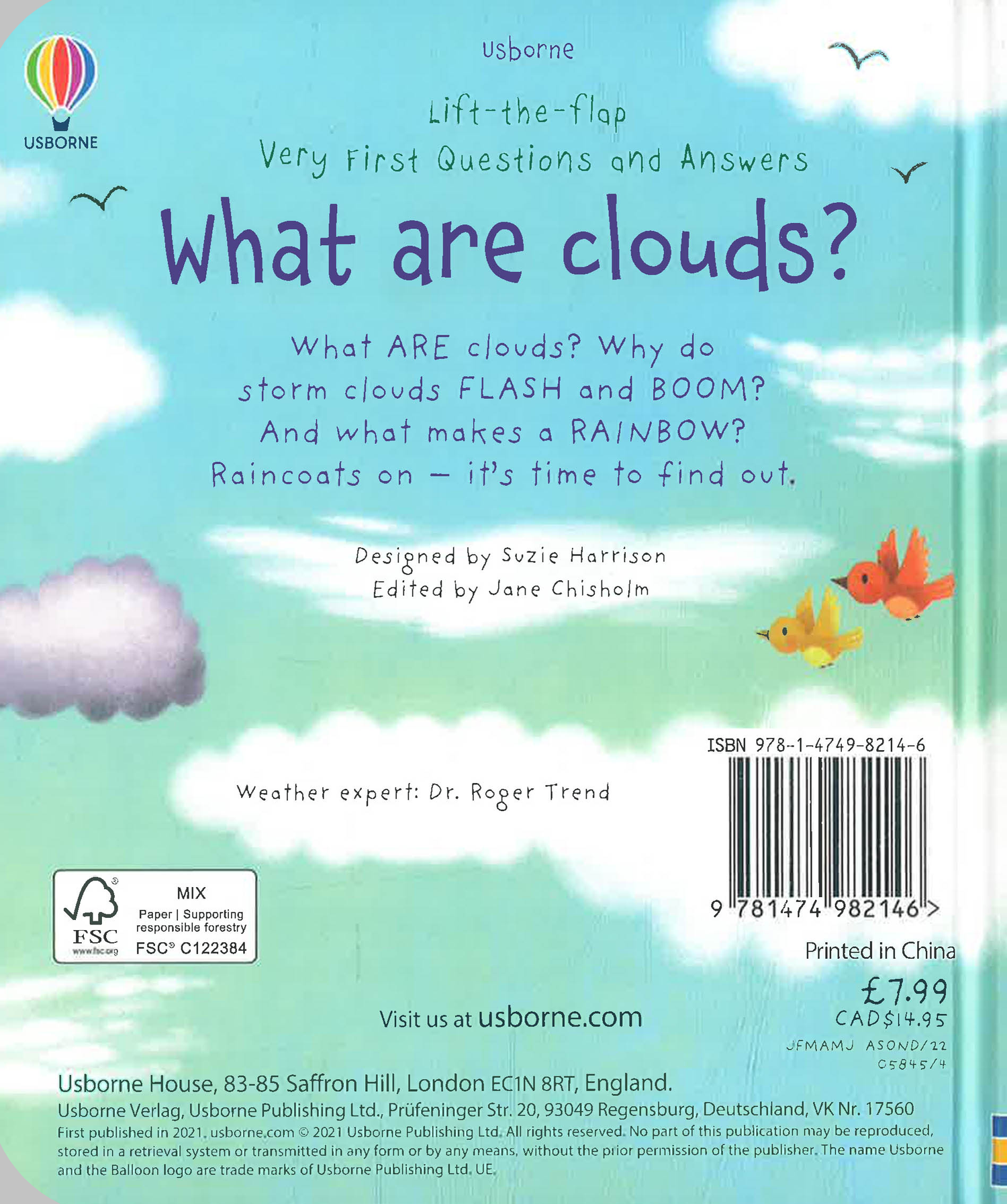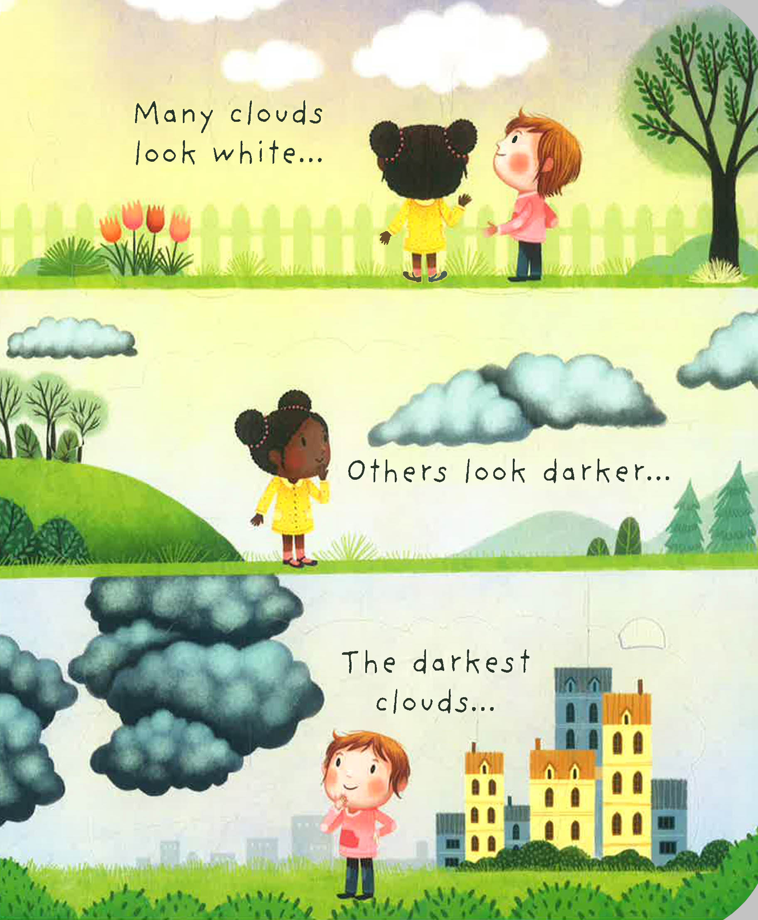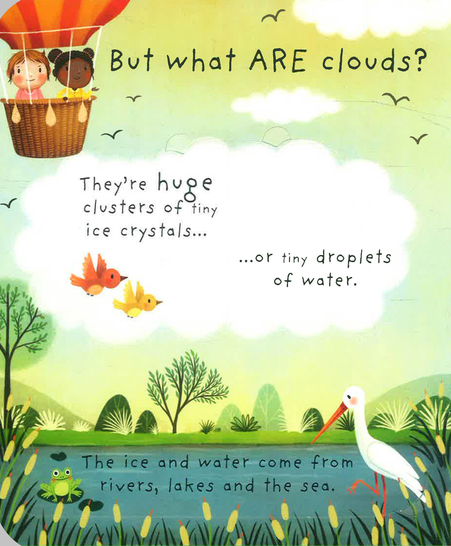 Discover what clouds are made of, why storm clouds flash and boom, how tornadoes happen and what makes a rainbow. With lots of flaps to lift, this delightful book encourages children to explore clouds for themselves, spotting shapes in the sky, looking at the simple science behind them and learning a few cloud myths along the way.