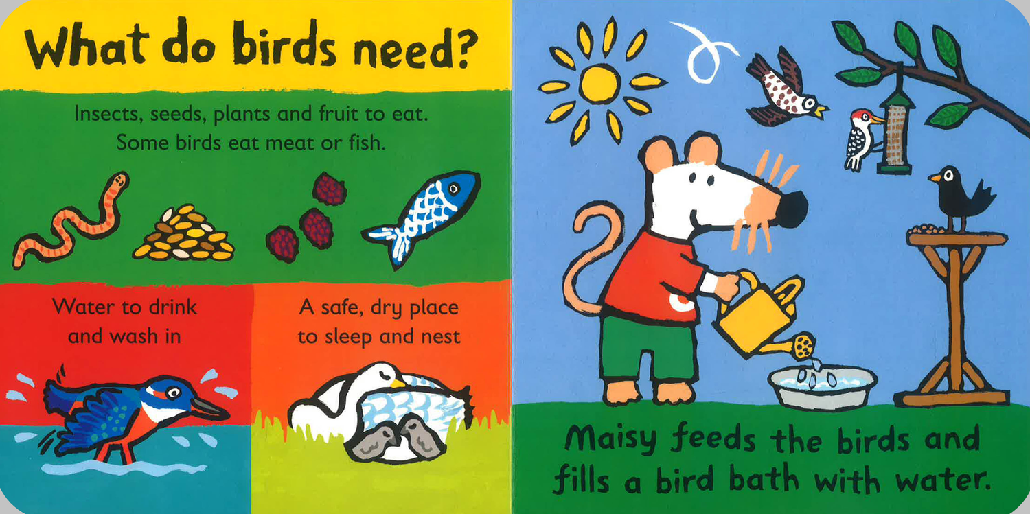 Discover the world of birds with Maisy! This bright and cheerful board book introduces little ones to our feathered friends, from starlings, ducks and robins to soaring seabirds and swooping birds of prey – and even birds that don't fly. Follow Maisy as she finds out what birds need, how they build their nests, where they live, and how we can help them. Open out the final scene to join Maisy and her friends bird-watching!