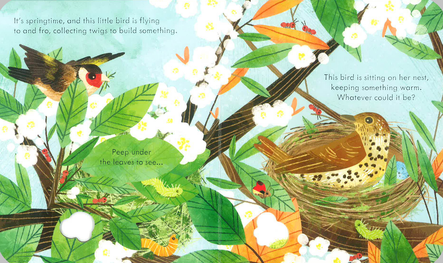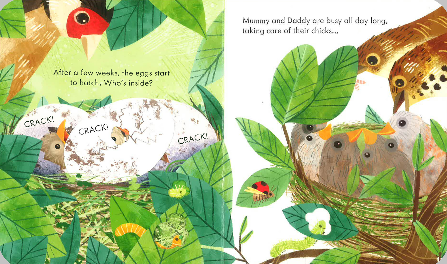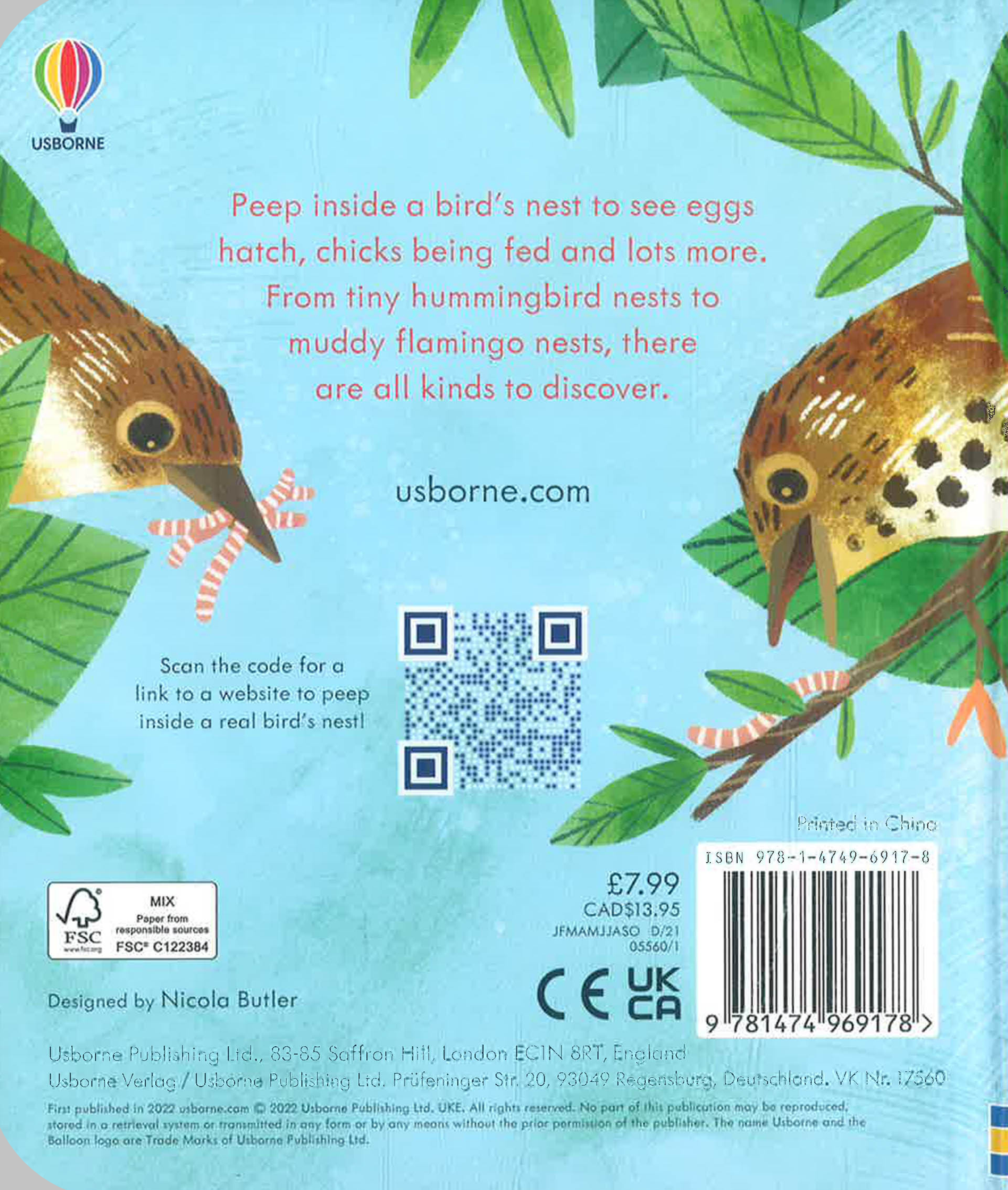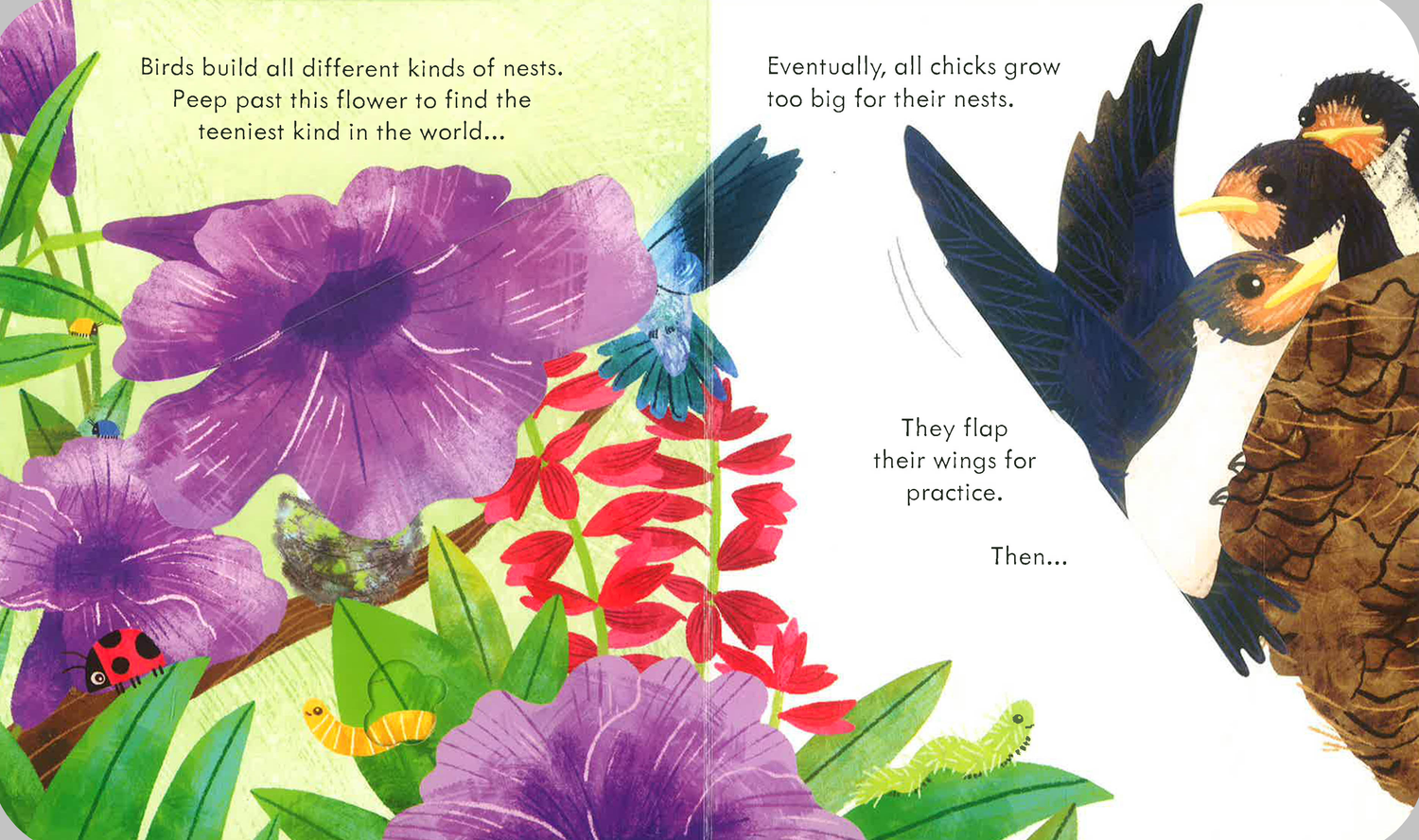 Peep inside a bird's nest to see her precious eggs nestled there. Lift a flap to see them hatch, and find out how a bird takes care of its young. Discover all kinds of different nests and chicks, from teeny-tiny humming birds nests to great big muddy flamingo nests, and even learn how penguins take care of their eggs in the snow without a nest at all.