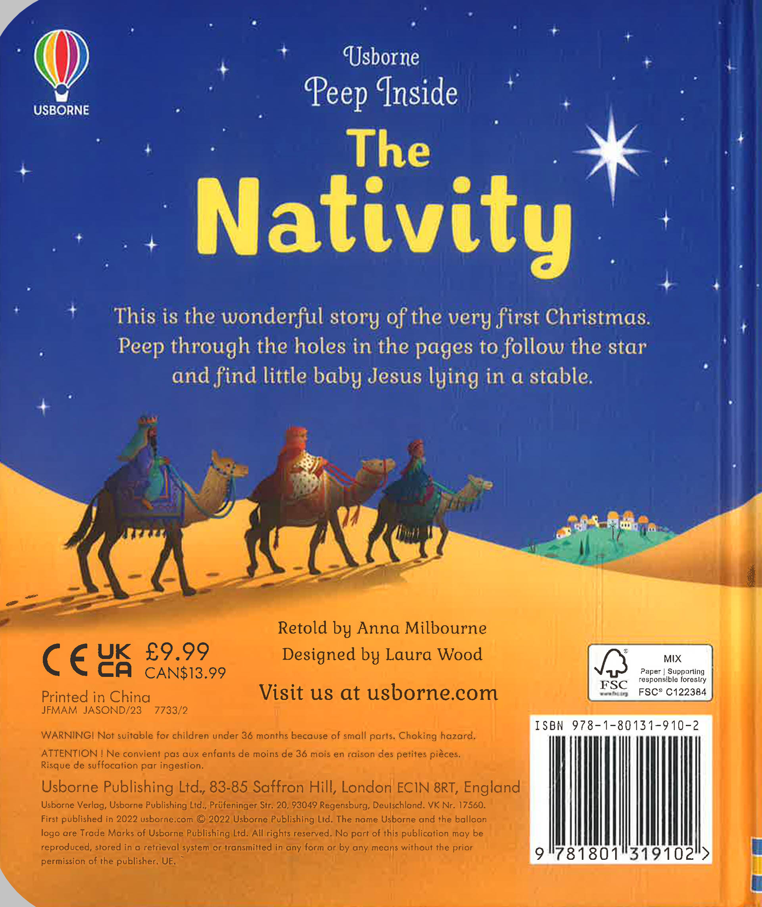This is a book to treasure every Christmas, with stunning cut out peep-holes leading from one entrancing scene to the next - the angel talking to Mary, the journey on the donkey to Bethlehem, to the stable with baby Jesus in the manger, under a magnificent cut-out starry sky. The artwork is is enchanting and atmospheric, from the warm, cosy stable to the golden-winged angels appearing to the shepherds at night. With lots to talk about, this lovely edition will engage small children in the original Bible story and the true meaning of Christmas.