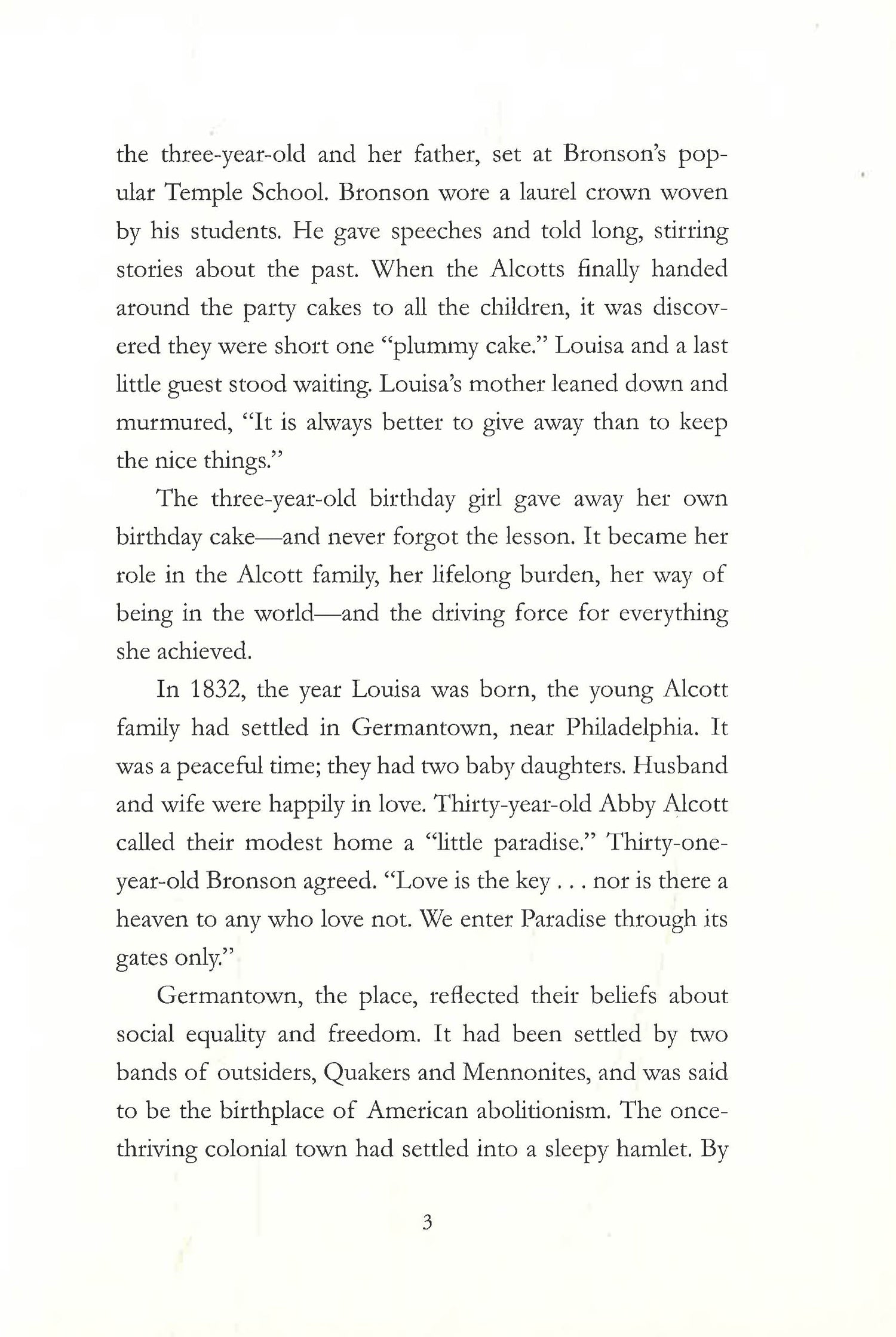 Drawing on the surviving journals and letters of Louisa and her family and friends, author and poet Liz Rosenberg reunites Louisa May Alcott with her most ardent readers. In this warm and sometimes heartbreaking biography, Rosenberg delves deep into the oftentimes secretive life of a woman who was ahead of her time, imbued with social conscience, and always moving toward her future with a determination that would bring her fame, tragedy, and the realization of her biggest dreams.