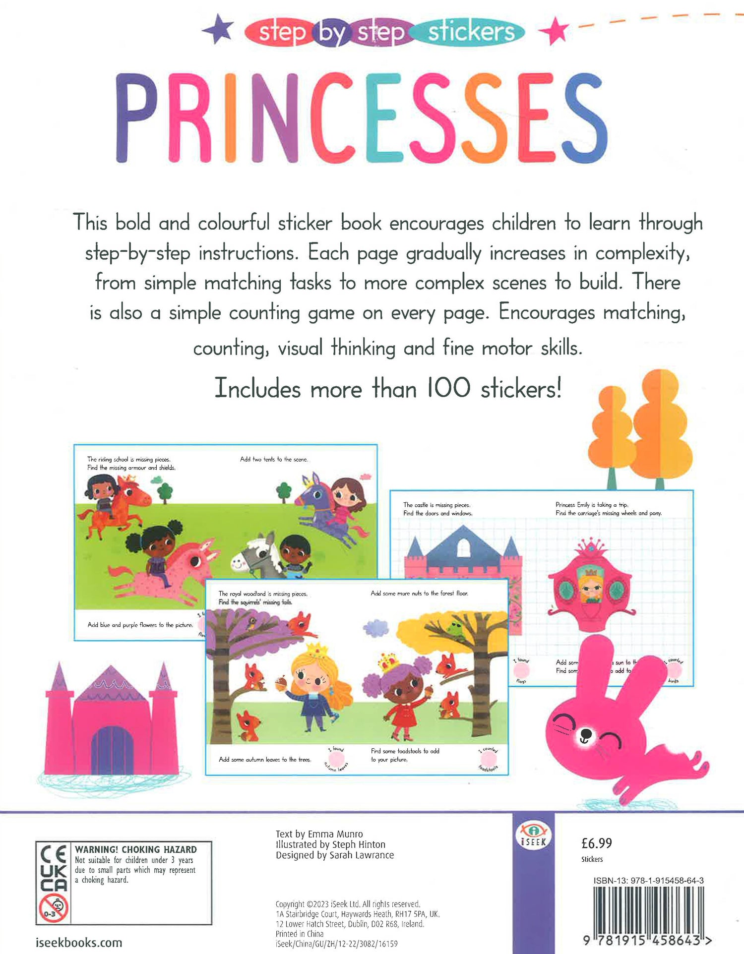 These bold and colourful books ask pre-school children to pick stickers to match the missing bits in pictures. The last pages of each book have illustrated backgrounds for children to create whole sticker scenes. There is also a counting game on each page. • Ever popular themes • Encourage matching, counting, visual thinking and fine motor skills. • More than 150 stickers