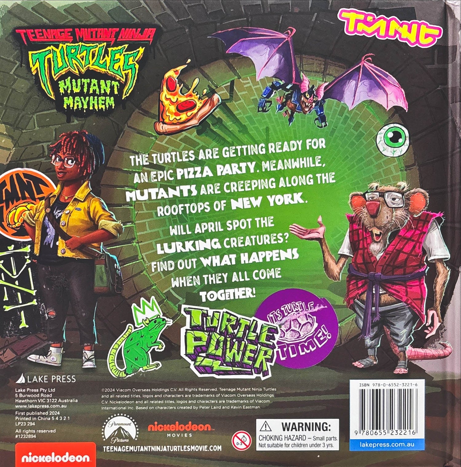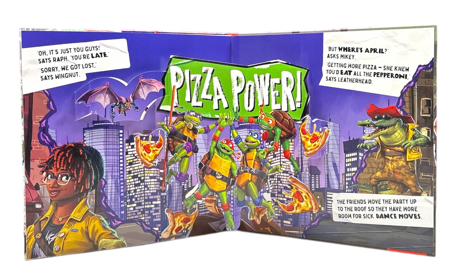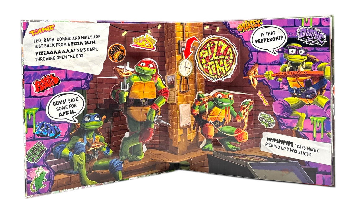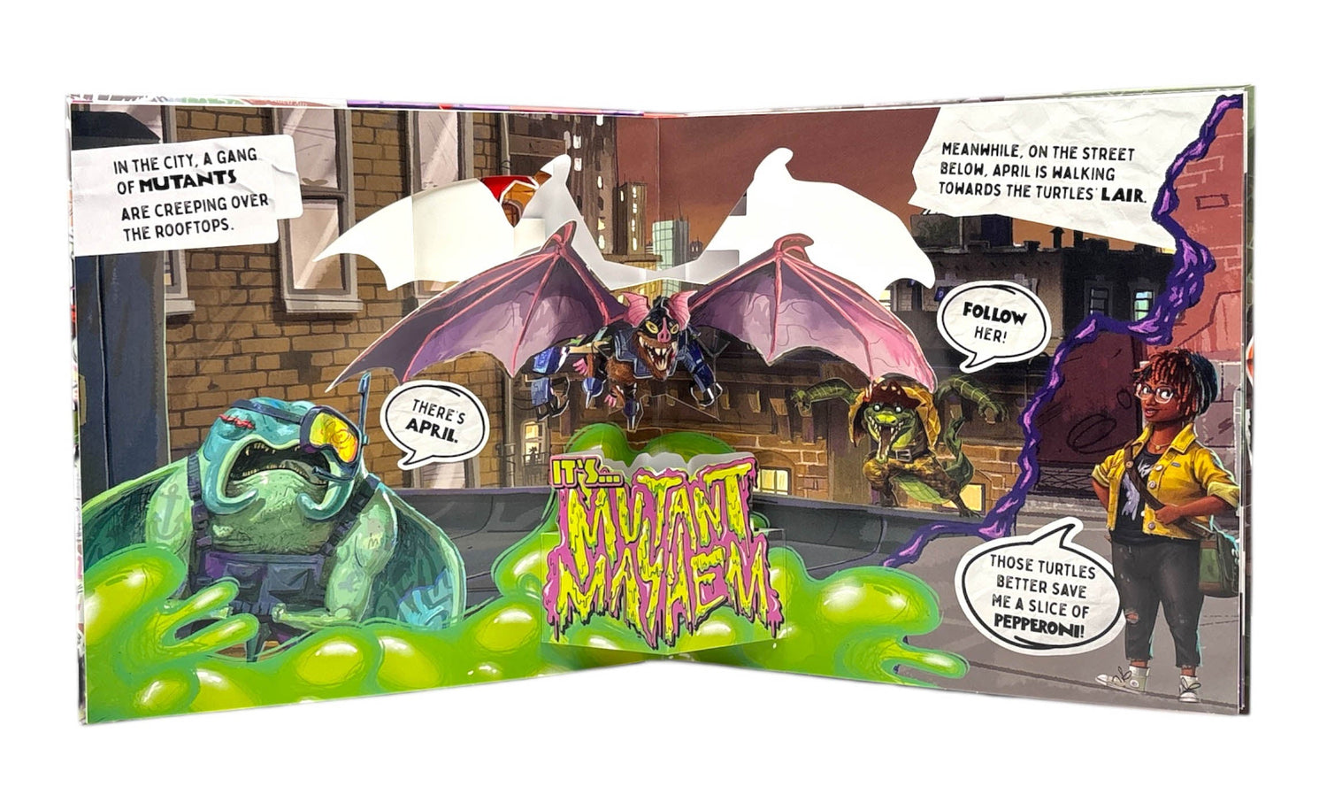 Join the gnarliest gang of Turtles in this action-packed pop-up book! Raph, Mikey, Donny and Leo are planning a pizza party with April, but there is a gang of mutants loose in the city. Will the team have to fight to save the pizza? Leap into the sewers of New York to find out. Each page includes a turtely rad pop-up featuring cool TMNT characters.