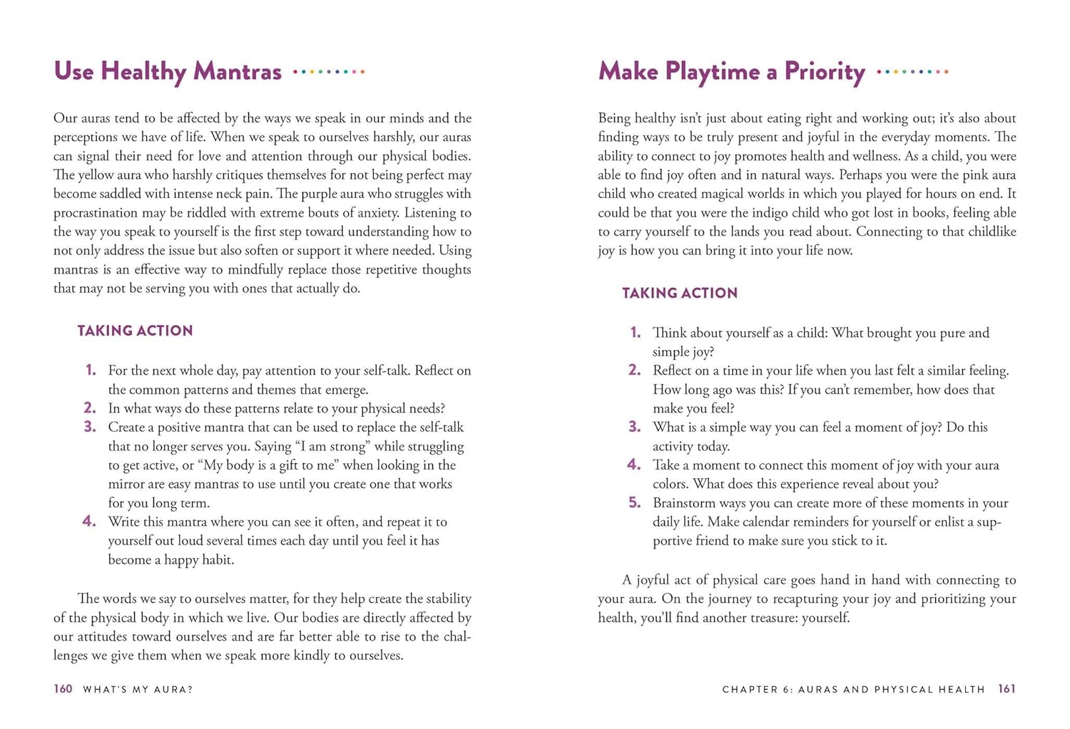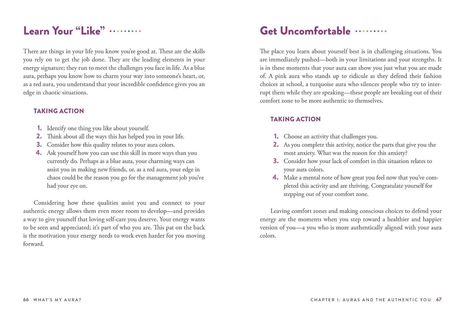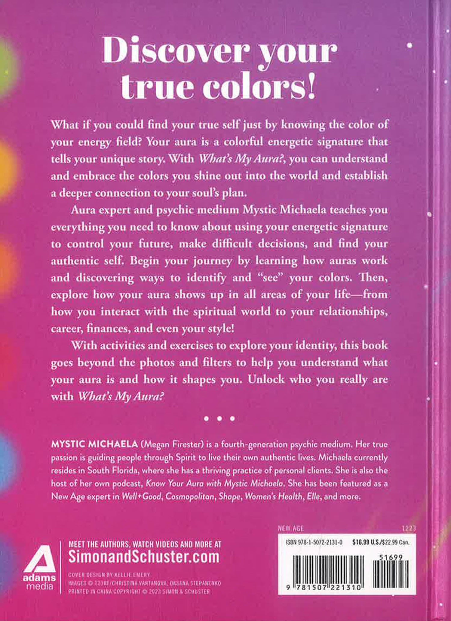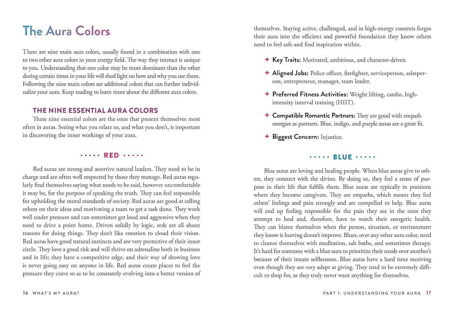 In What’s My Aura?, aura expert and psychic to the stars Mystic Michaela teaches you everything you need to know to “see” and identify your aura colors and to learn what each color means and how they represent different personality traits. She provides insight about how these aura colors show up in all aspects of your life, from how you interact with the spiritual world to how you communicate with the people around you—and even in your personal style.