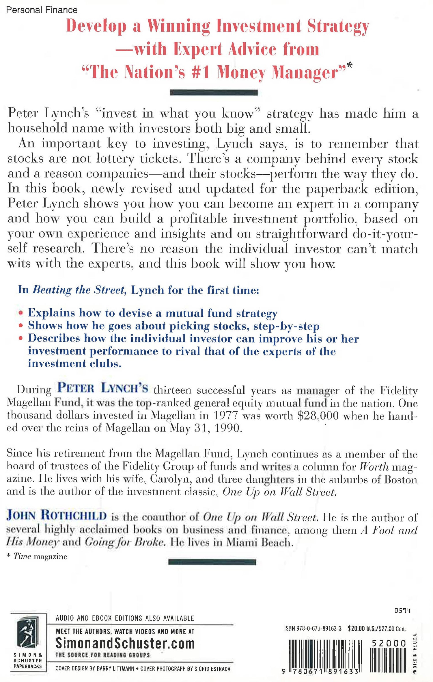 In Beating the Street, Lynch for the first time explains how to devise a mutual fund strategy, shows his step-by-step strategies for picking stock, and describes how the individual investor can improve his or her investment performance to rival that of the experts.