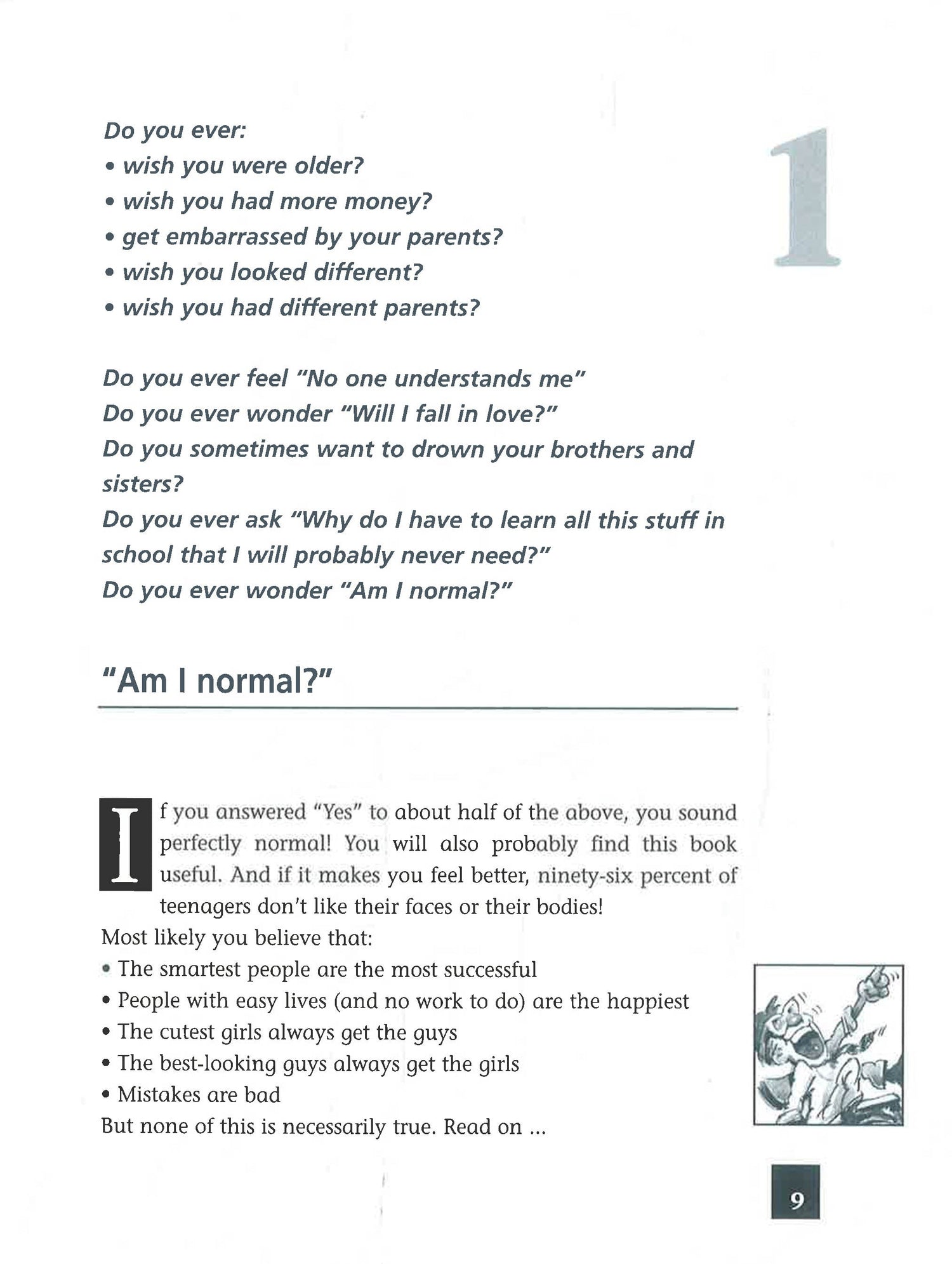 Do you ever wish... you were older? You had more money? You looked different? You had different parents? Do you ever feel, No one understands me! Do you ever wonder, will I fall in love? Do you ever ask, am I normal? If you answered yes to half of the above, you sound perfectly normal. You will also find this book useful!