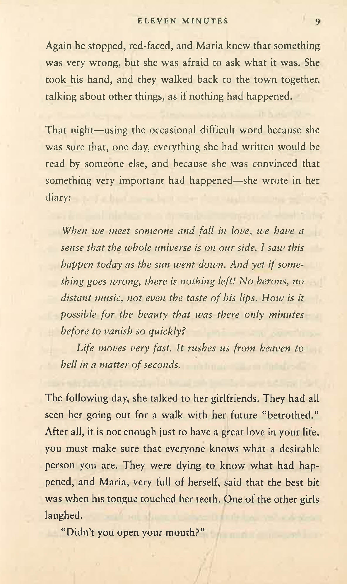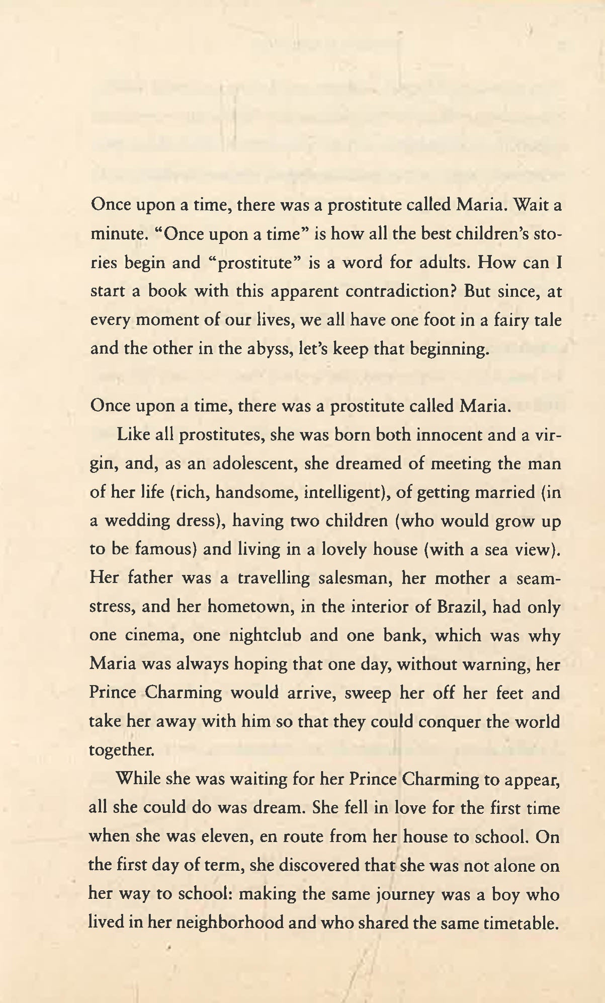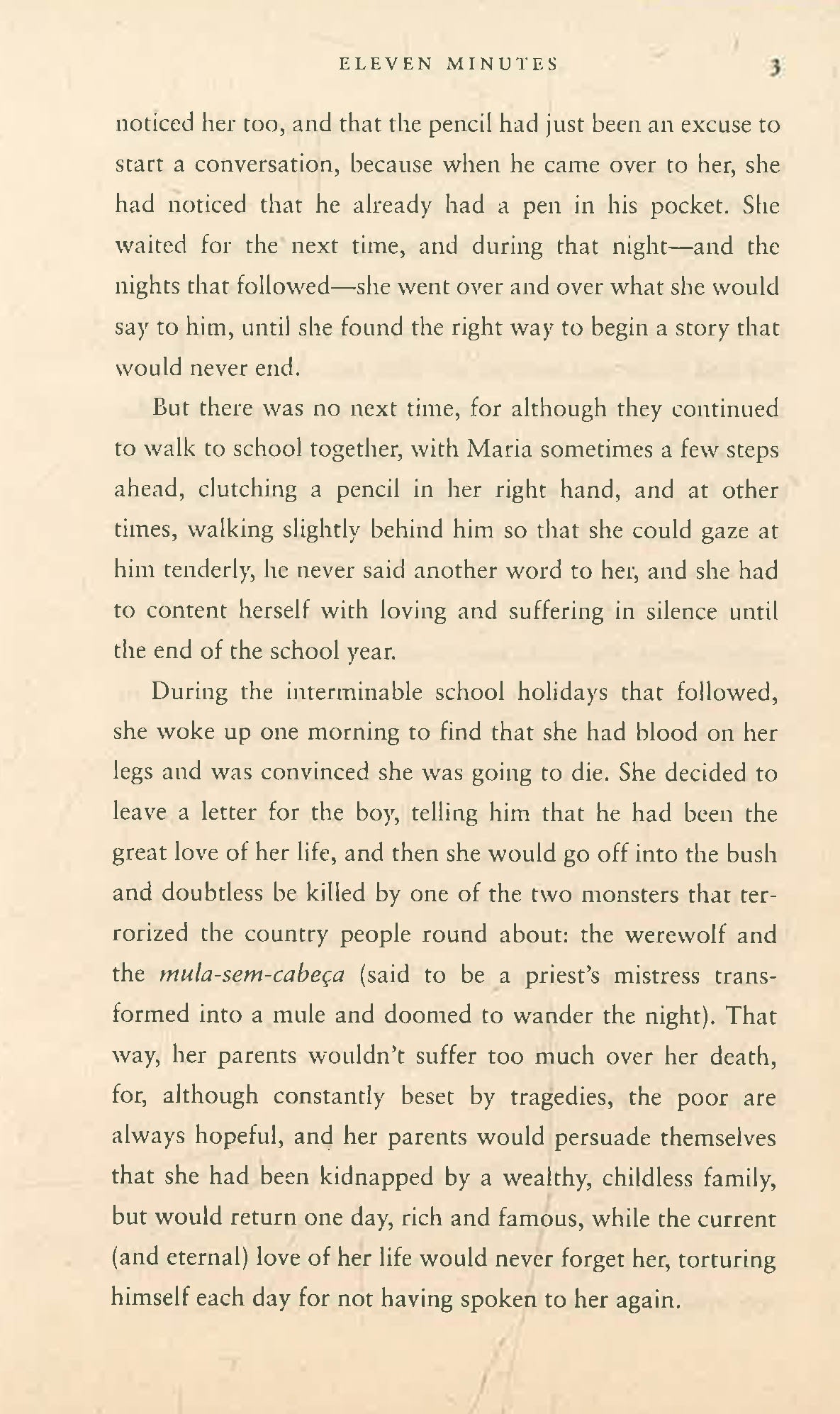 Eleven Minutes tells the story of Maria, a young girl from a Brazilian village whose first innocent brushes with love leave her heartbroken. At a tender age, she becomes convinced that she will never find true love, instead believing that “love is a terrible thing that will make you suffer.” A chance meeting in Rio takes her to Geneva, where she dreams of finding fame and fortune, yet ends up working as a prostitute.