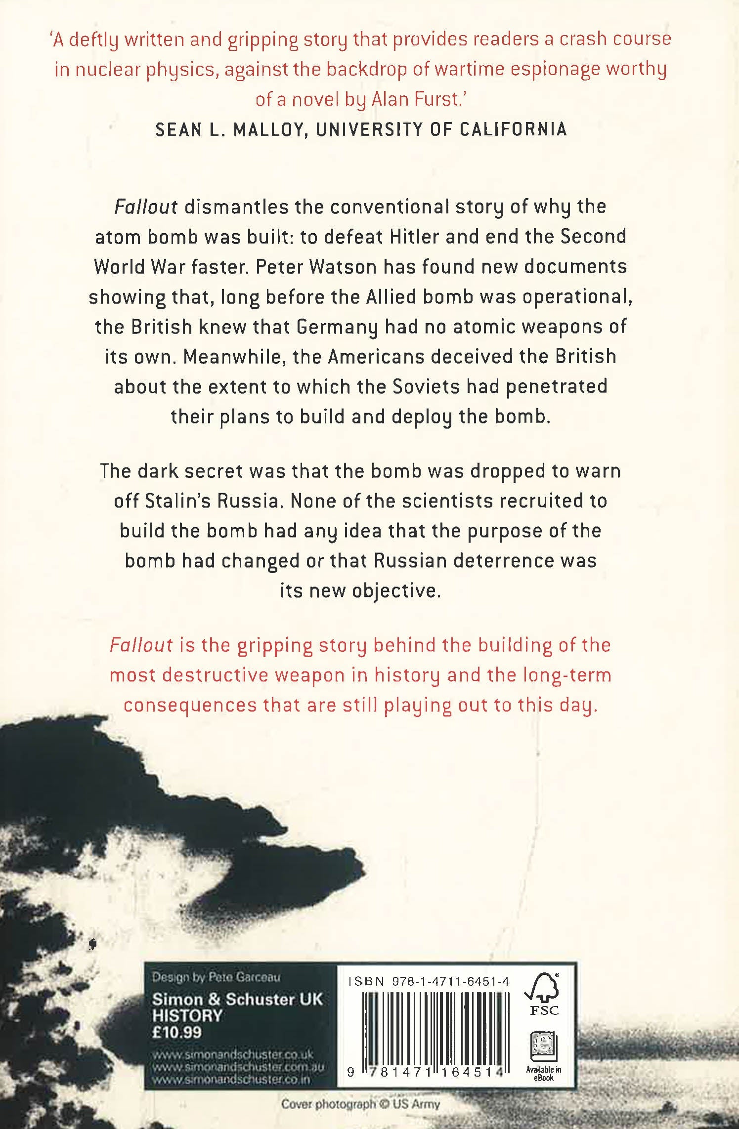 Fallout proves that the atomic bomb was not needed, and was made as a result of a series of flawed decisions. The Americans did not tell the UK that the atomic research was compromised by Soviet spies; the British did not tell the Americans that in 1943 they knew for sure that Germany did not have a nuclear bomb program. Neither country admitted to the scientists developing the bomb that it would never be used to counter the (non-existent) German nuclear threat. Had the scientists known, many of them would have refused to complete work on the bomb.