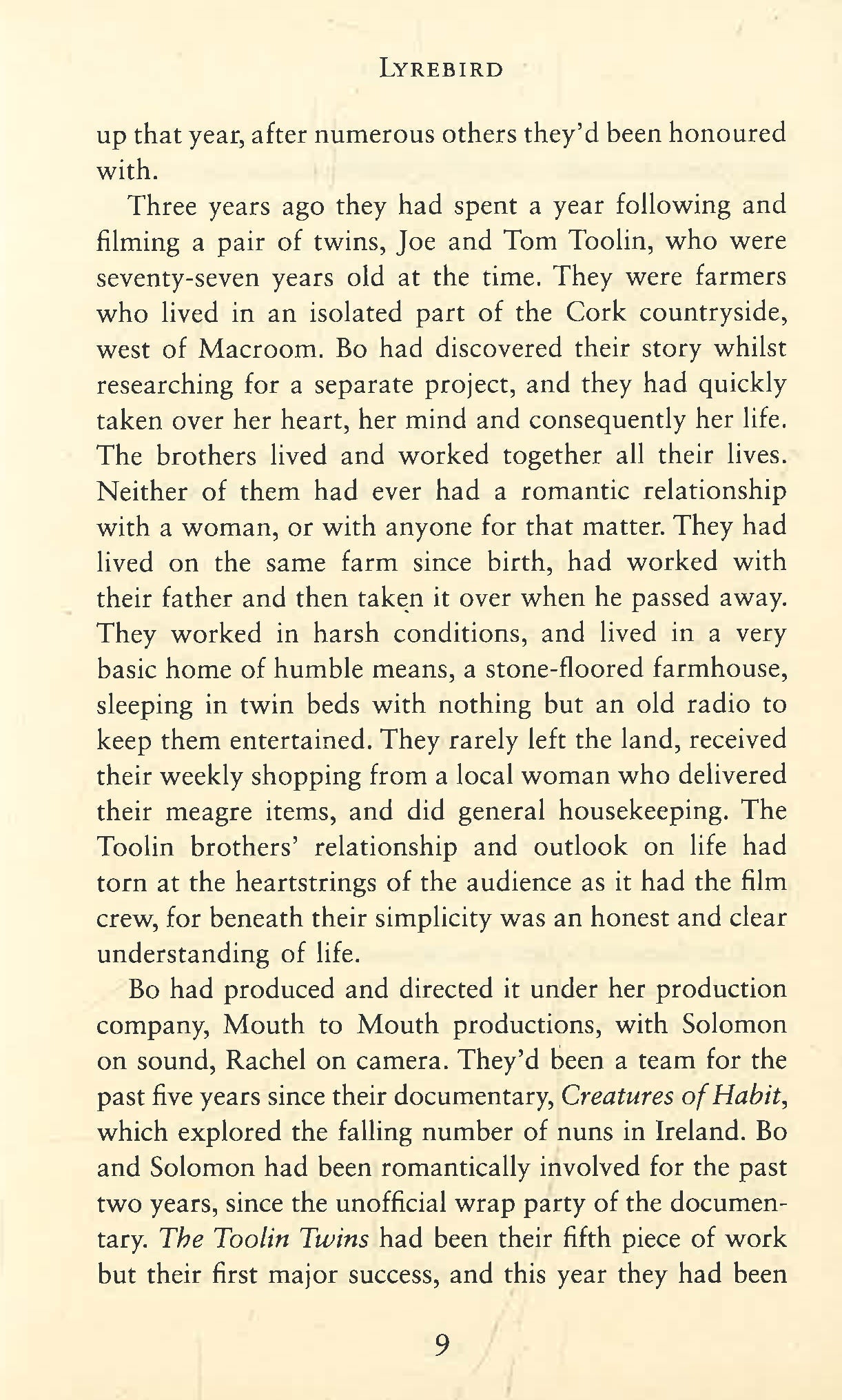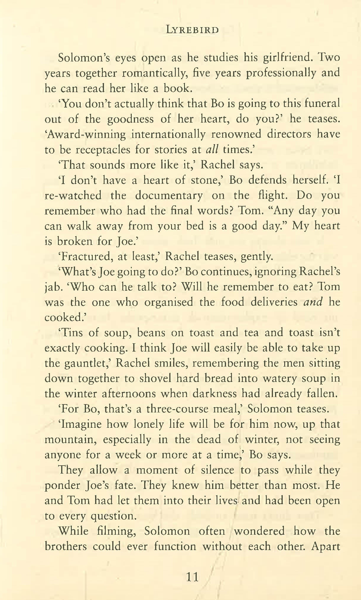 Lyrebird is a thoughtful, deeply moving love story; a story of the wild heart in us all and the quiet that lies underneath the world’s noise.