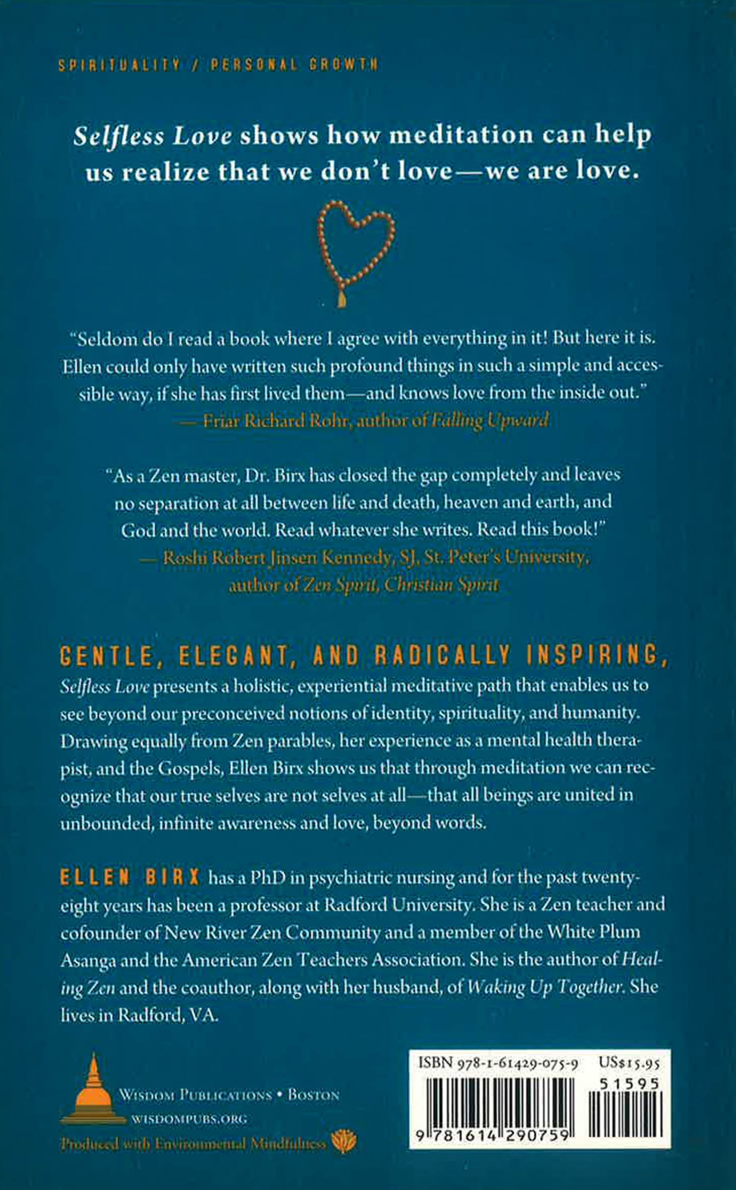 Gentle, elegant, and radically inspiring, Selfless Love presents a holistic, experiential meditative path that enables us to see beyond our preconceived notions of identity, spirituality, and humanity. Drawing equally from Zen parables, her experience as a mental health therapist, and the Gospels, Ellen Birx shows us that through meditation we can recognize that our true selves are not selves at all—that all beings are united in unbounded, infinite awareness and love, beyond words.