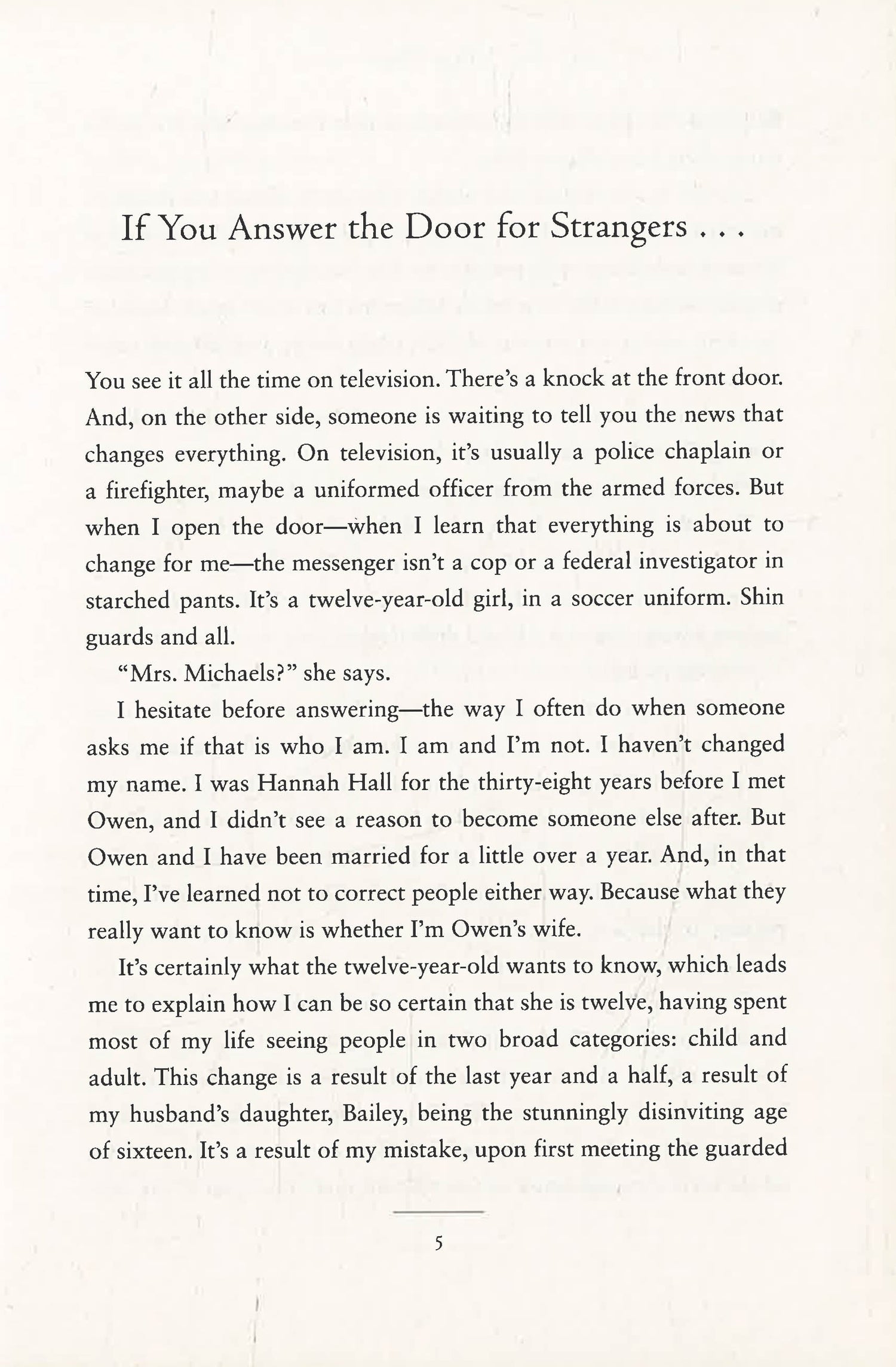 Before Owen Michaels disappears, he smuggles a note to his beloved wife of one year: Protect her. Despite her confusion and fear, Hannah Hall knows exactly to whom the note refers—Owen’s sixteen-year-old daughter, Bailey. Bailey, who lost her mother tragically as a child. Bailey, who wants absolutely nothing to do with her new stepmother.
