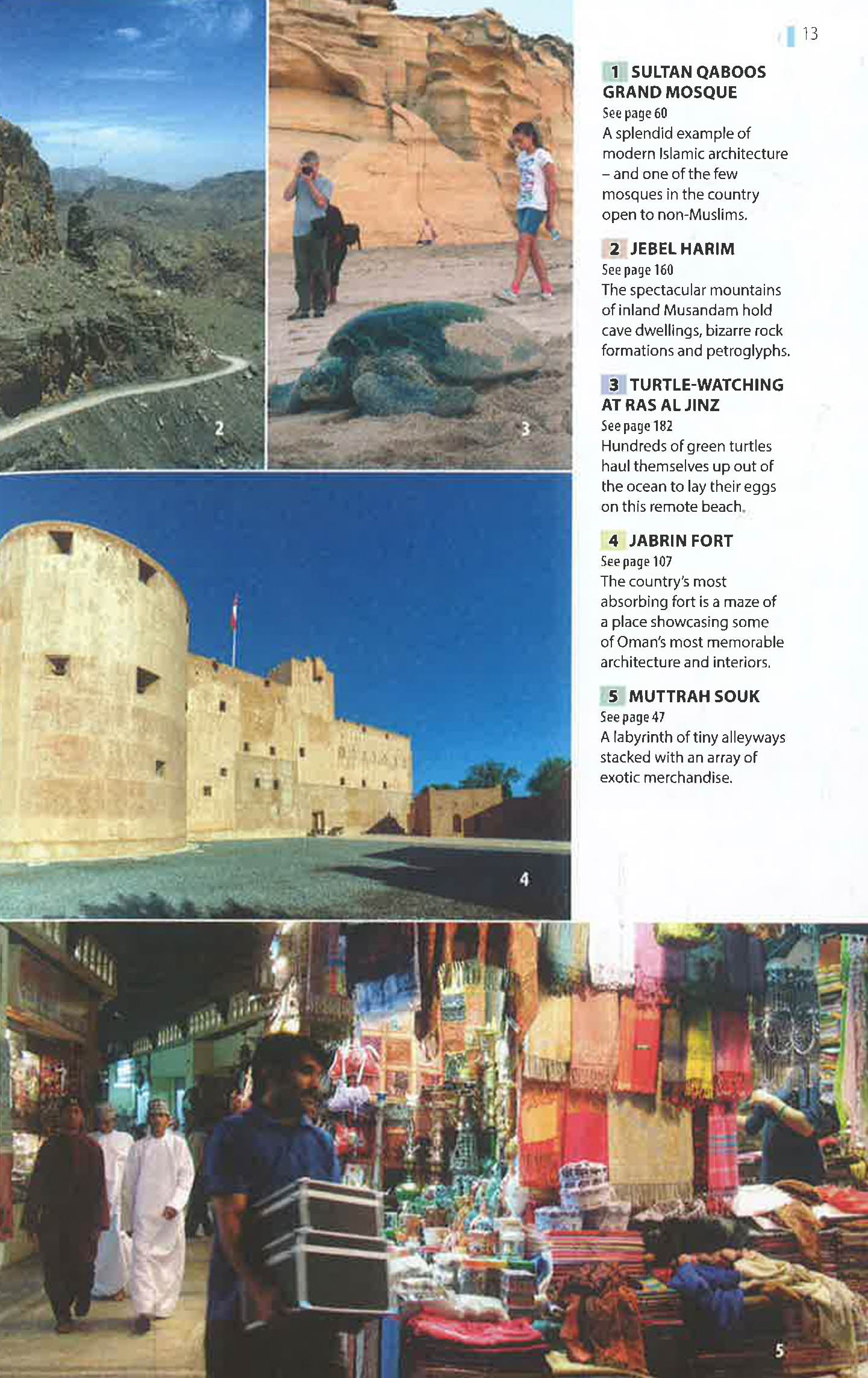 Attractions include: Sultan Qaboos Mosque; Jebel Shams; Jabrin Fort; Khor ash Sham; Jebel Harim; Ras al Jinz; Wahiba Sands; souks; wadis.