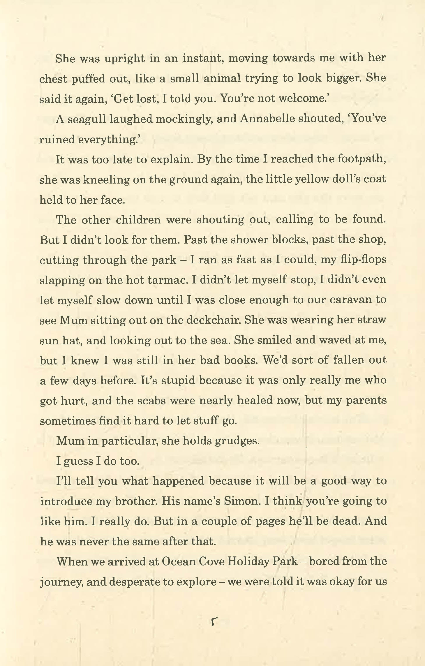‘I’ll tell you what happened because it will be a good way to introduce my brother. His name’s Simon. I think you’re going to like him. I really do. But in a couple of pages he’ll be dead. And he was never the same after that.’