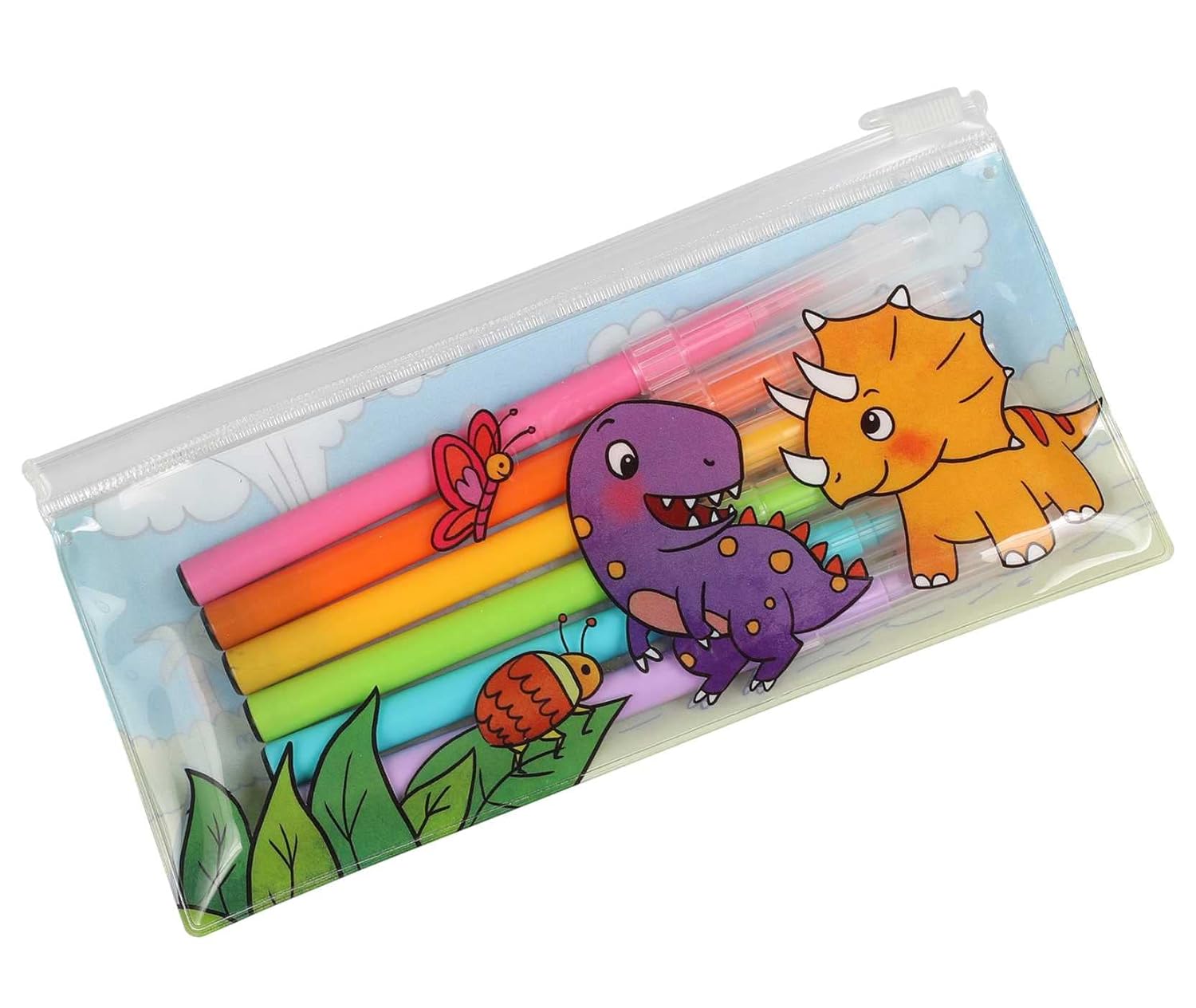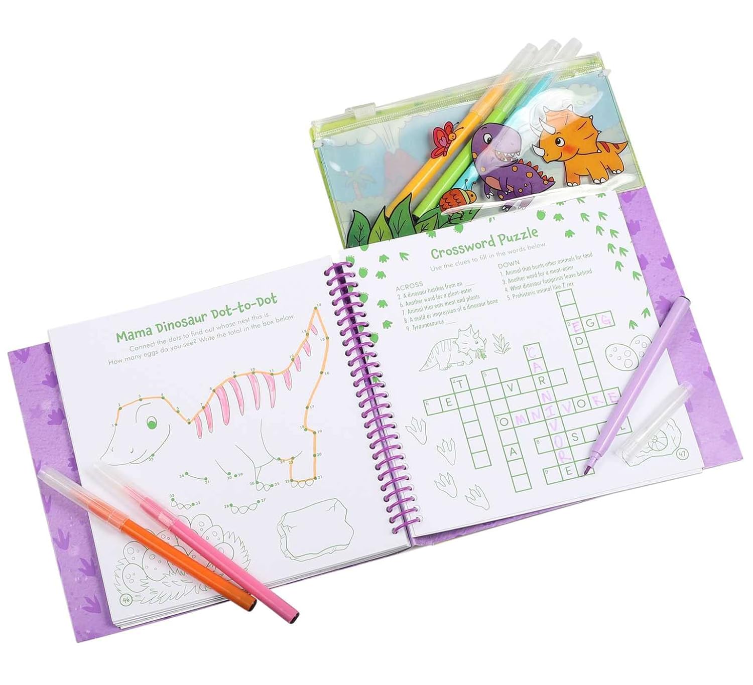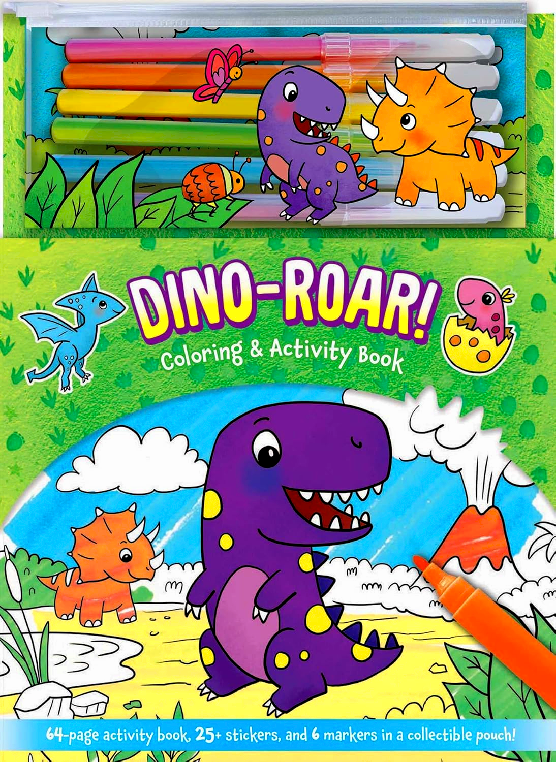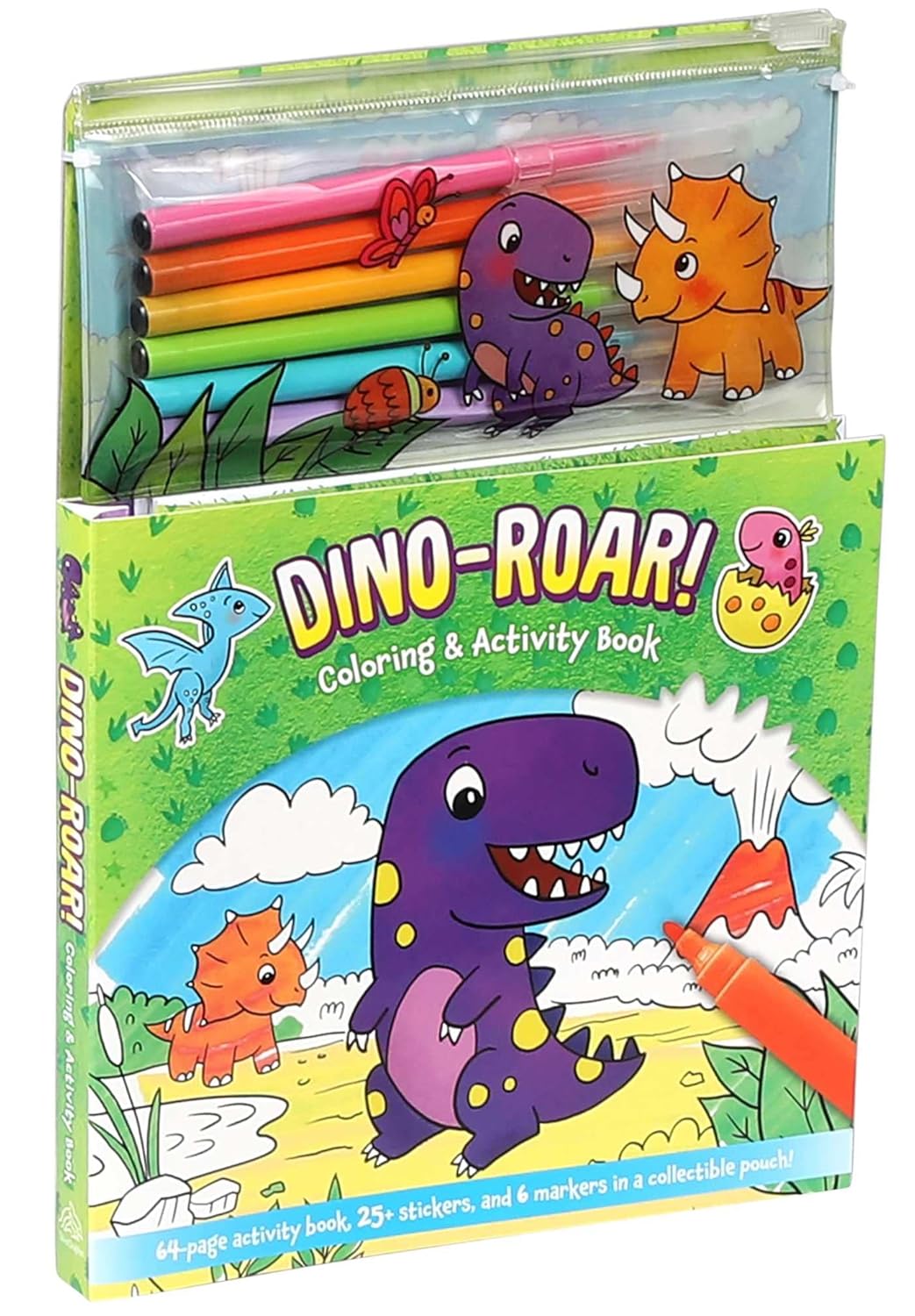 This jam-packed, dino-themed coloring and activity book includes 6 markers, more than 25 adorable stickers, and a removable pouch!