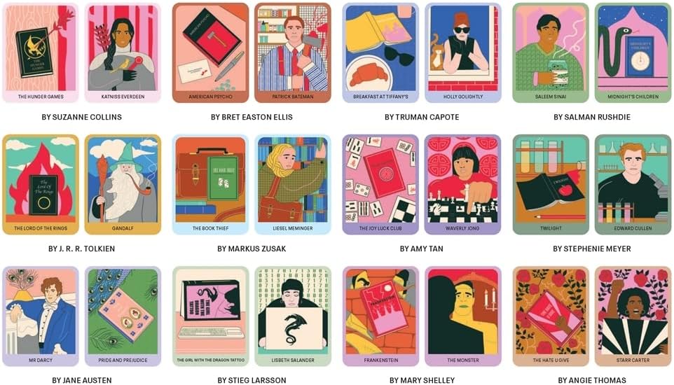 Featuring books such as Pride and Prejudice, To Kill a Mockingbird, Breakfast at Tiffany's, The Hunger Games, Twilight, The Hound of the Baskervilles, Little Women, The Lord of the Rings, American Psycho, A Game of Thrones, The Girl with the Dragon Tattoo, IT, Great Expectations, Beloved, Frankenstein, Where the Wild Things Are, Midnight's Children, The Outsiders, The Hate U Give, The Book Thief, High Fidelity, White Teeth and The Joy Luck Club.