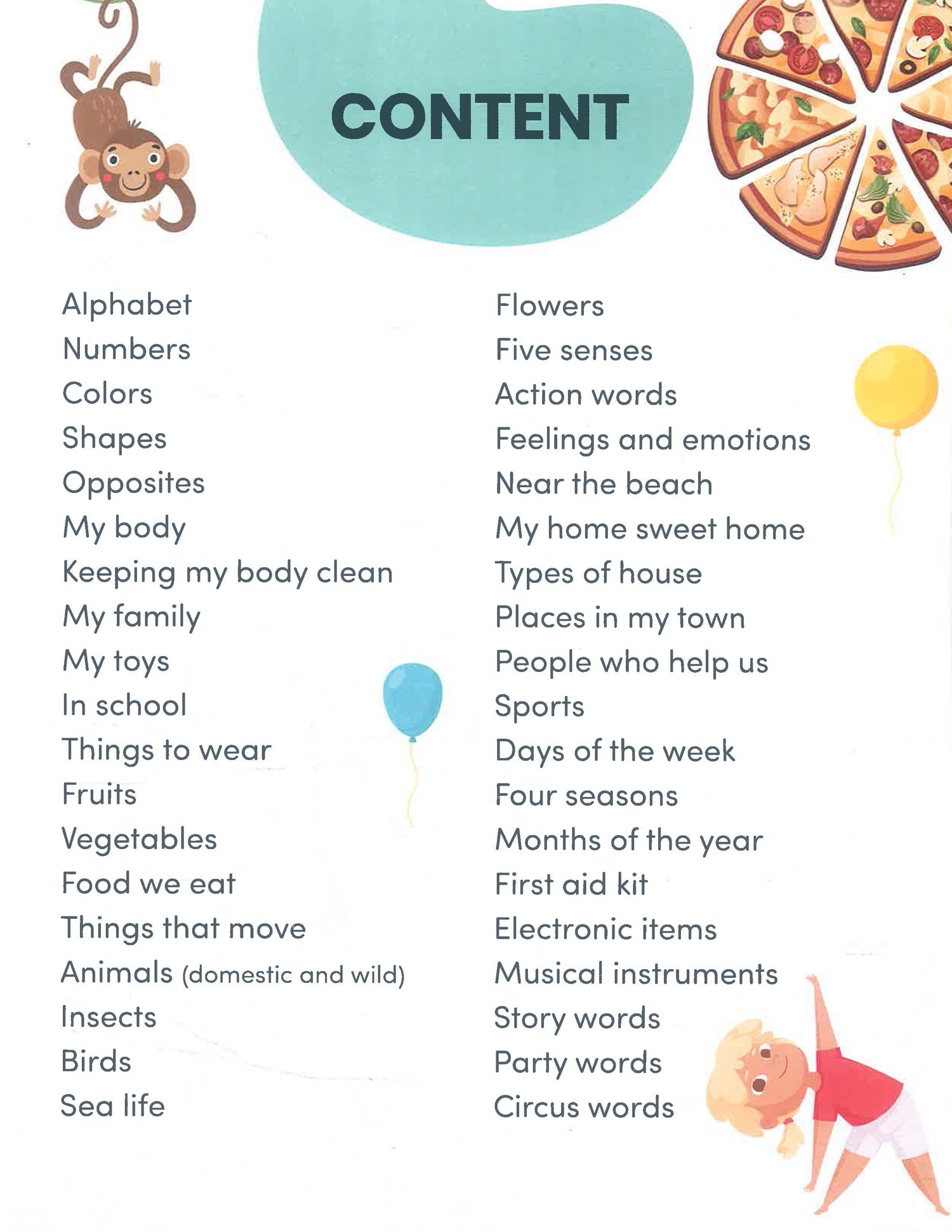 alphabet, numbers, colors, shapes, opposites, food, flowers, transport, family, animals, seasons, parts of the body. safety, sports, action words